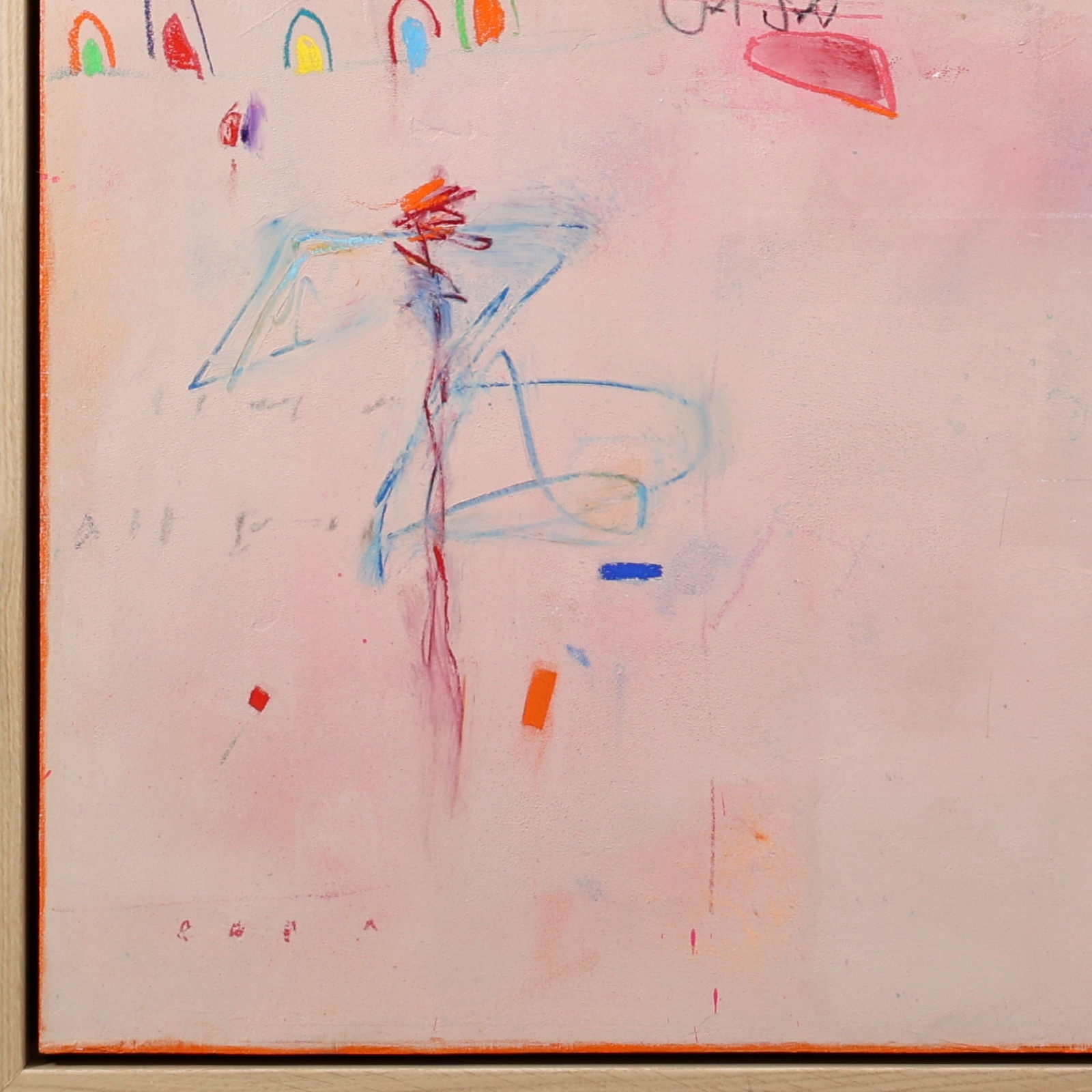 Playful abstract painting by Spanish artist Manel employing mixed techniques that combine various materials: acrylics, oils, charcoal, ink, and natural pigments, applied in subtle layers to play with textures and transparencies. Presented in a stylish contemporary oak frame as shown and ready to hang.