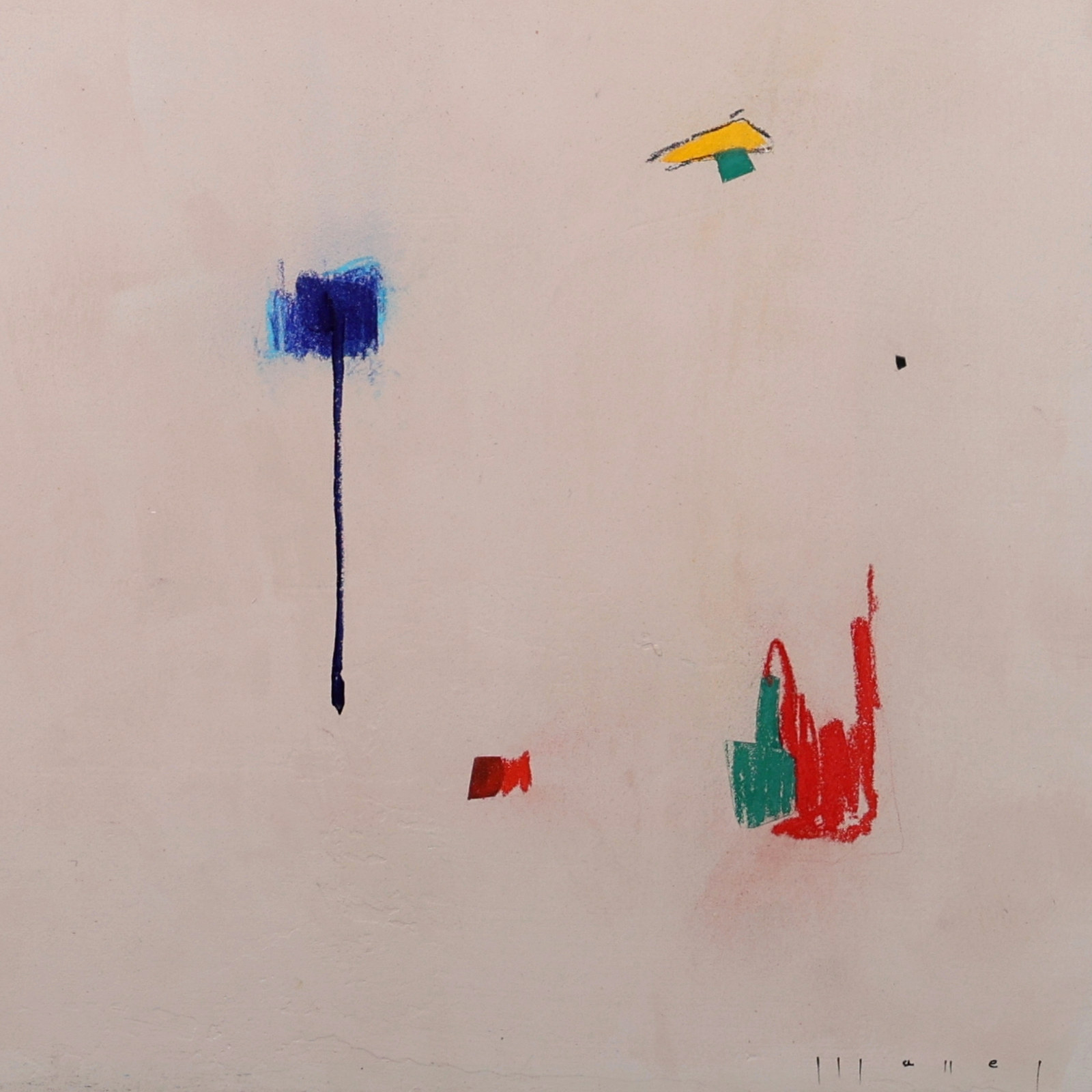 Playful abstract painting by Spanish artist Manel employing mixed techniques that combine various materials: acrylics, oils, charcoal, ink, and natural pigments, applied in subtle layers to play with textures and transparencies. Presented in a stylish contemporary oak frame as shown and ready to hang.