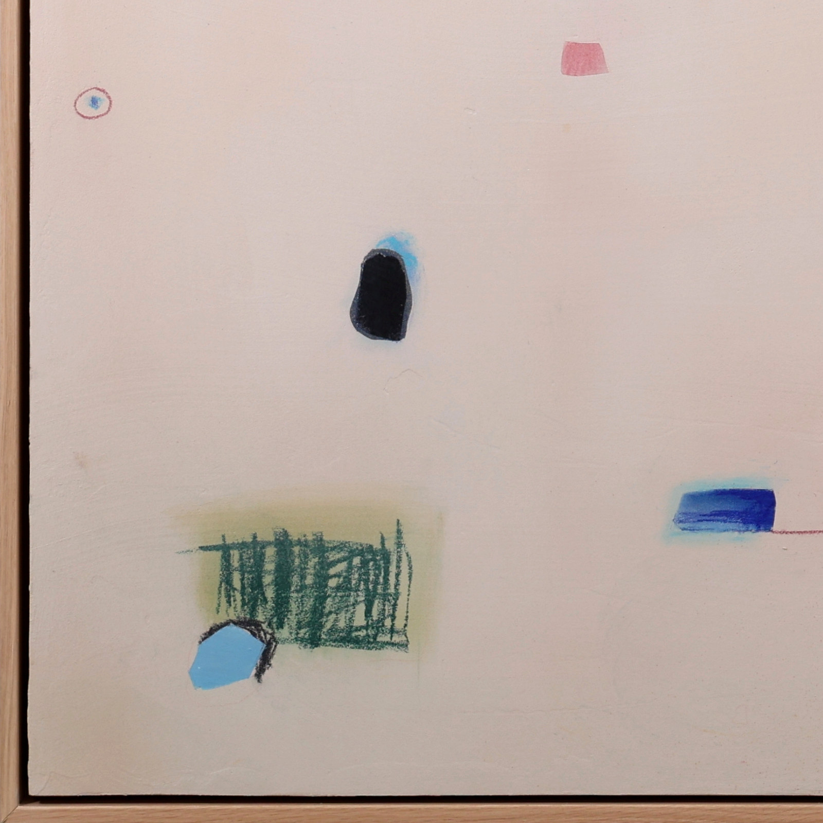 Playful abstract painting by Spanish artist Manel employing mixed techniques that combine various materials: acrylics, oils, charcoal, ink, and natural pigments, applied in subtle layers to play with textures and transparencies. Presented in a stylish contemporary oak frame as shown and ready to hang.
