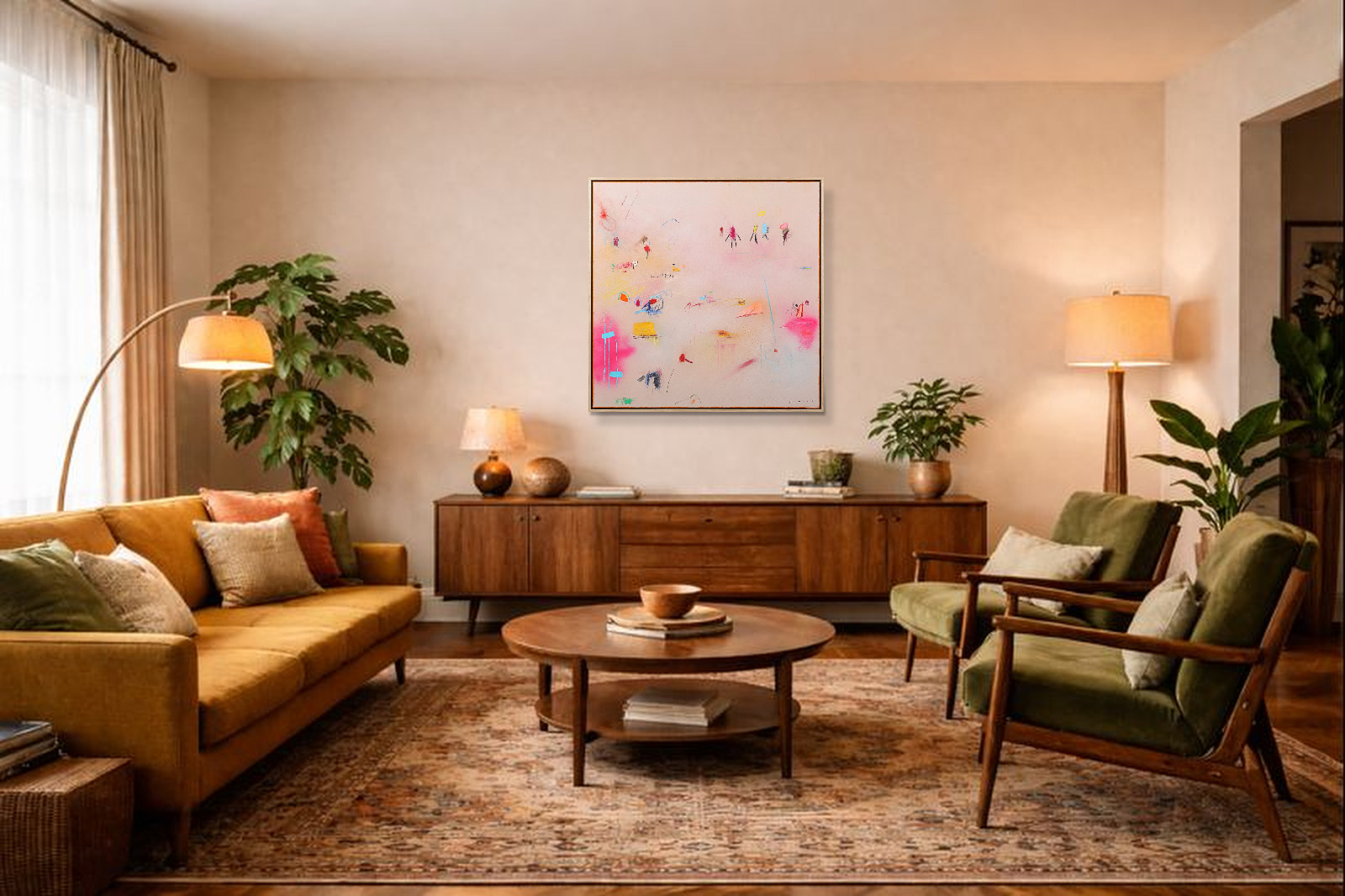 Playful abstract painting by Spanish artist Manel employing mixed techniques that combine various materials: acrylics, oils, charcoal, ink, and natural pigments, applied in subtle layers to play with textures and transparencies. Presented in a stylish contemporary oak frame as shown and ready to hang.