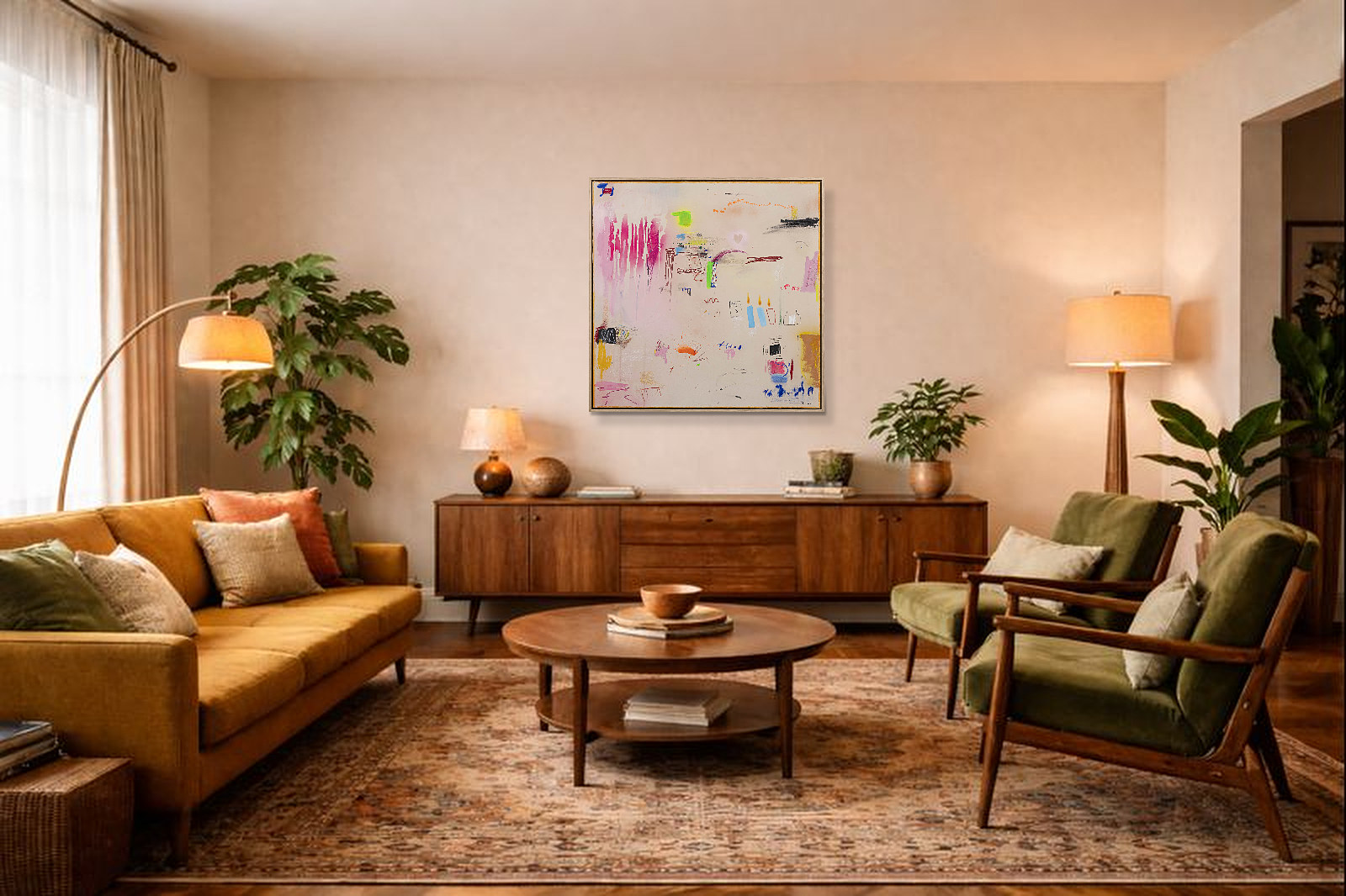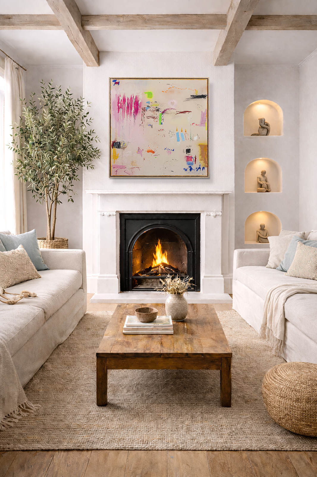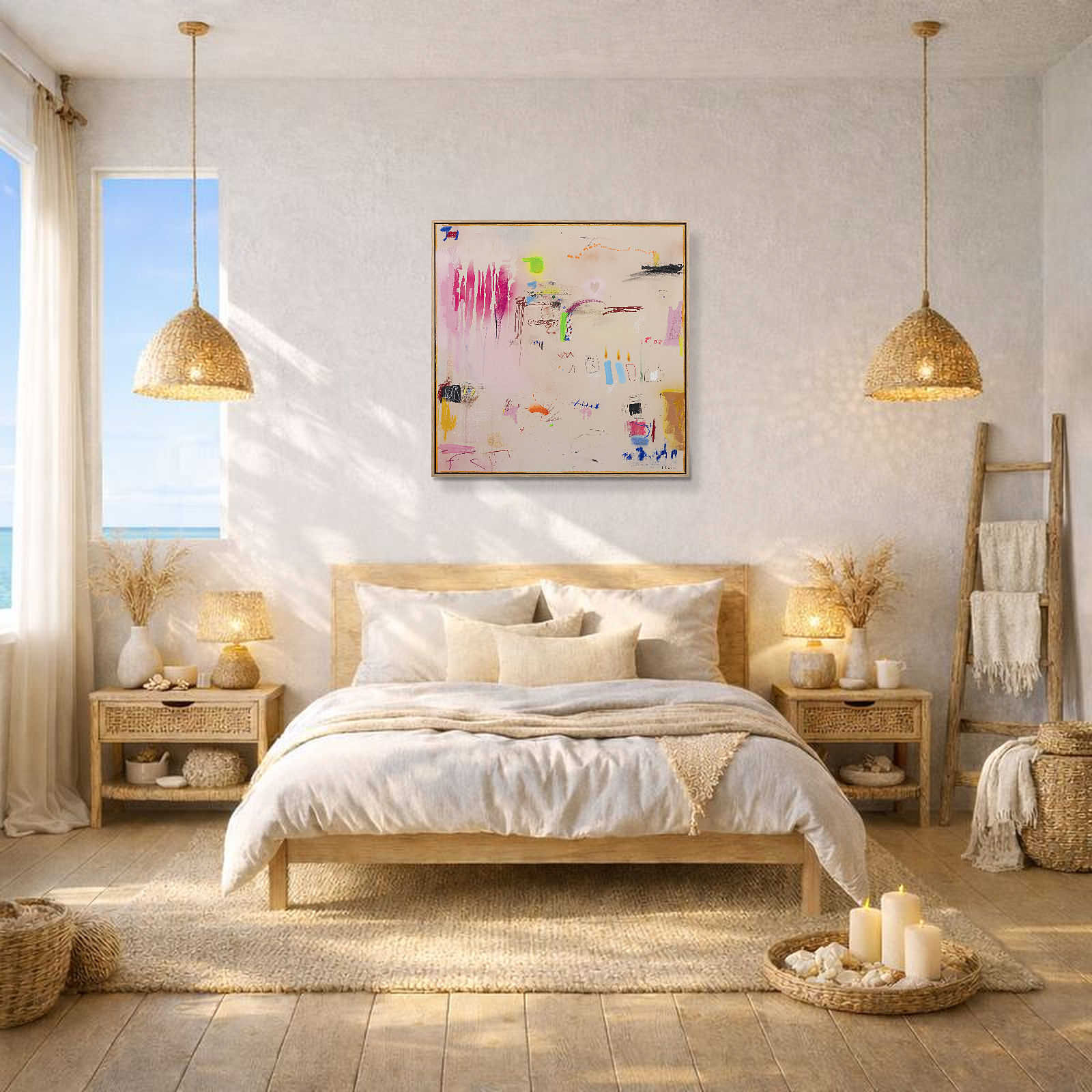 Playful abstract painting by Spanish artist Manel employing mixed techniques that combine various materials: acrylics, oils, charcoal, ink, and natural pigments, applied in subtle layers to play with textures and transparencies. Presented in a stylish contemporary oak frame as shown and ready to hang.