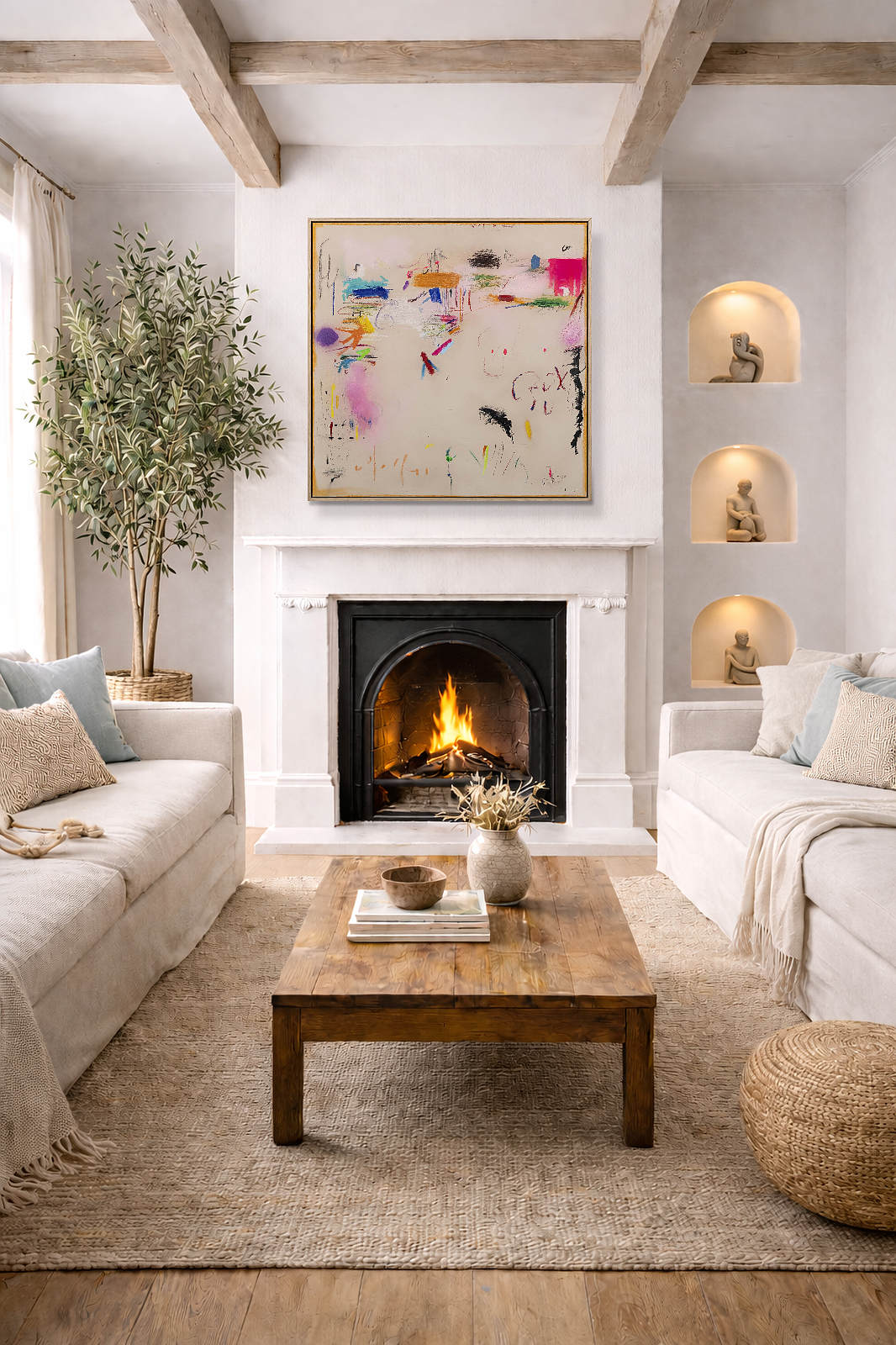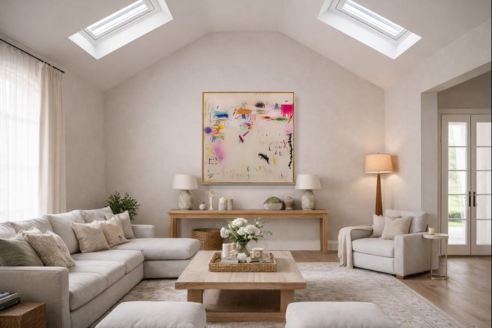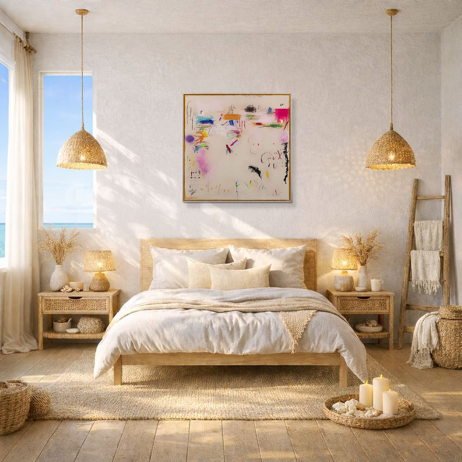 Playful abstract painting by Spanish artist Manel employing mixed techniques that combine various materials: acrylics, oils, charcoal, ink, and natural pigments, applied in subtle layers to play with textures and transparencies. Presented in a stylish contemporary oak frame as shown and ready to hang.