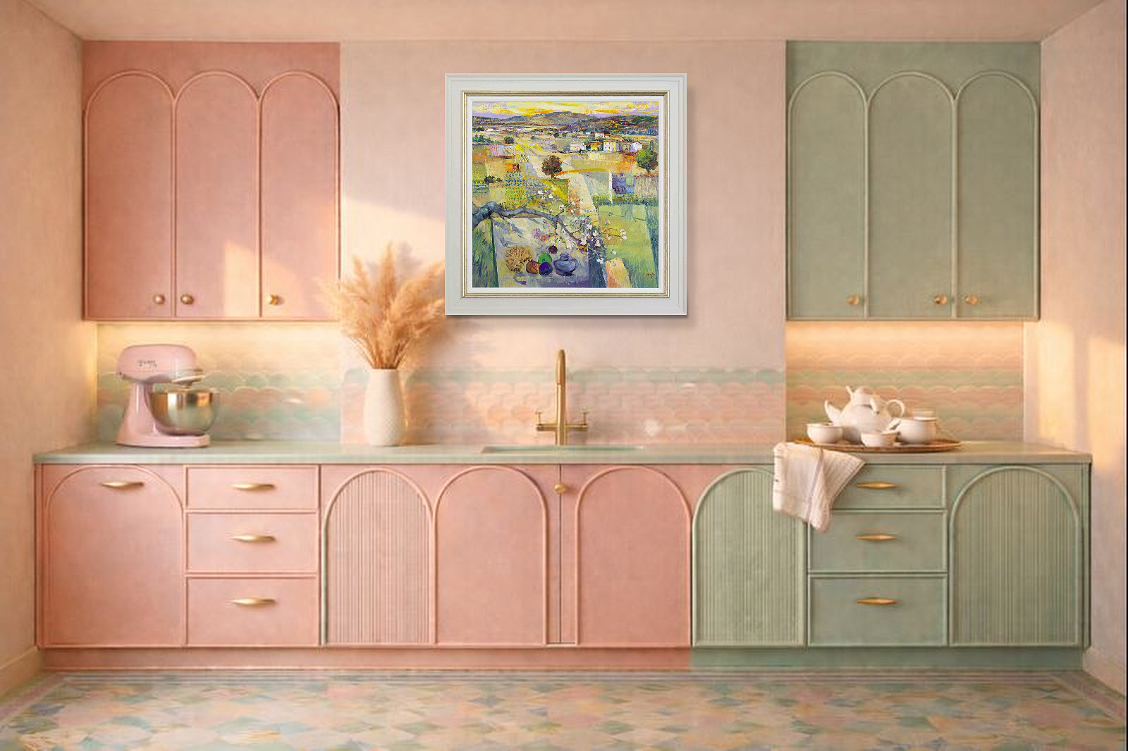 - 2. When prompted, press 'Visualise On Wall' and aim your phone at your floor while it calibrates*. A graphic will appear to help scale and position the artwork. You need to ensure this is correctly aligned to where the base of the wall meets the floor
