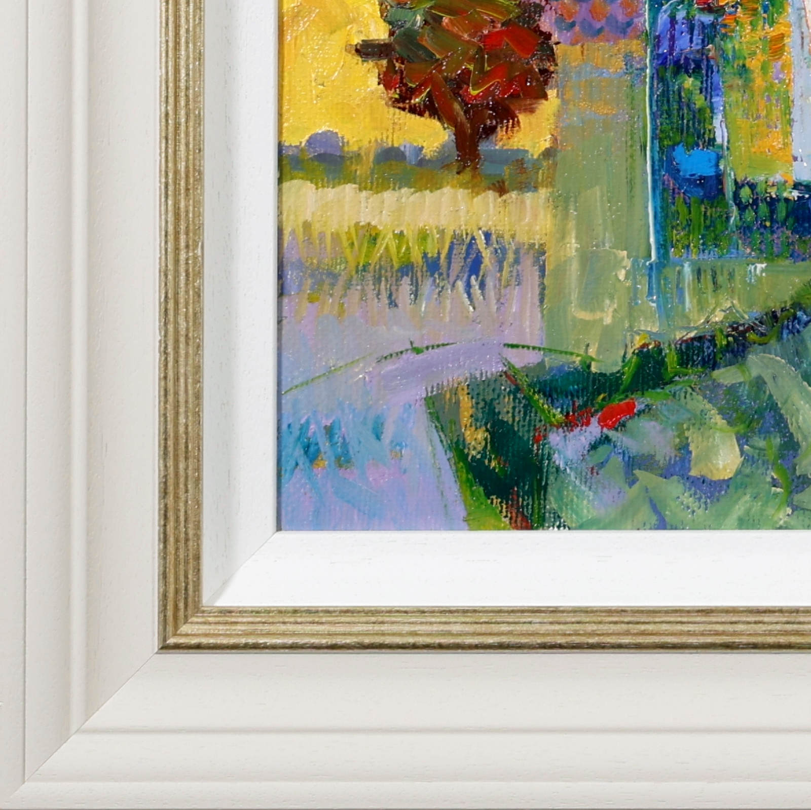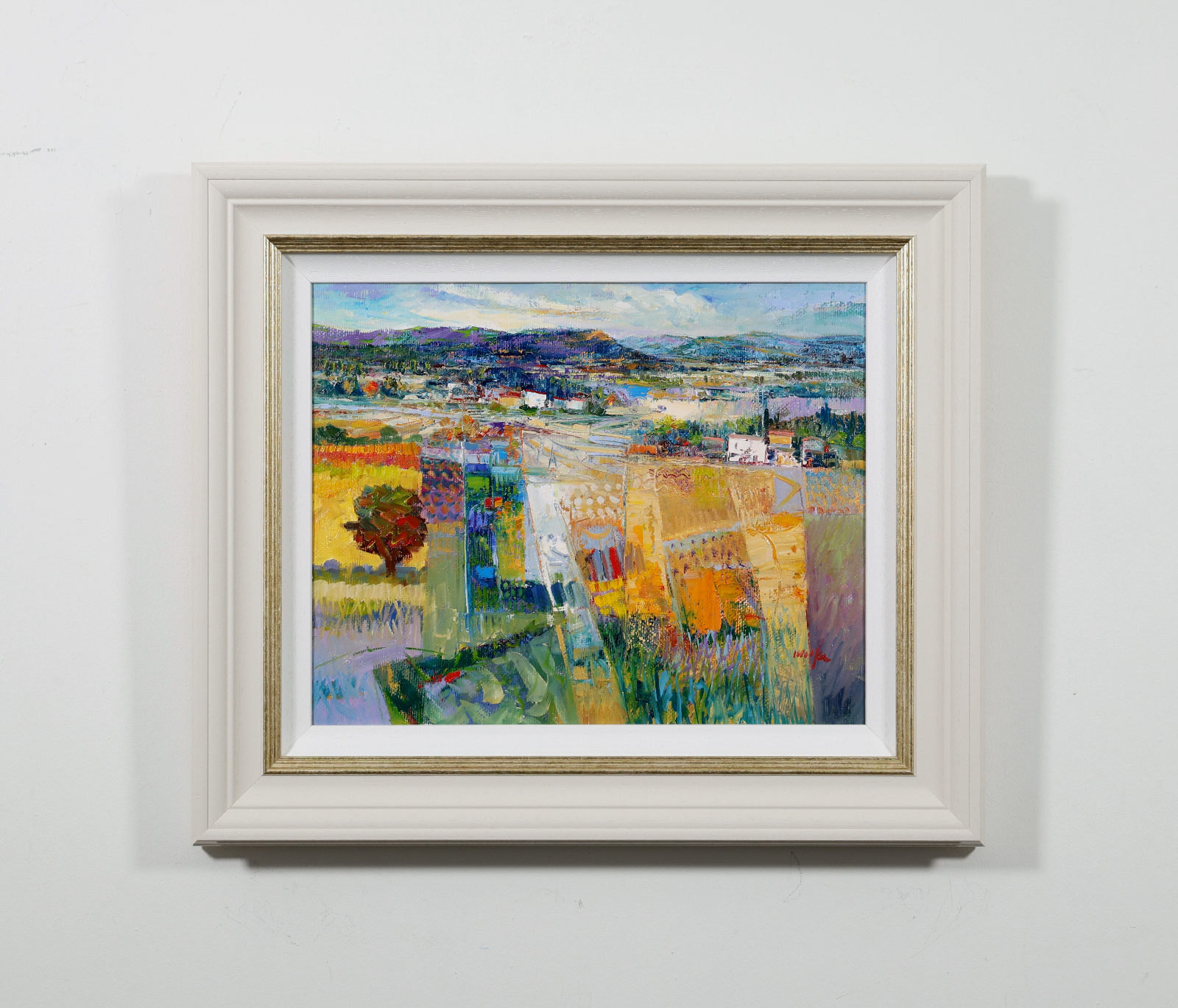 An elegant original oil painting by Italian artist Mario Malfer inspired by the natural beauty of the Italian countryside. Full of texture and subtle architectural rhythm, this charming smaller work brings warmth and atmosphere to any interior. Presented in a painted frame with golden trim and white slip as shown and ready to hang.