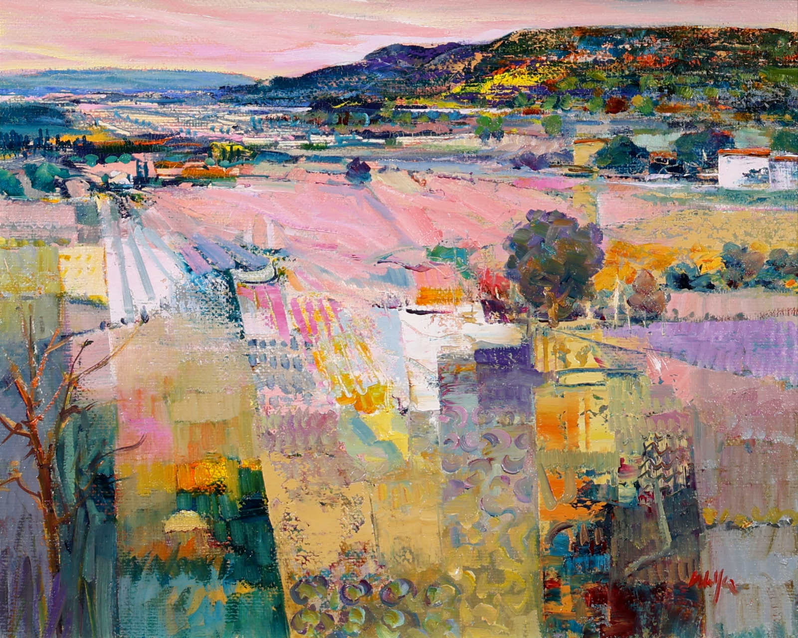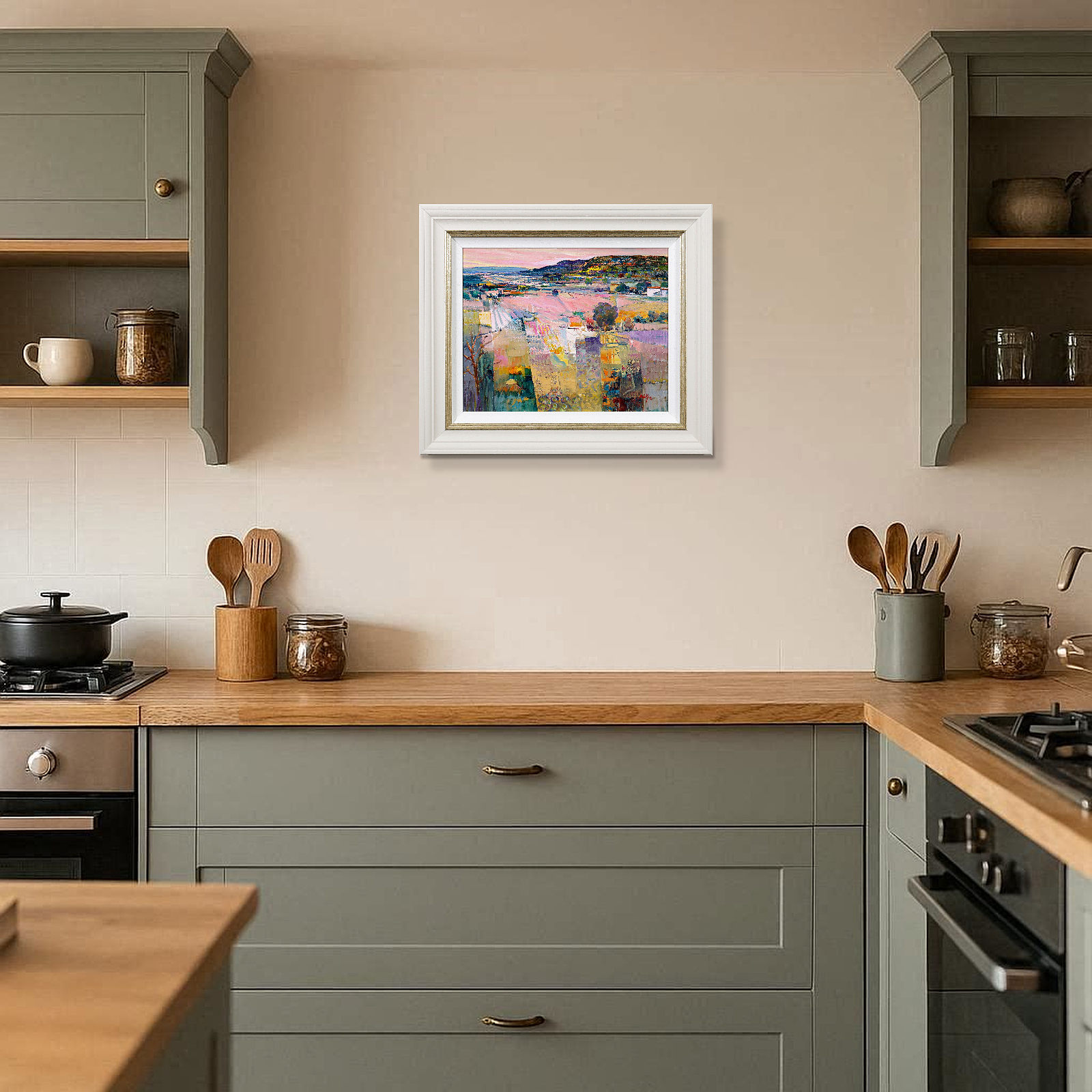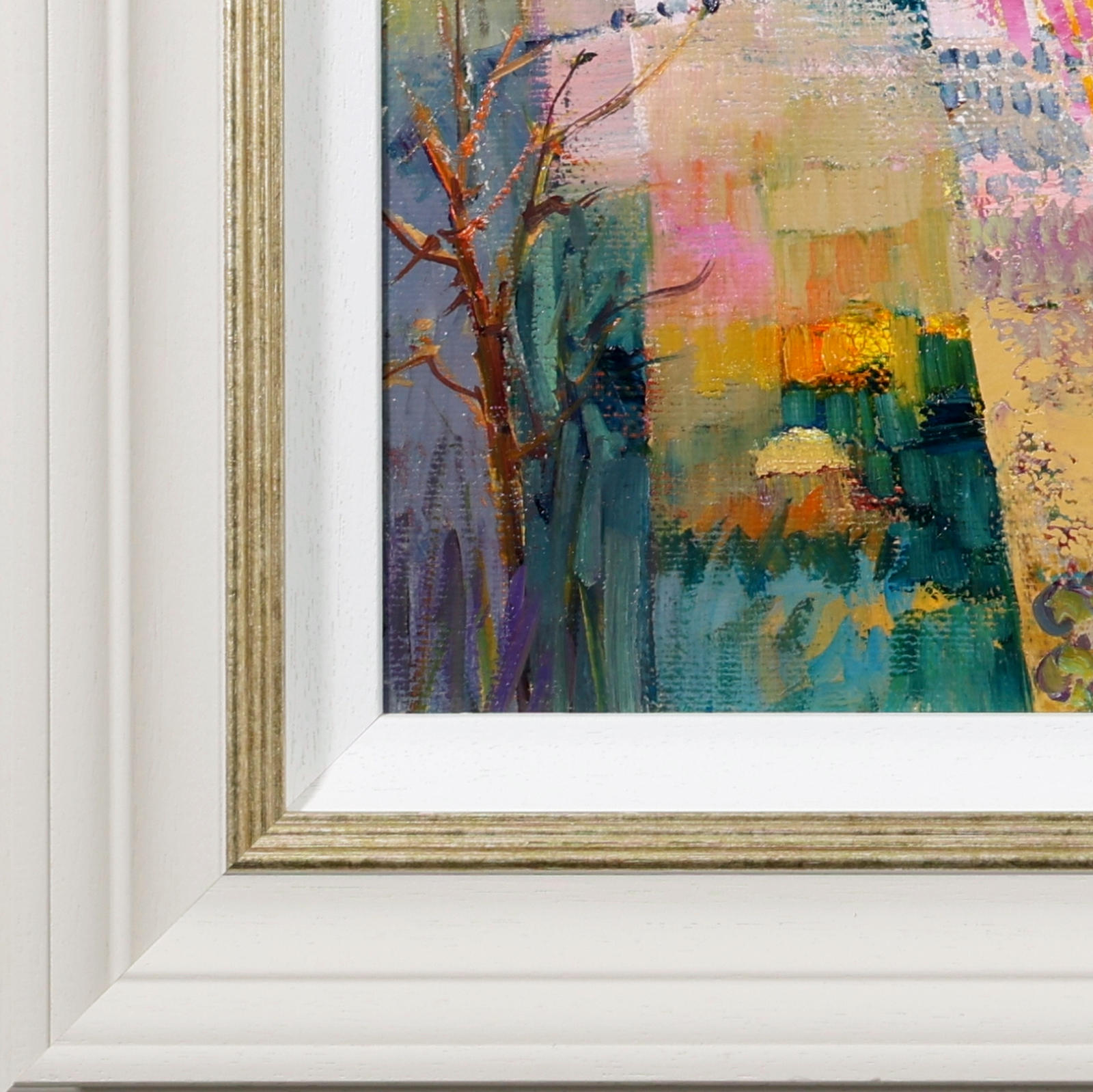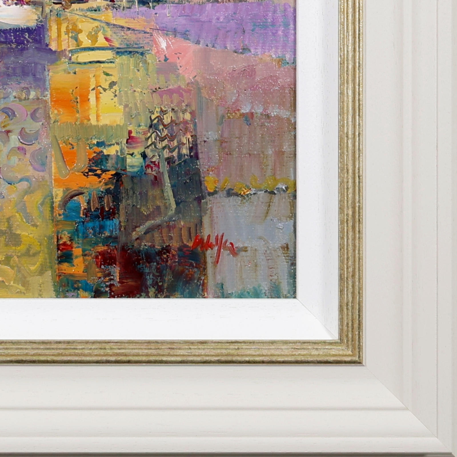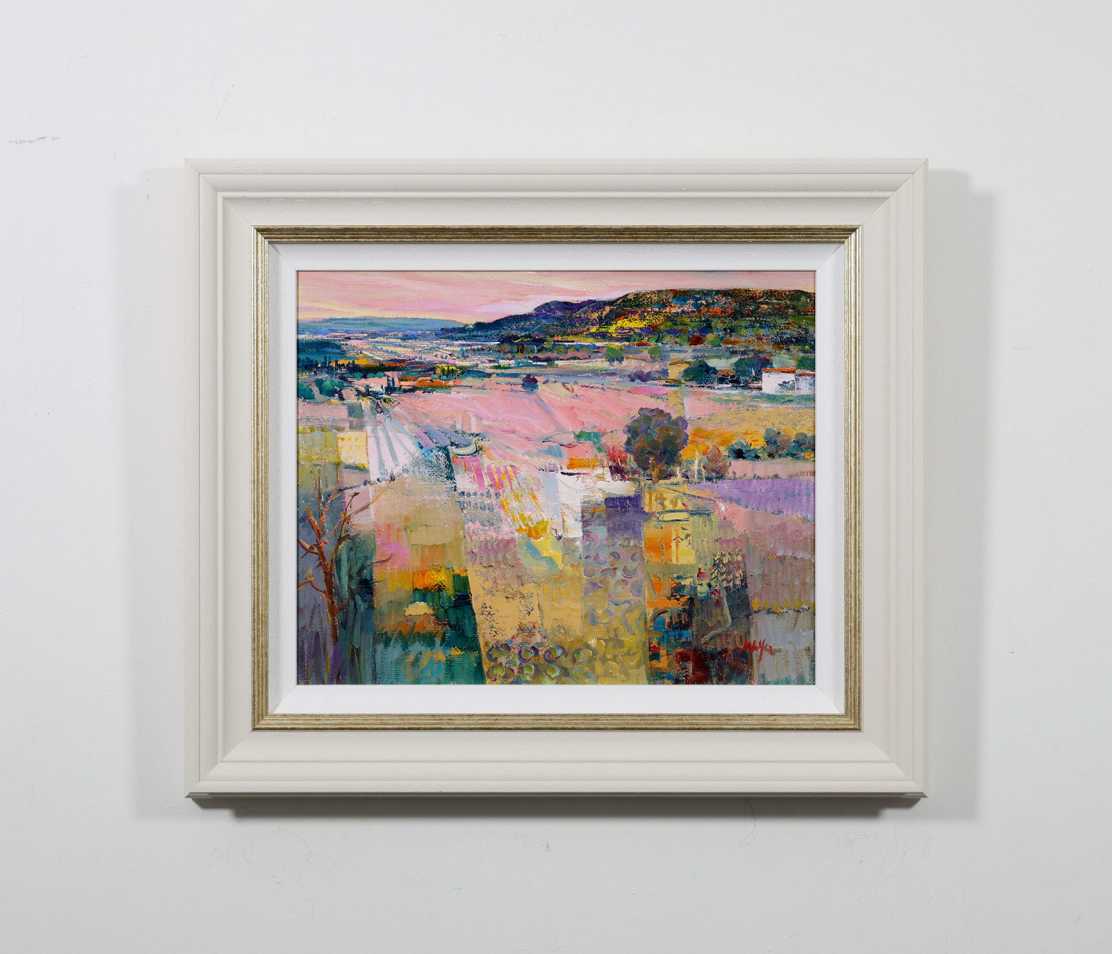 An elegant original oil painting by Italian artist Mario Malfer inspired by the natural beauty of the Italian countryside. Full of texture and subtle architectural rhythm, this charming smaller work brings warmth and atmosphere to any interior. Presented in a painted frame with golden trim and white slip as shown and ready to hang.