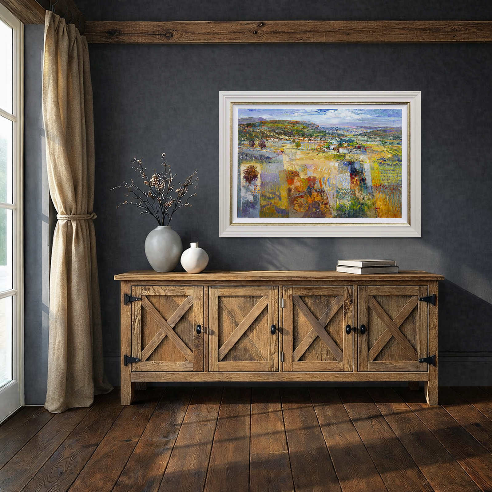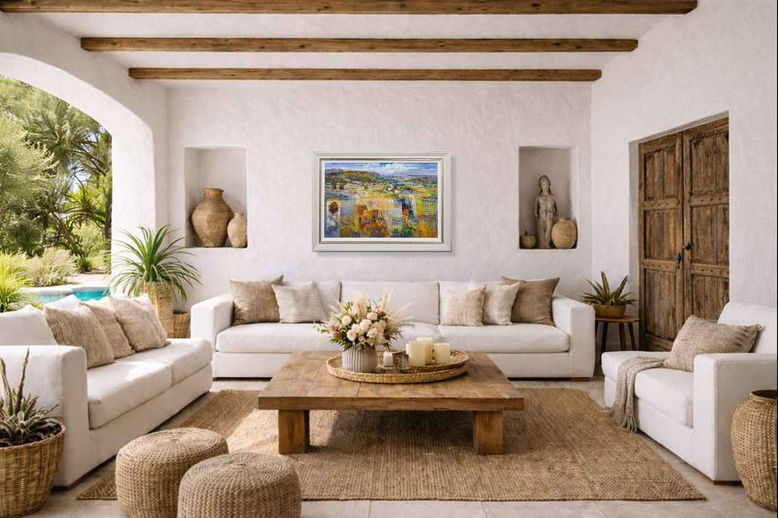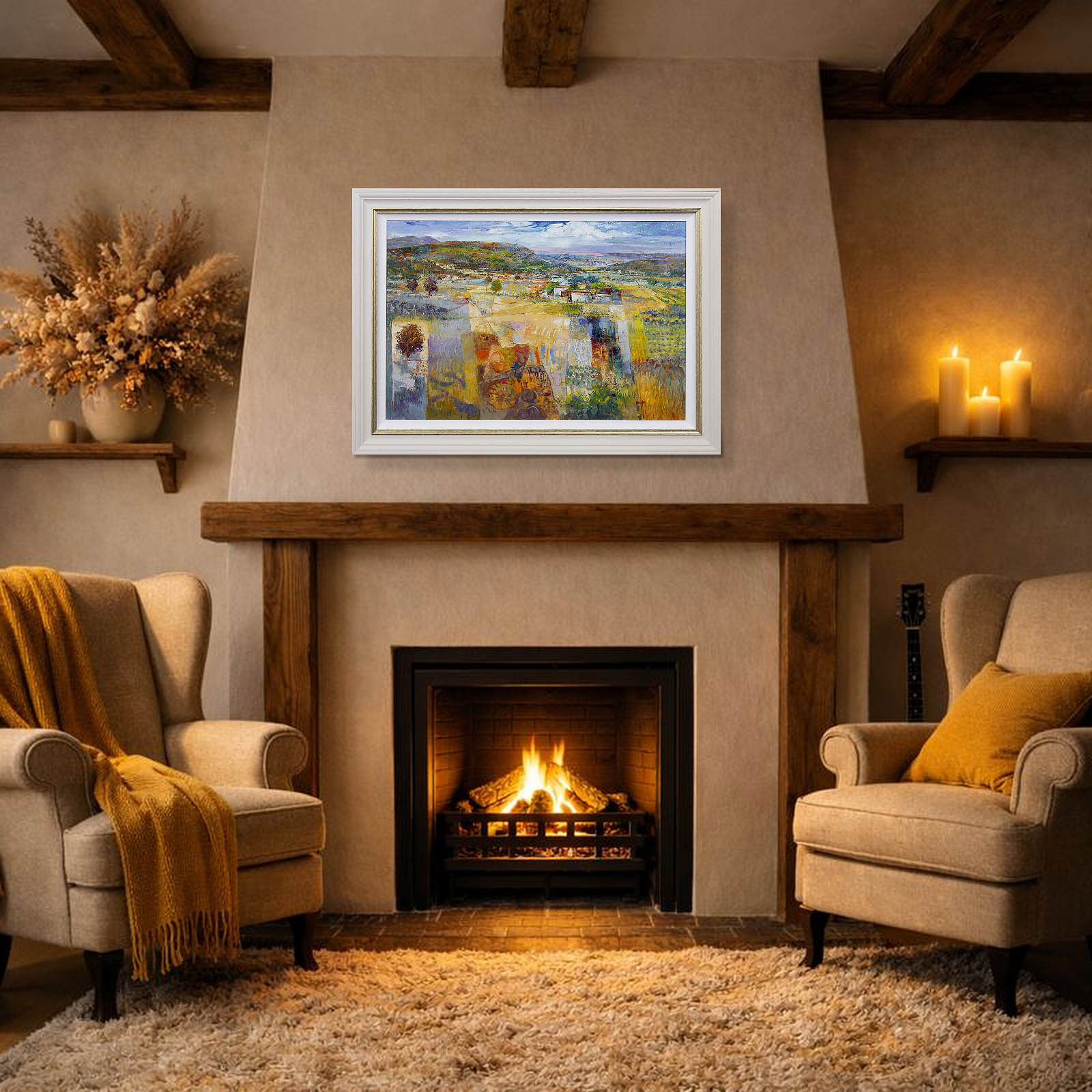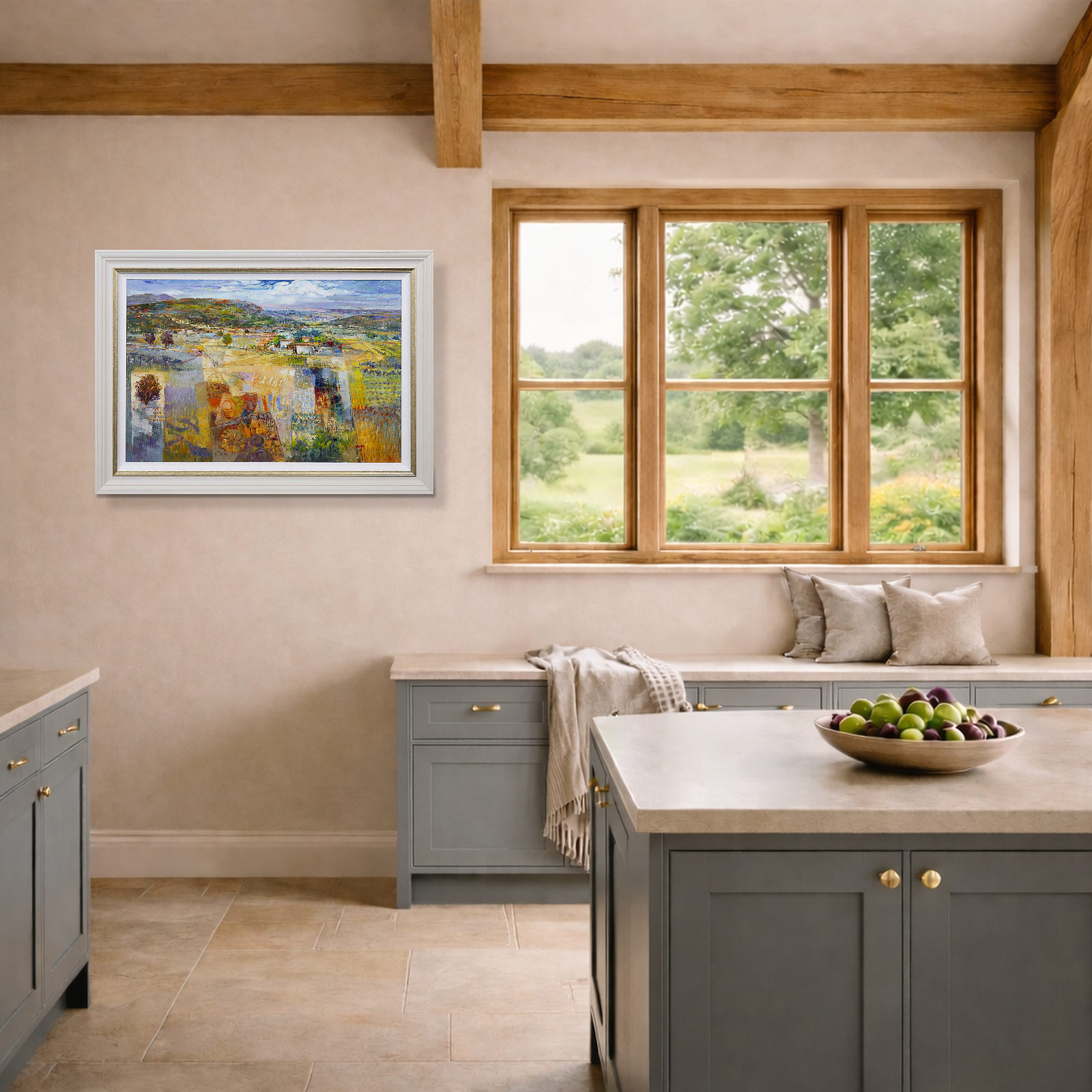 Stunning original oil painting by Italian artist Mario Malfer inspired by the Tuscan hills and surrounding countryside. Presented in a painted frame with golden trim and white slip as shown and ready to hang.