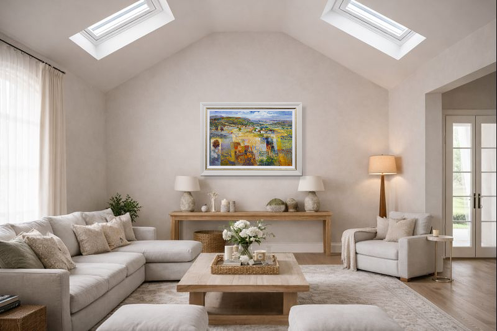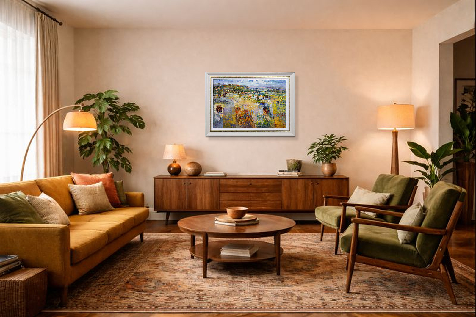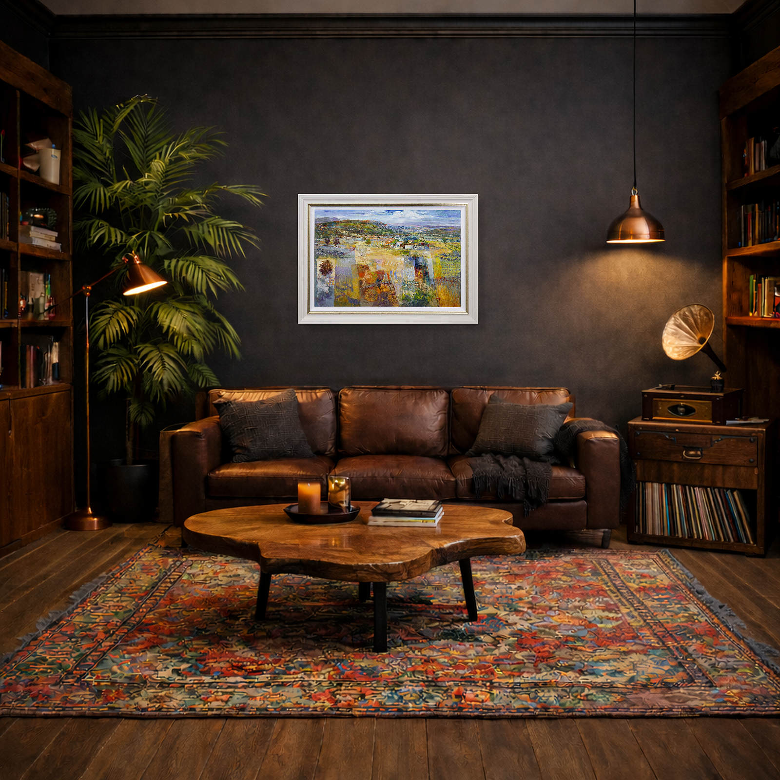 Stunning original oil painting by Italian artist Mario Malfer inspired by the Tuscan hills and surrounding countryside. Presented in a painted frame with golden trim and white slip as shown and ready to hang.