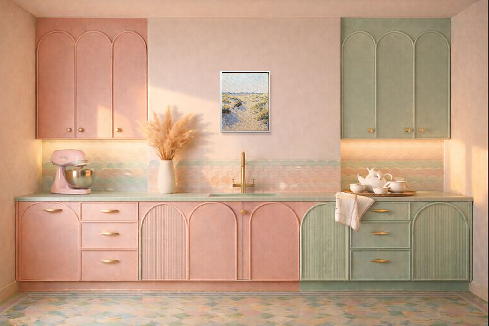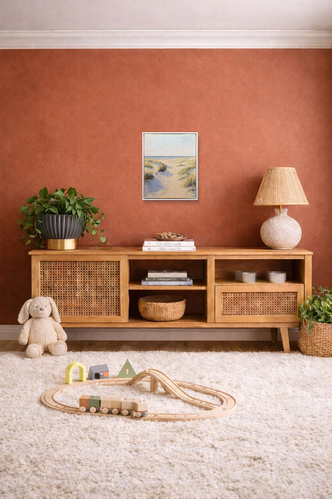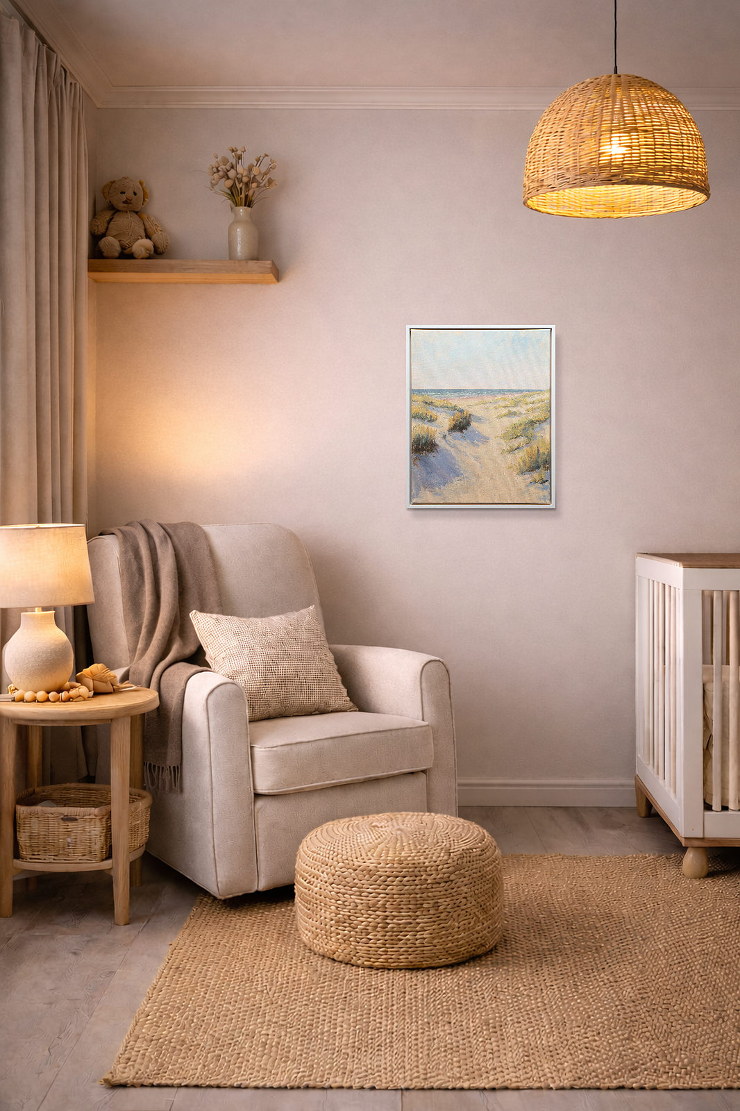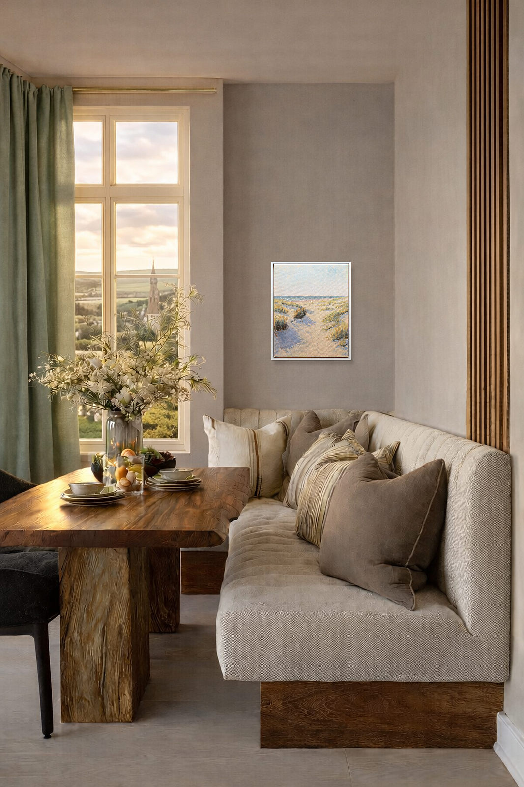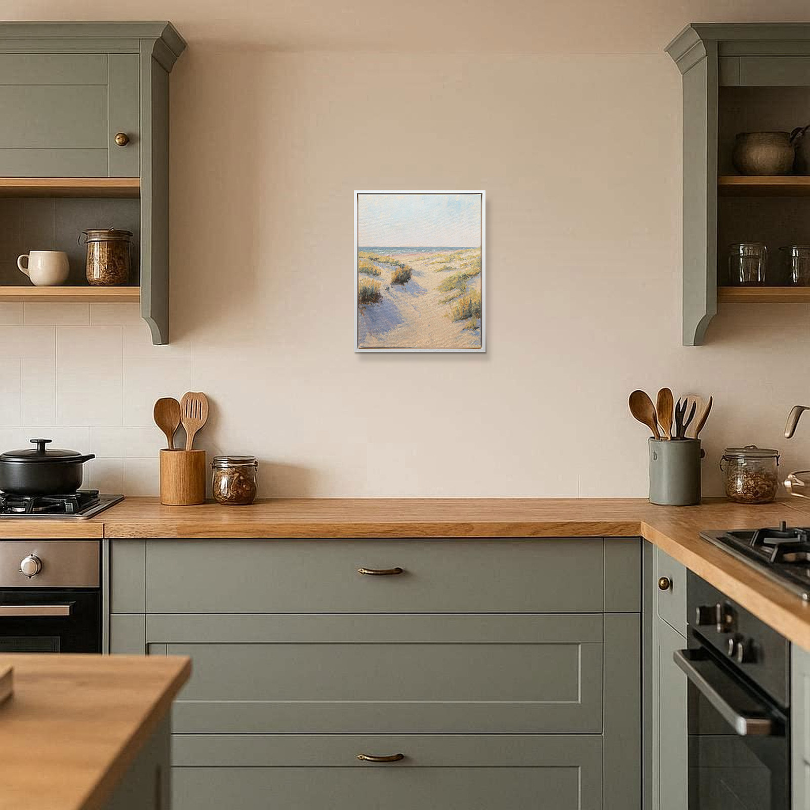 Relaxing coastal painting by British artist Matthew Cordwell. Presented in a contemporary white frame as shown and ready to hang.