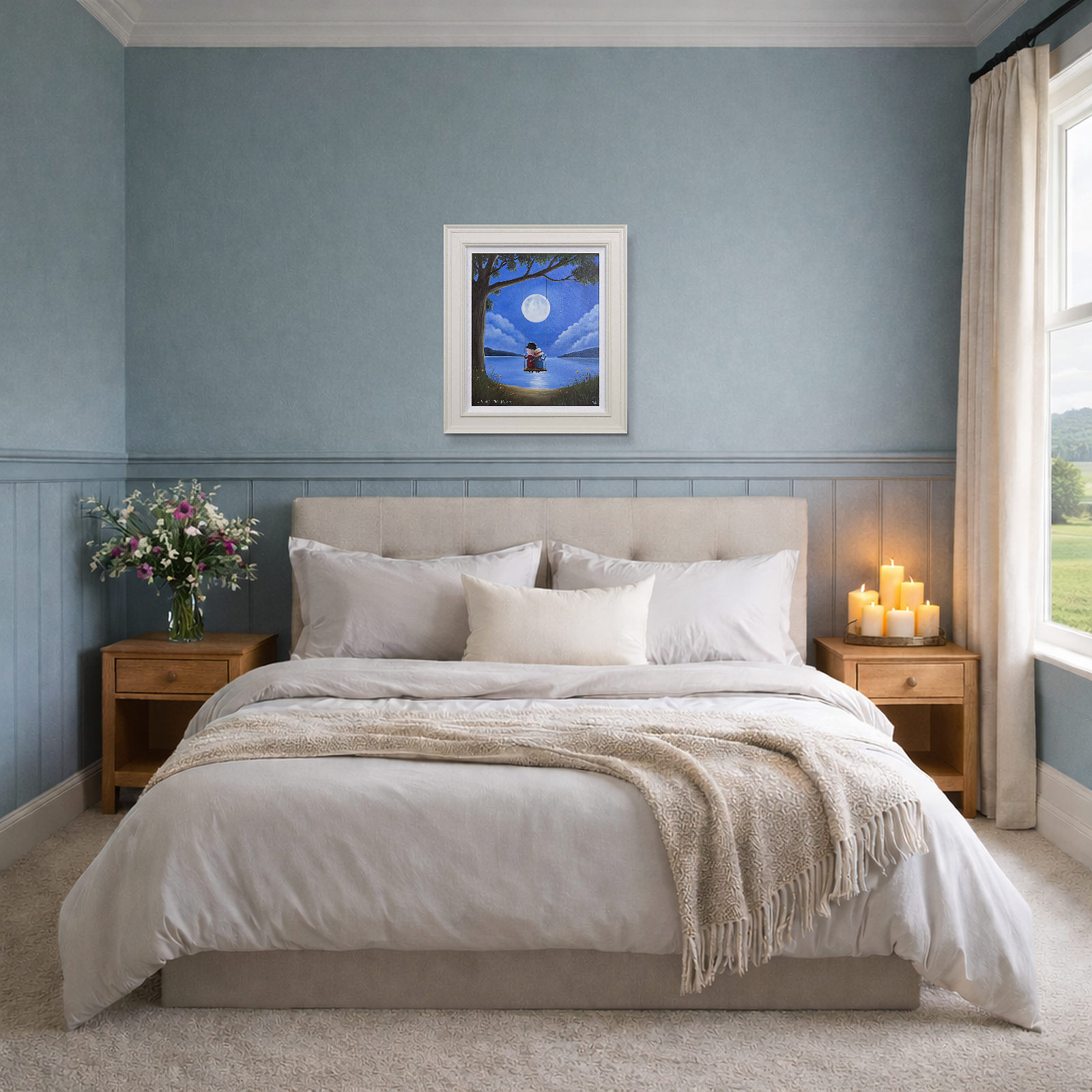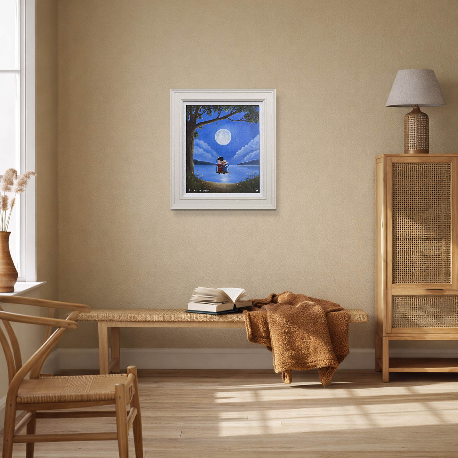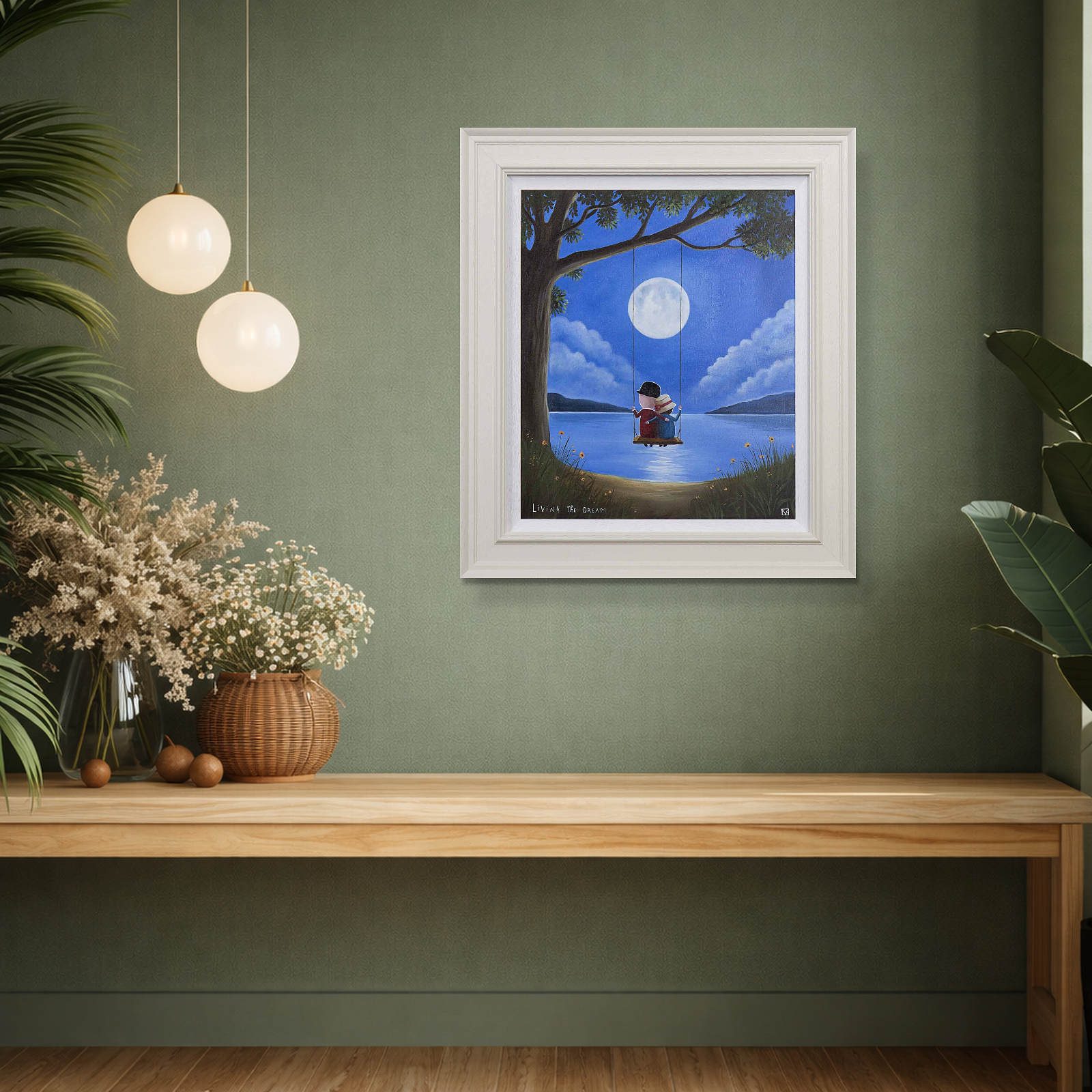 Romantic original oil painting by the popular artist Michael Abrams. Presented in a painted finish neutral tone frame as shown and ready to hang on the wall
