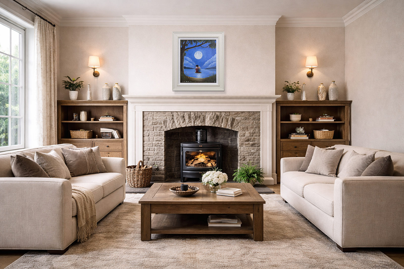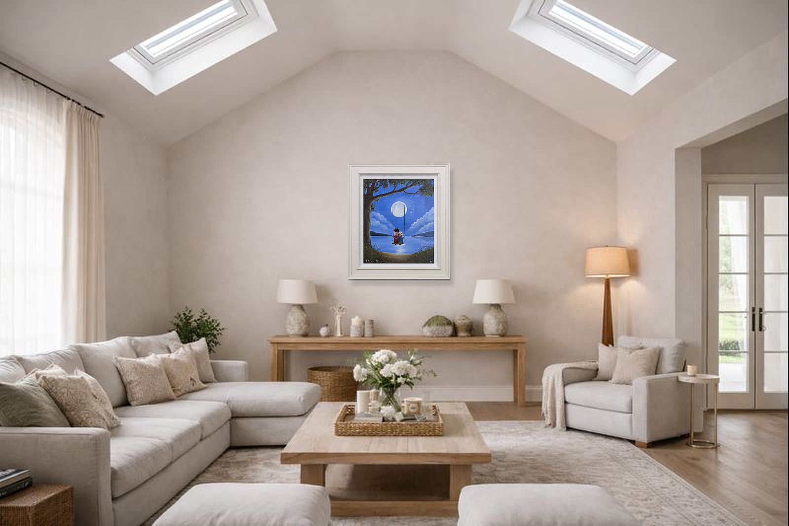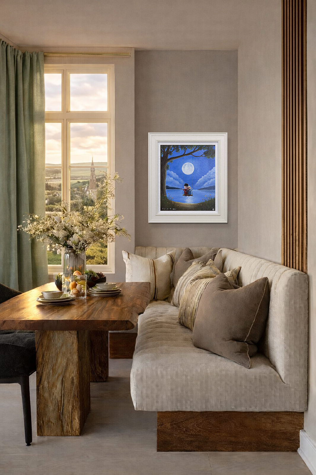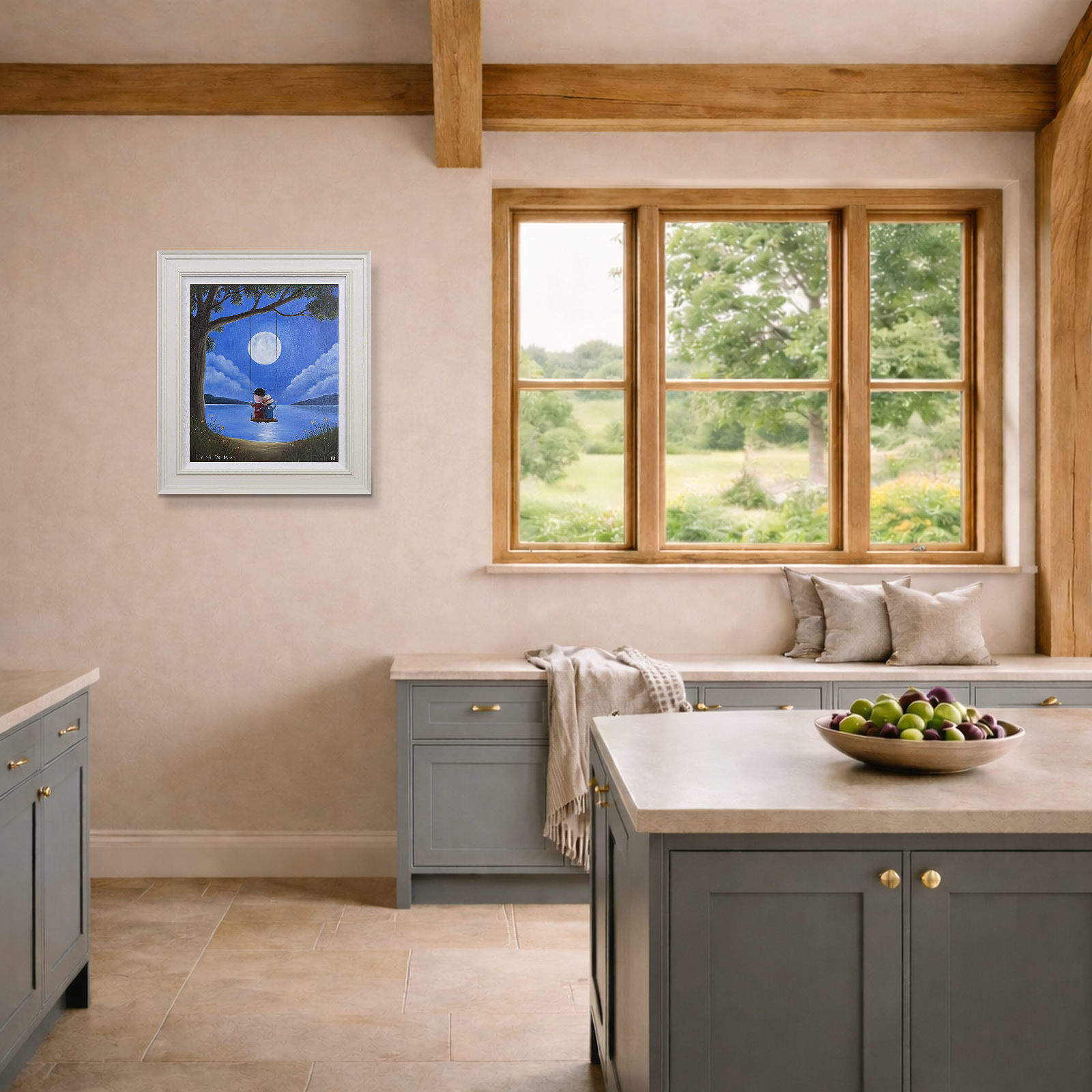 Romantic original oil painting by the popular artist Michael Abrams. Presented in a painted finish neutral tone frame as shown and ready to hang on the wall