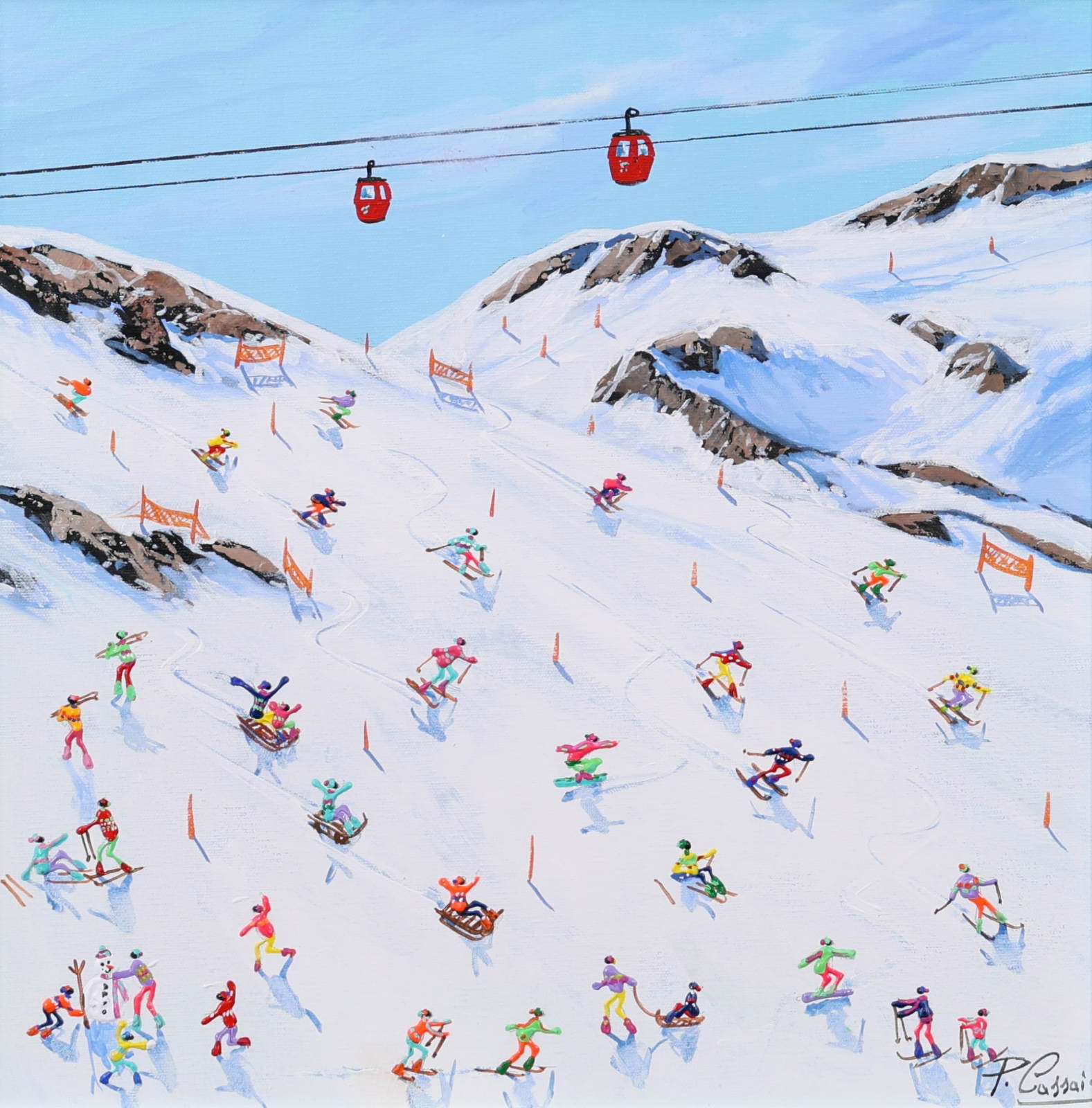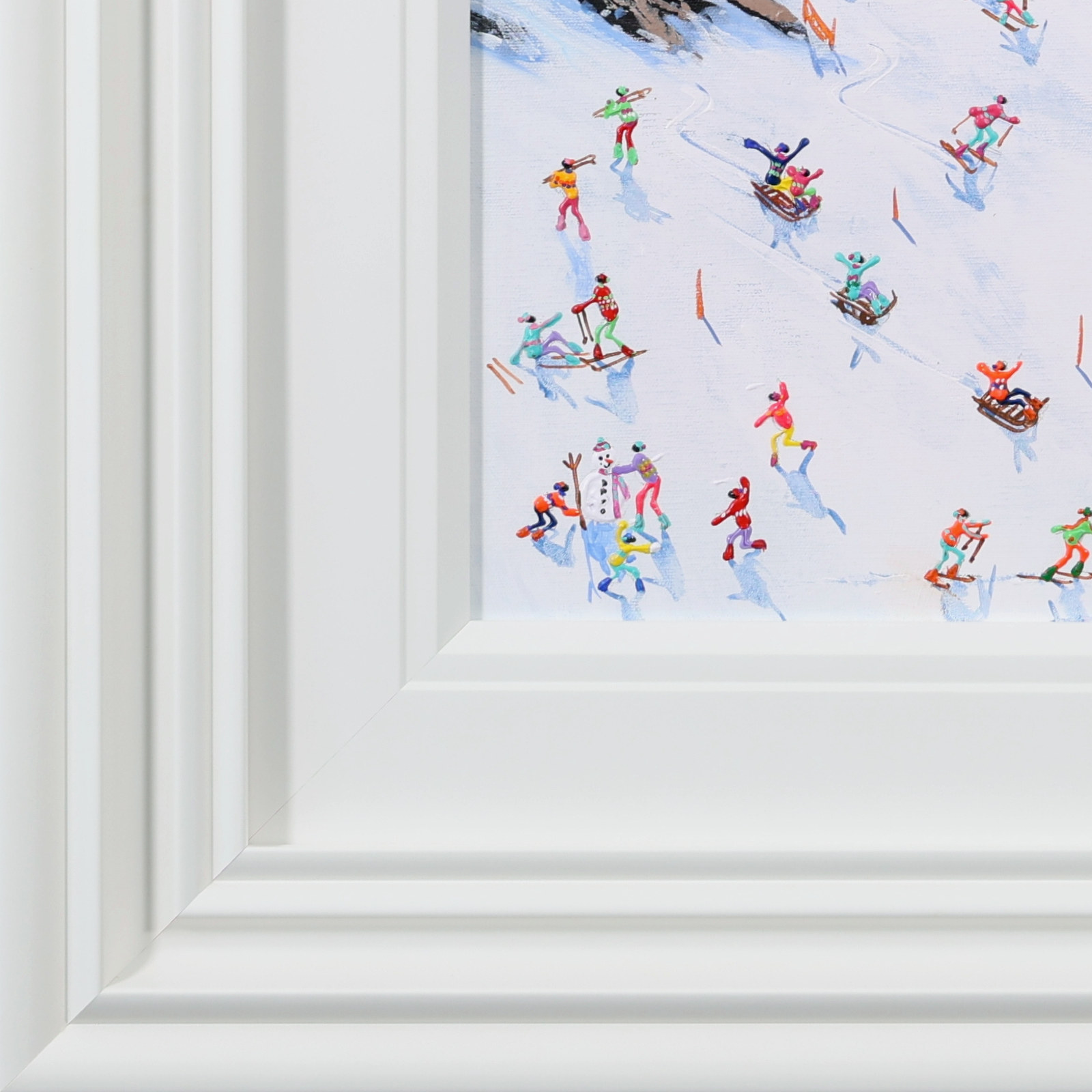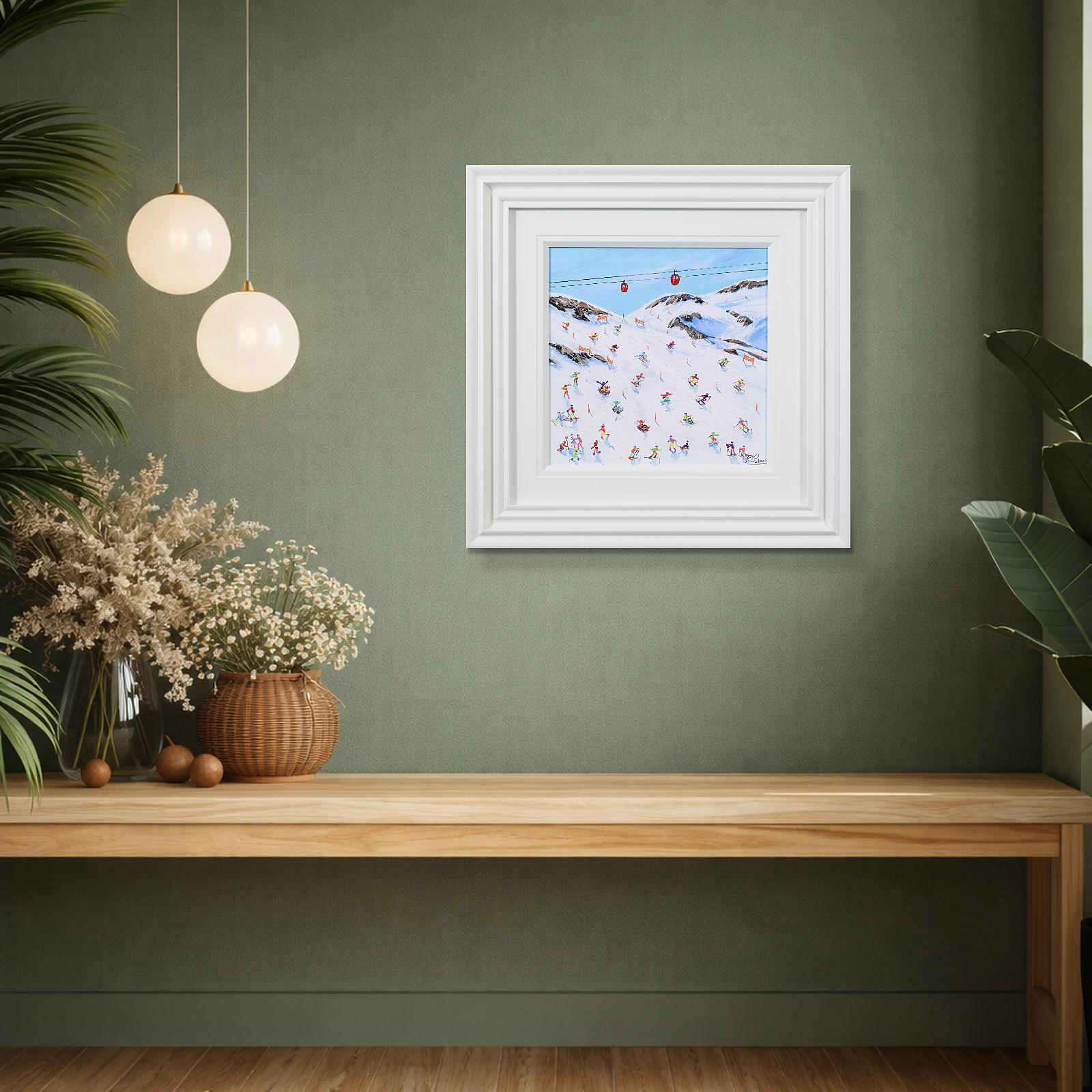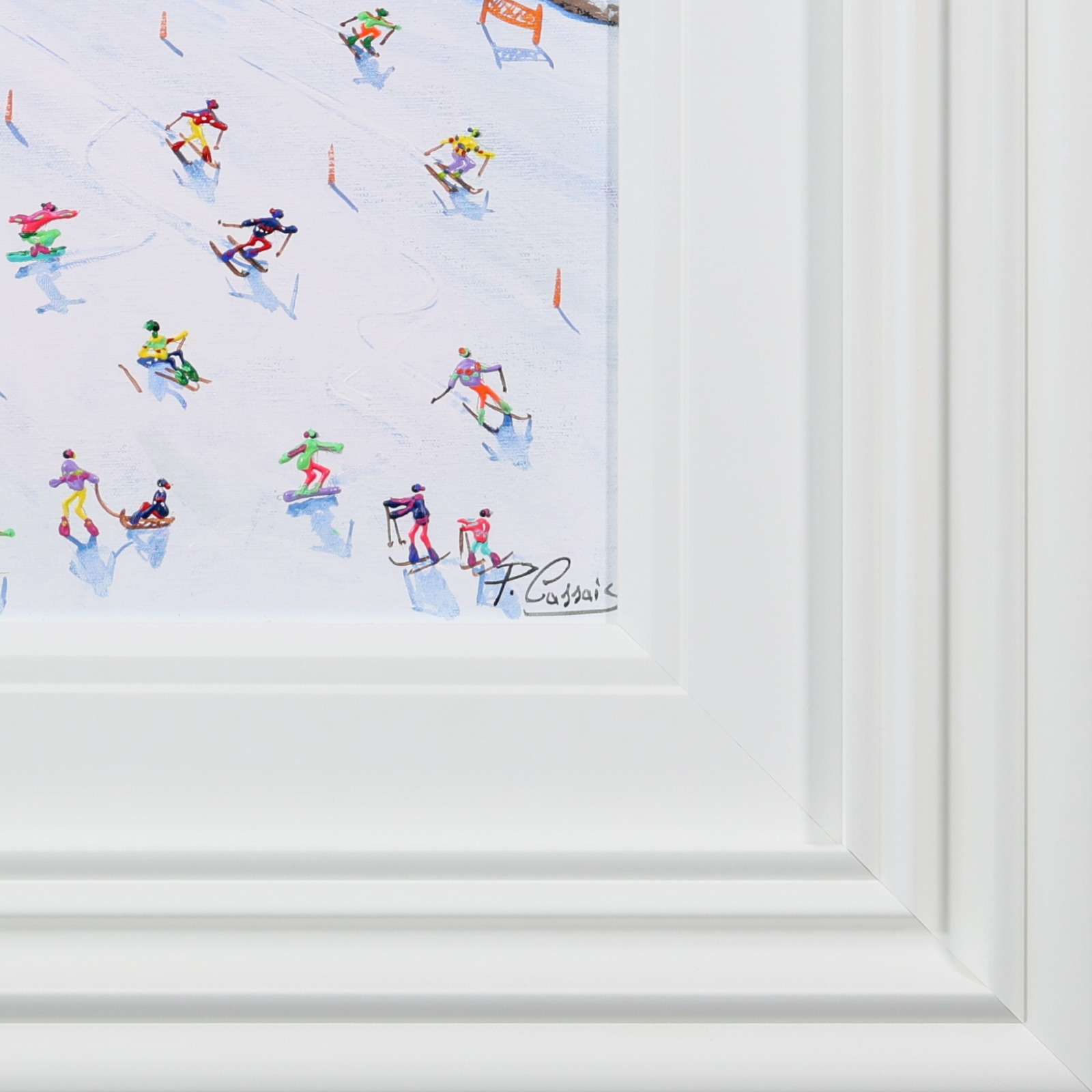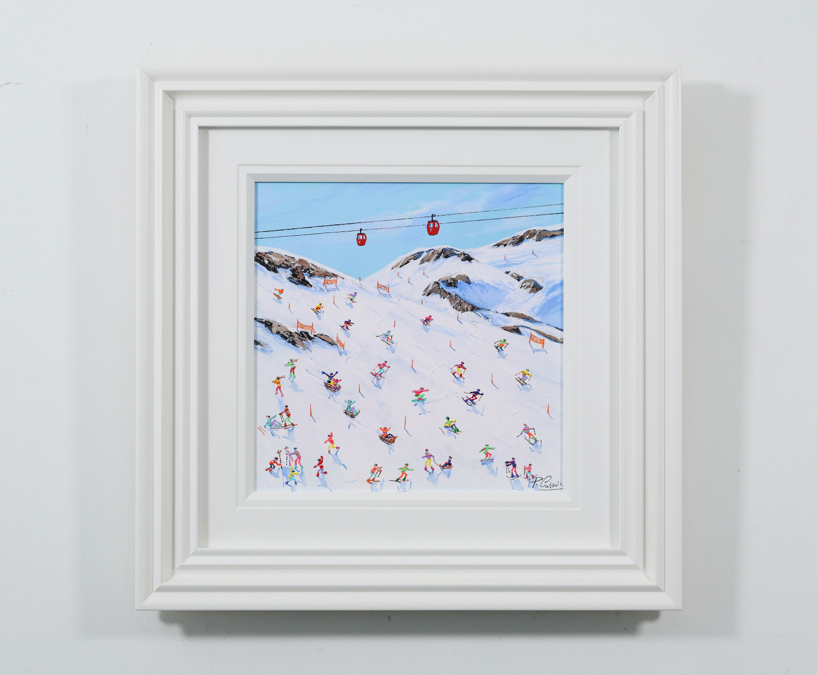 A joyful winter scene by Paola Cassais capturing skiers weaving through crisp white slopes beneath a brilliant blue sky. Full of movement and charm, this small original is beautifully presented in a wide matt white frame as pictured and ready to hang — perfect for that smaller space.