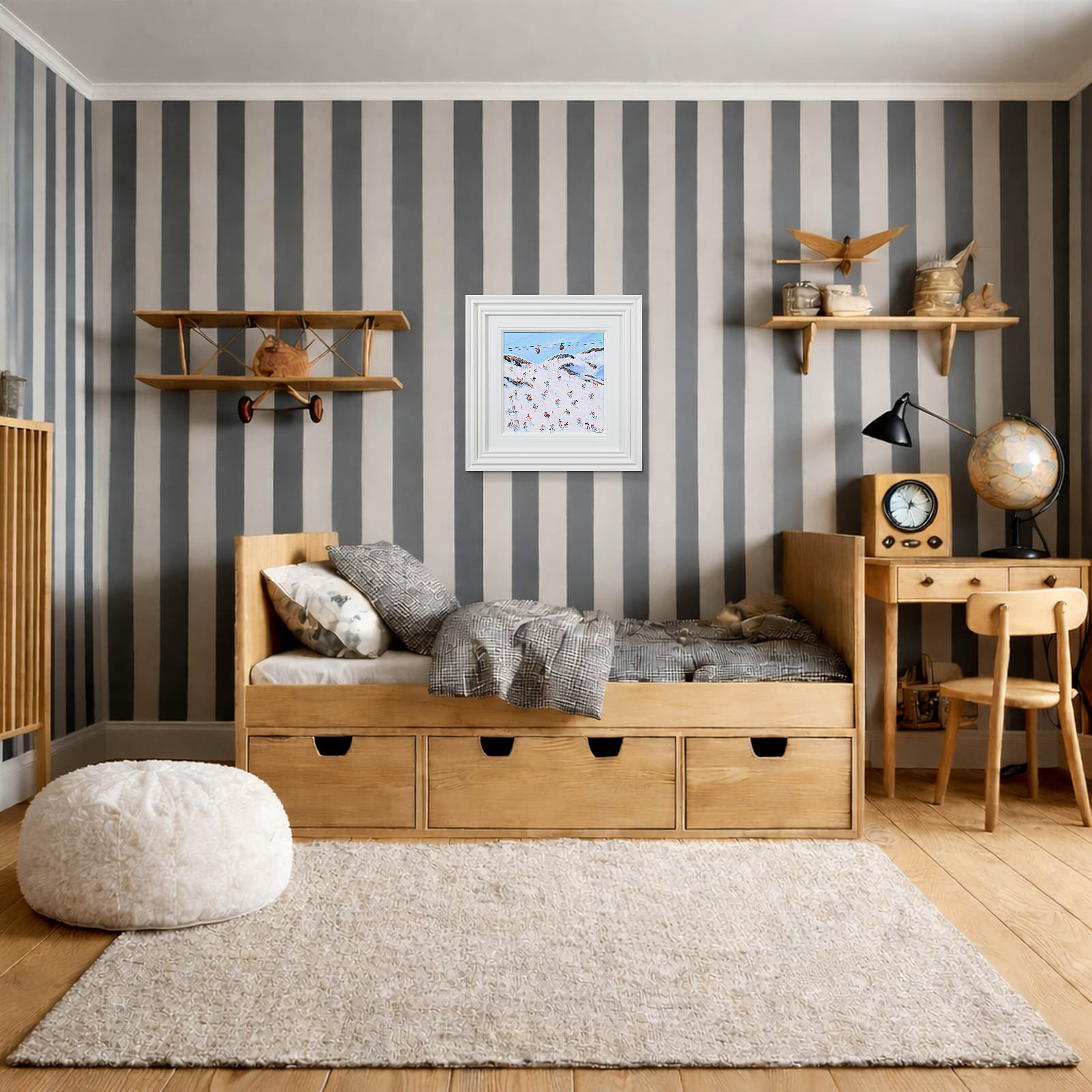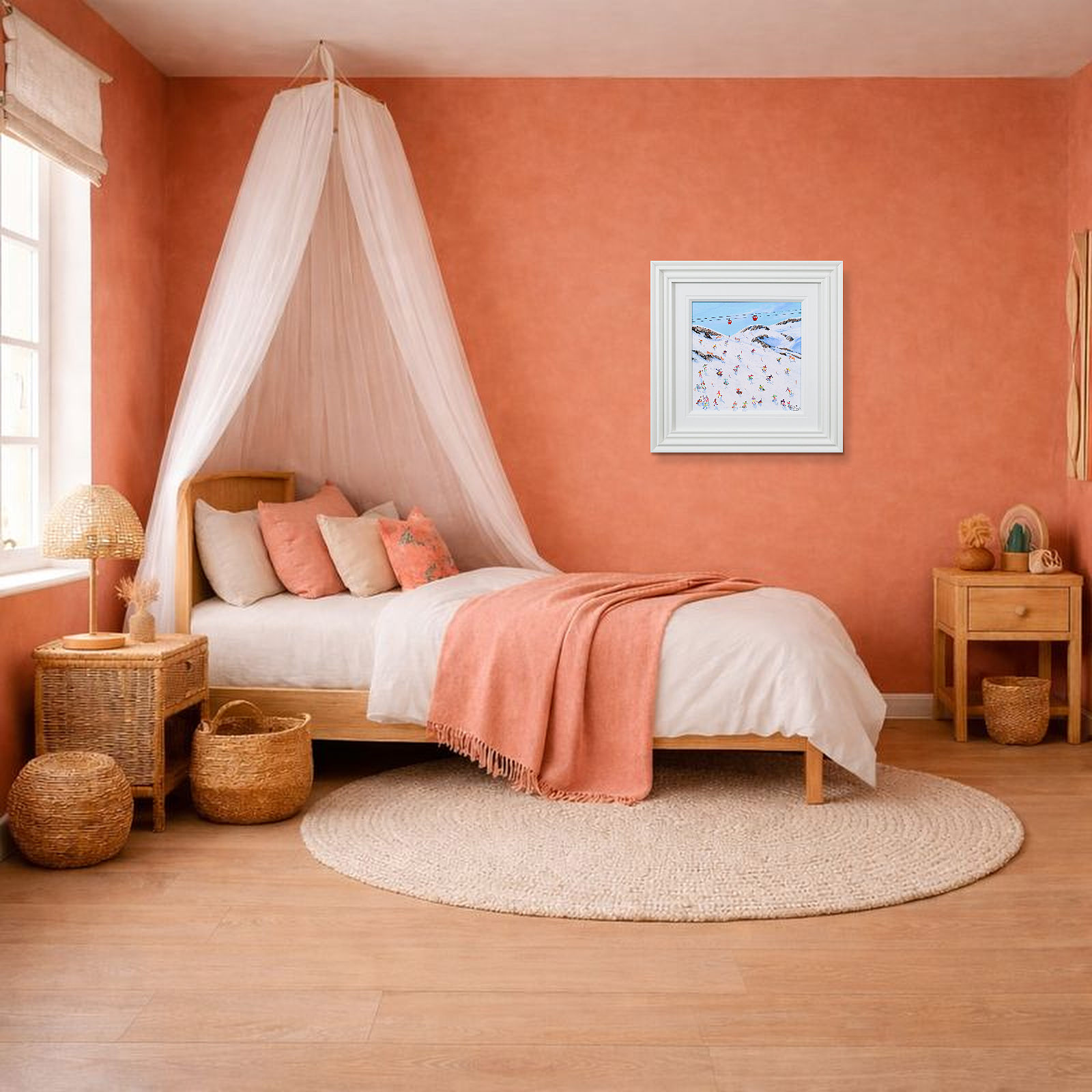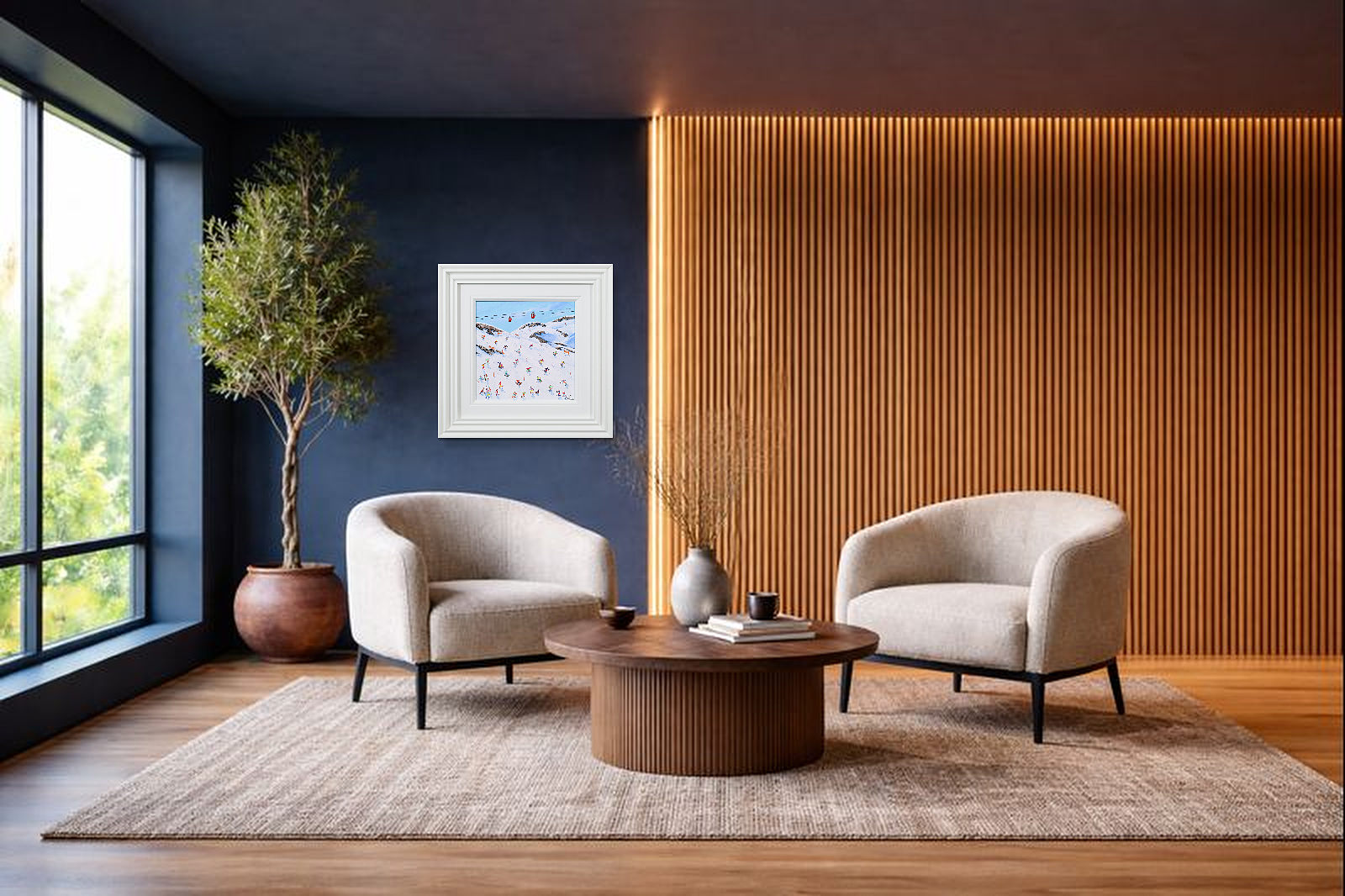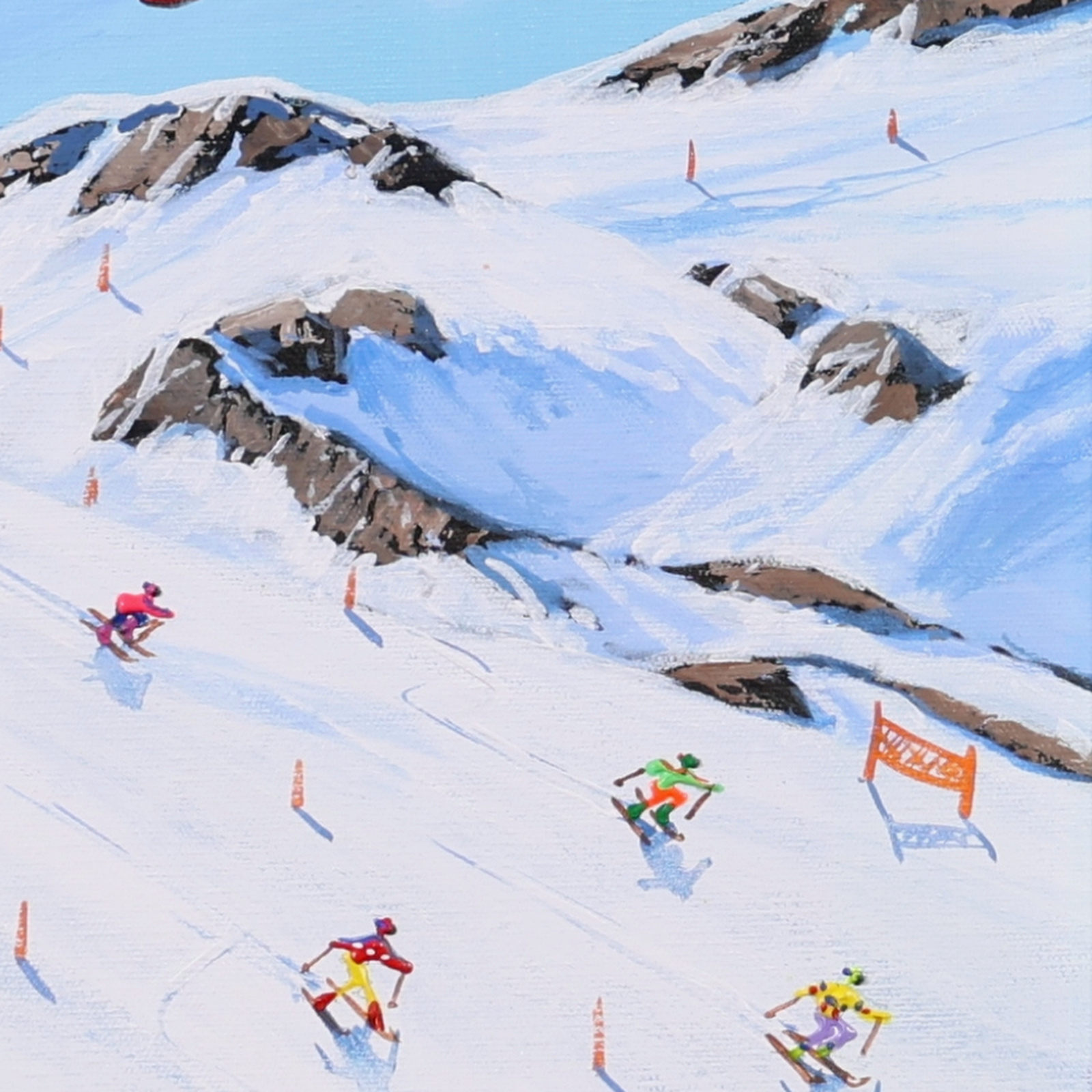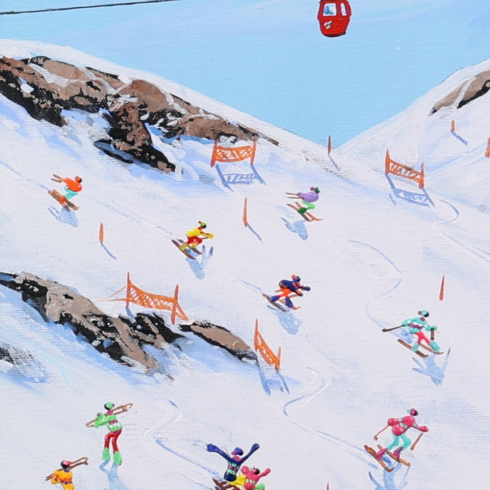 A joyful winter scene by Paola Cassais capturing skiers weaving through crisp white slopes beneath a brilliant blue sky. Full of movement and charm, this small original is beautifully presented in a wide matt white frame as pictured and ready to hang — perfect for that smaller space.