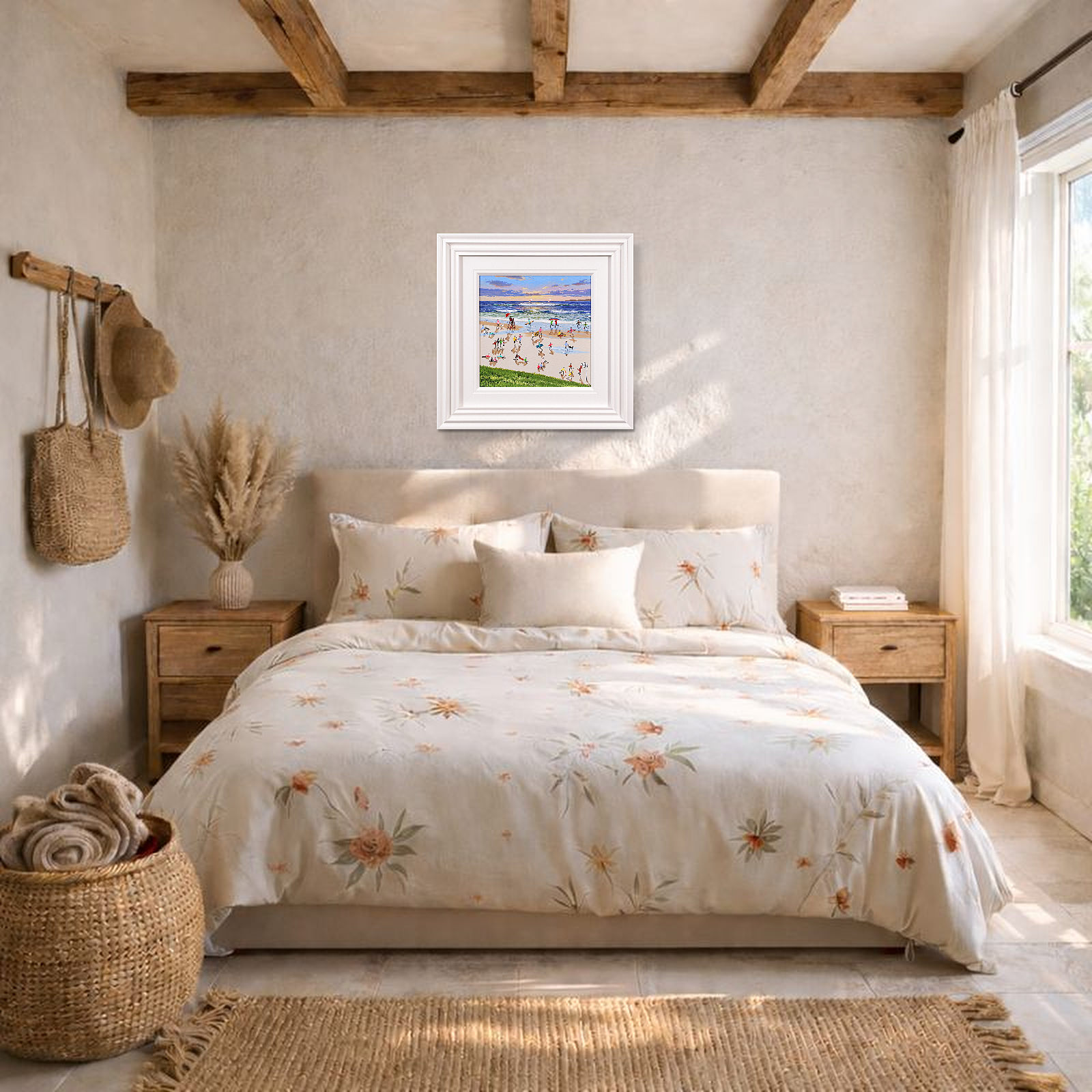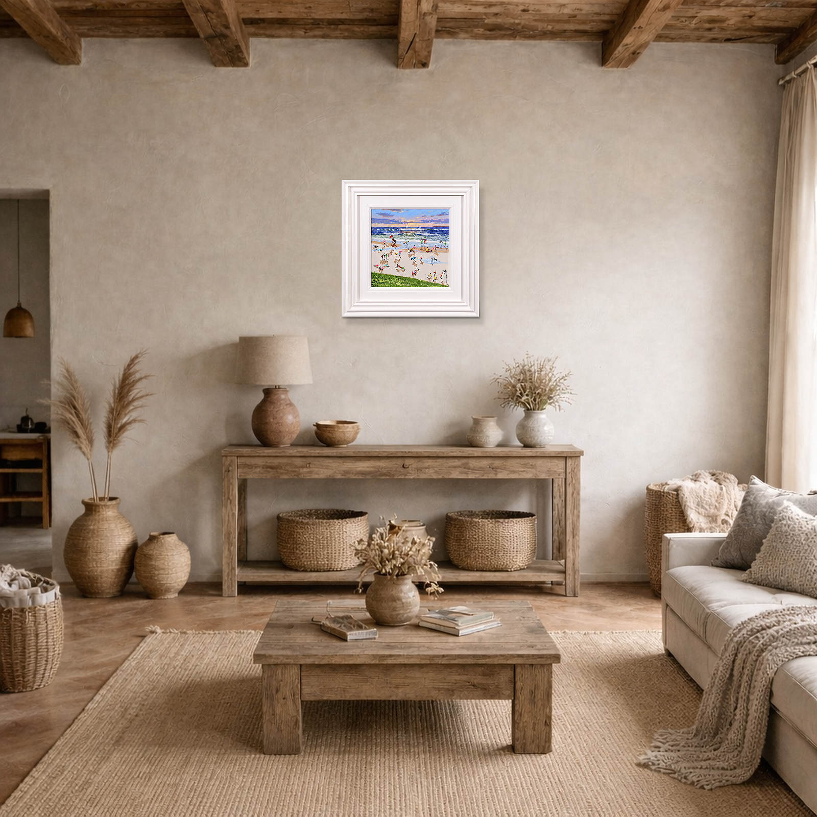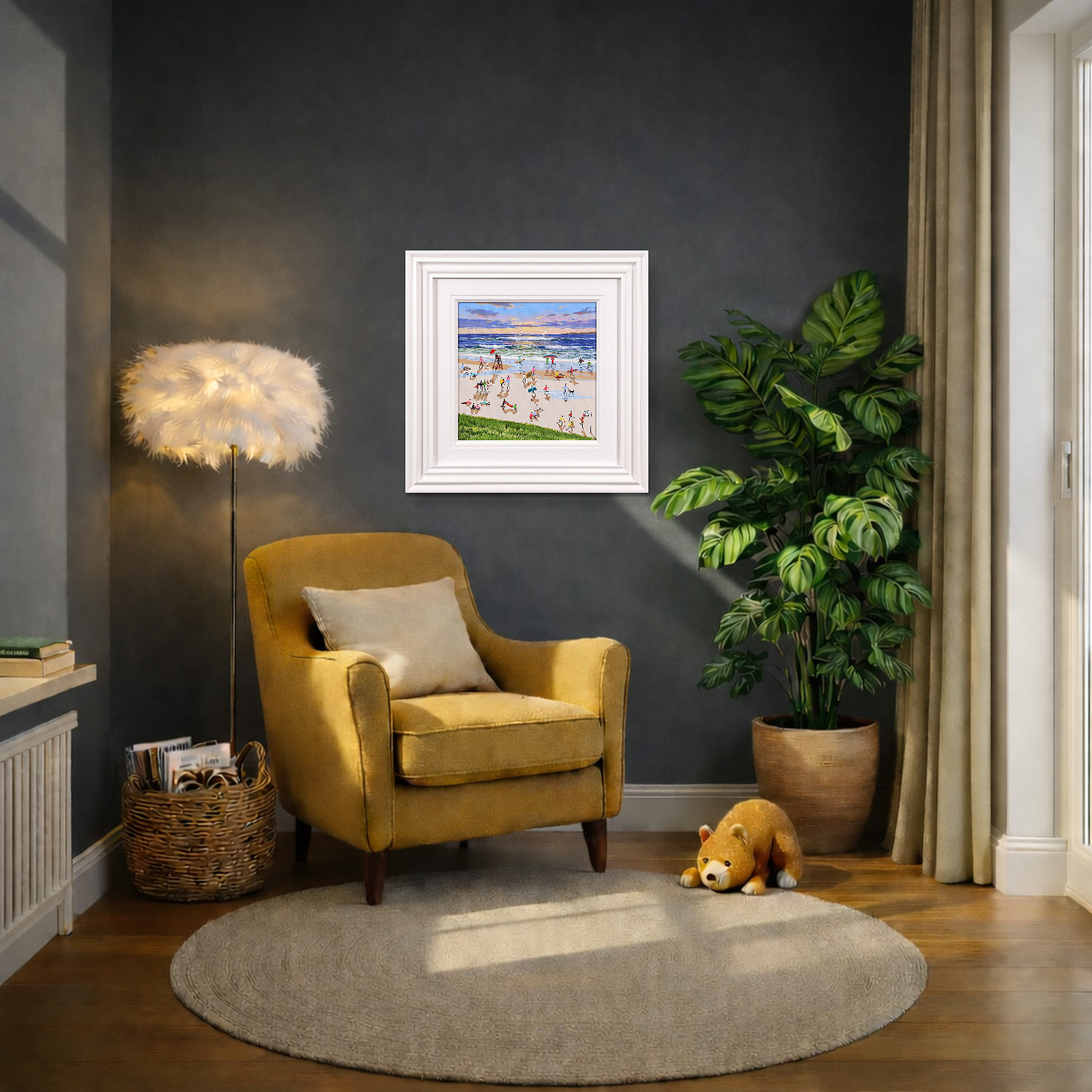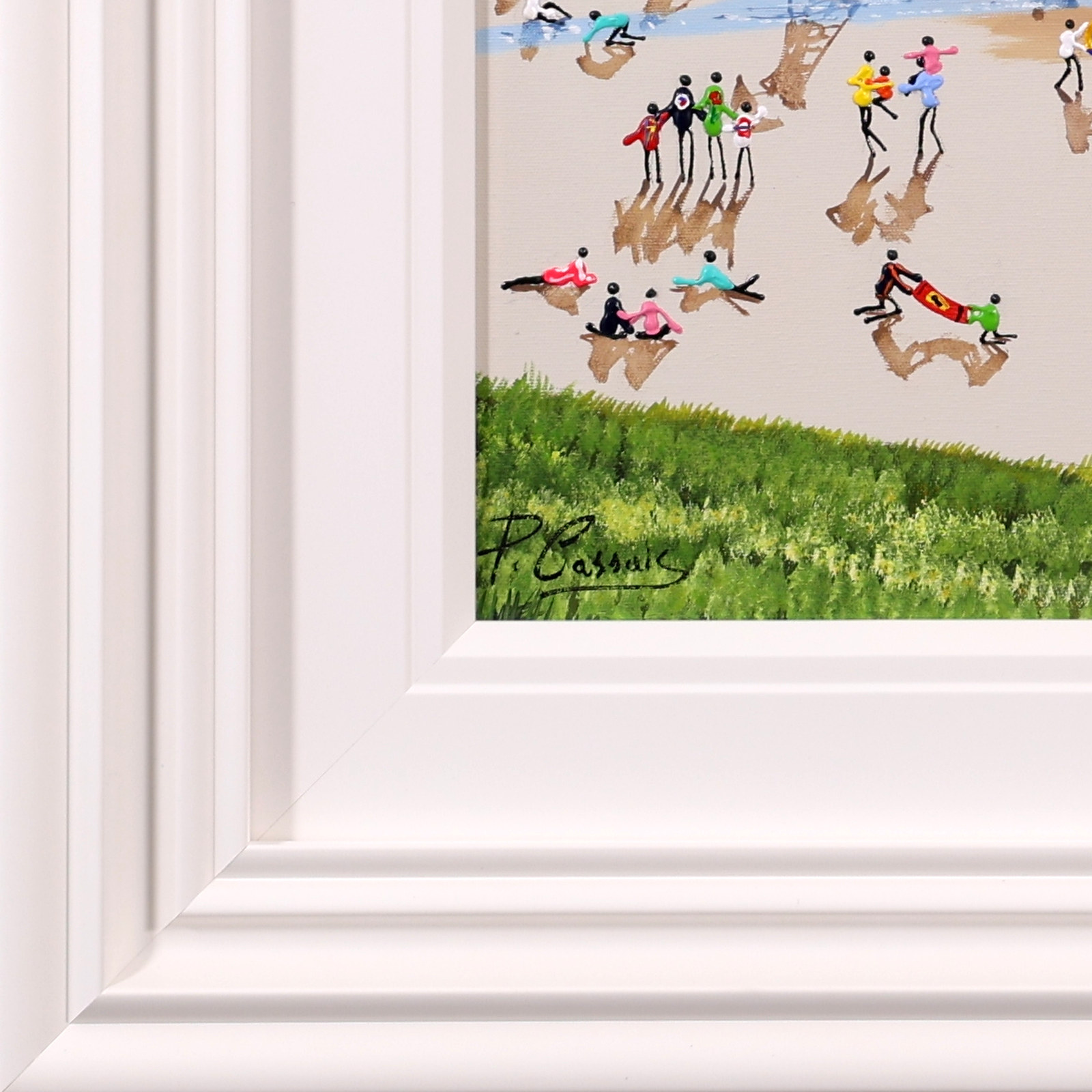 A gorgeous beach style painting by Paola Cassais featuring the artist’s much loved playful figures in 3D. Presented in a wide matt white slip and sculpted frame as pictured.