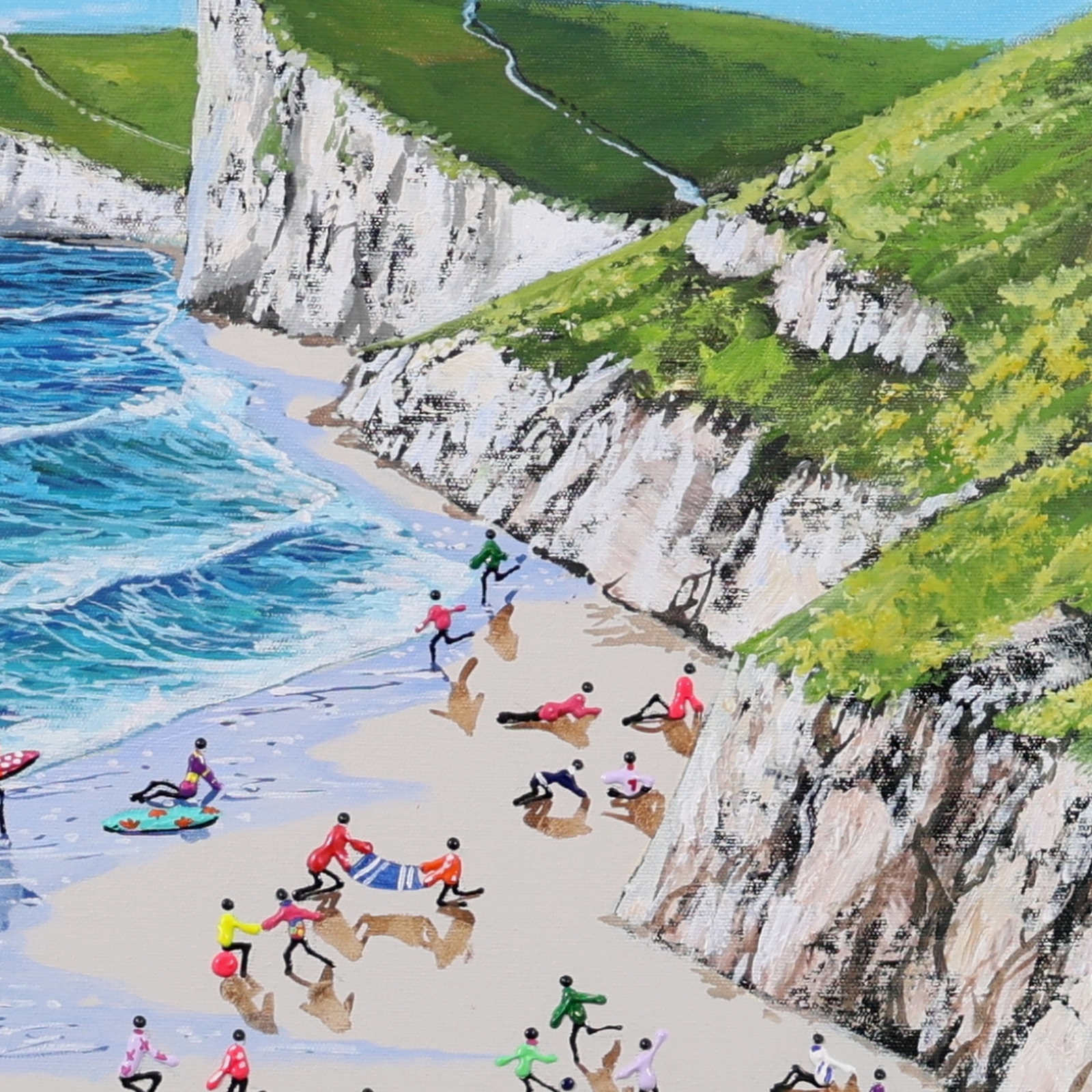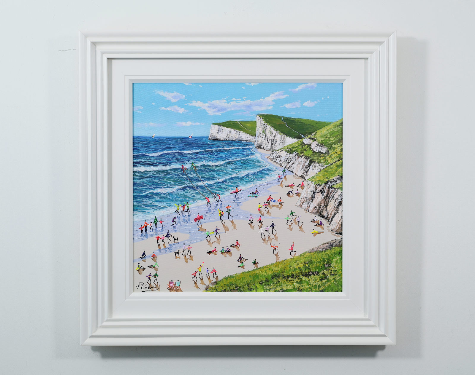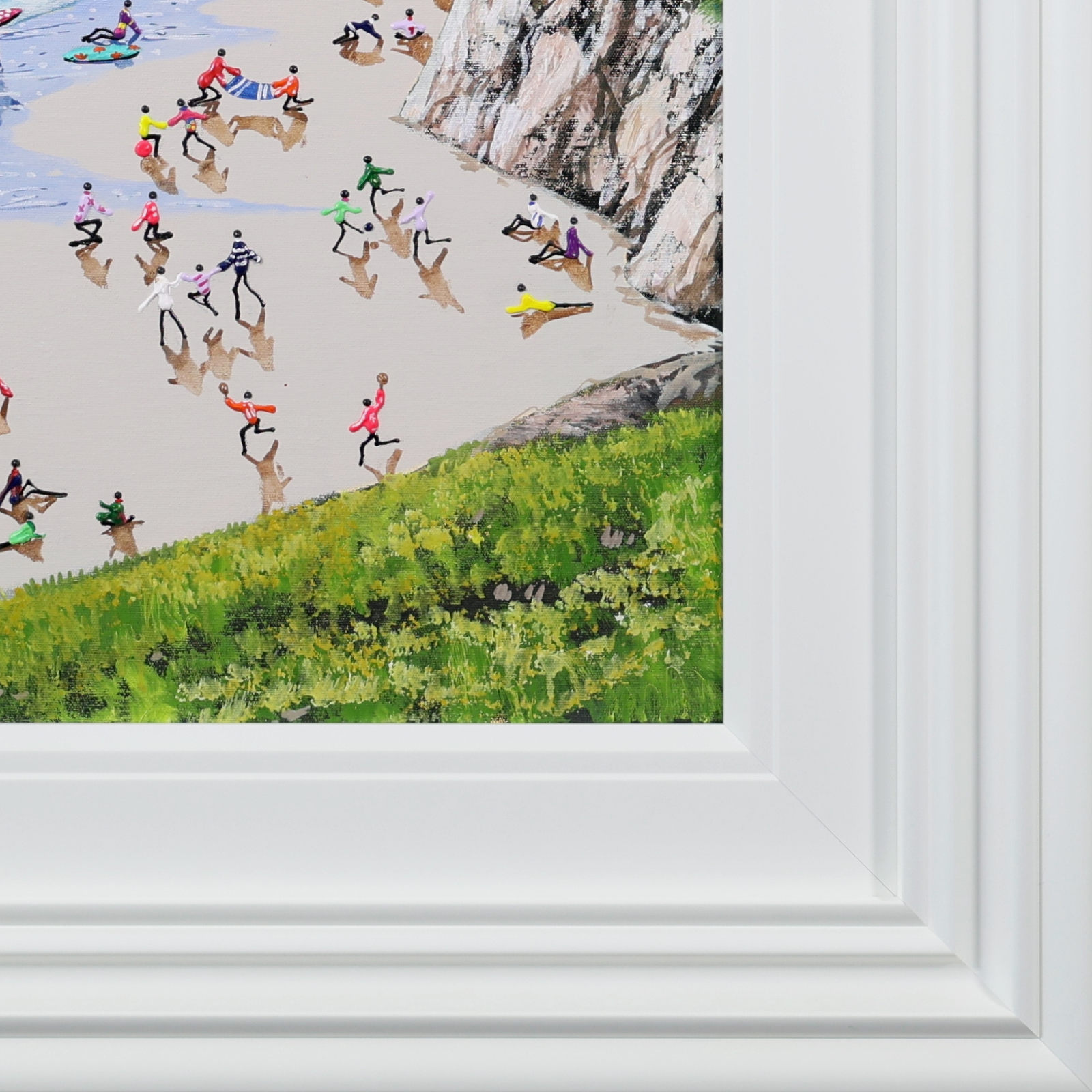 A gorgeous beach style painting by Paola Cassais featuring the artist’s much loved playful figures in 3D. Presented in a wide matt white frame as pictured and ready to hang — ideal for adding warmth to a smaller wall.