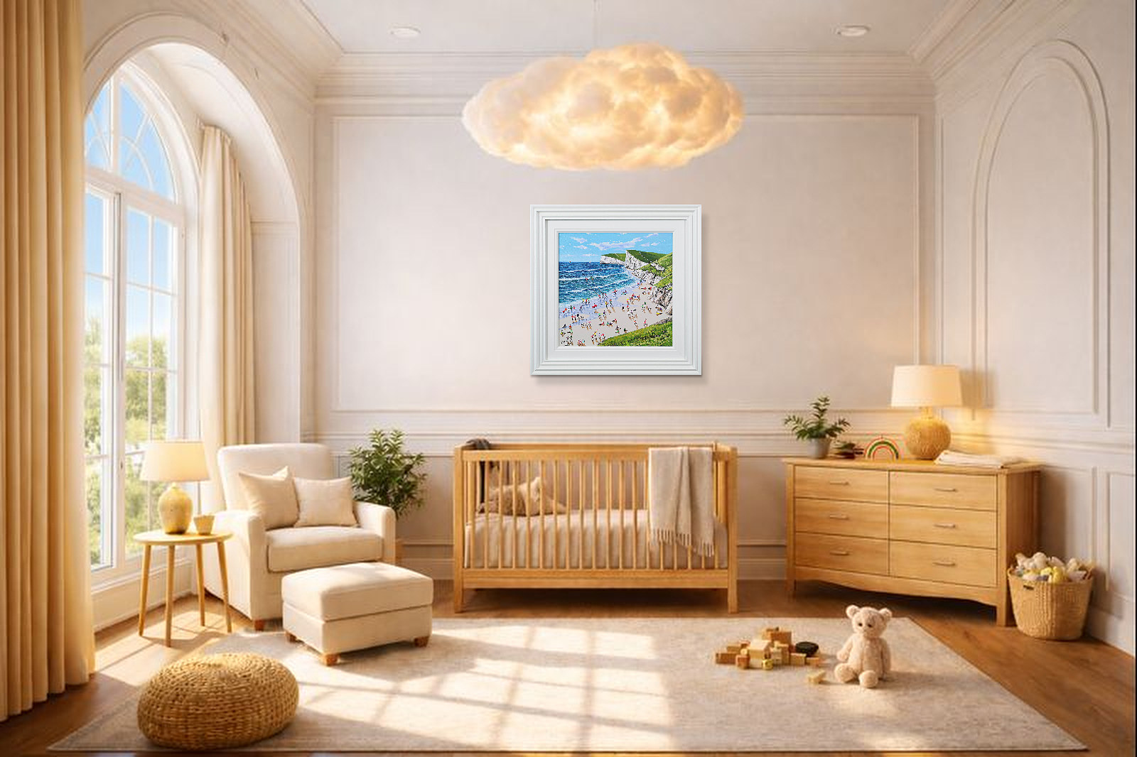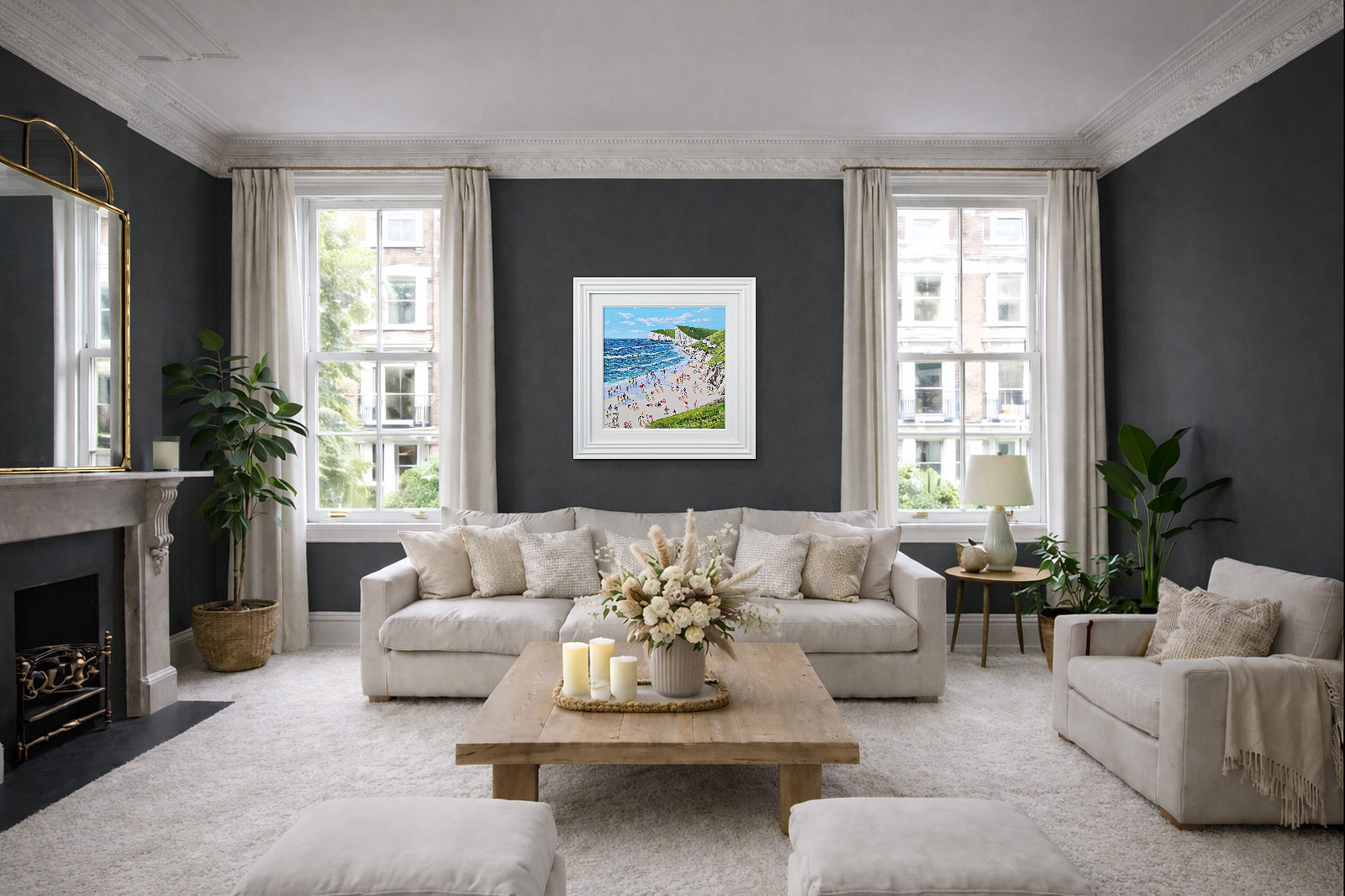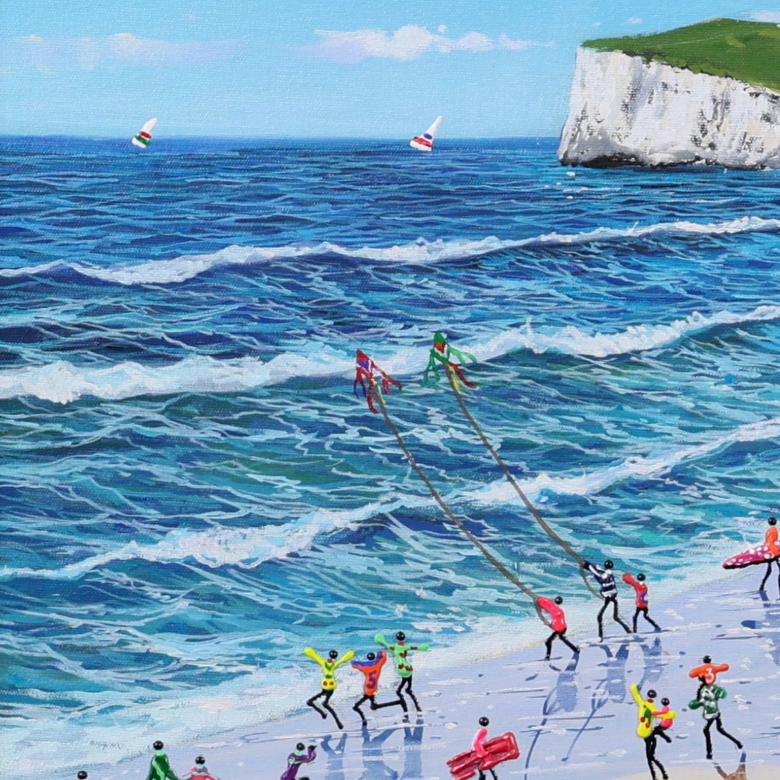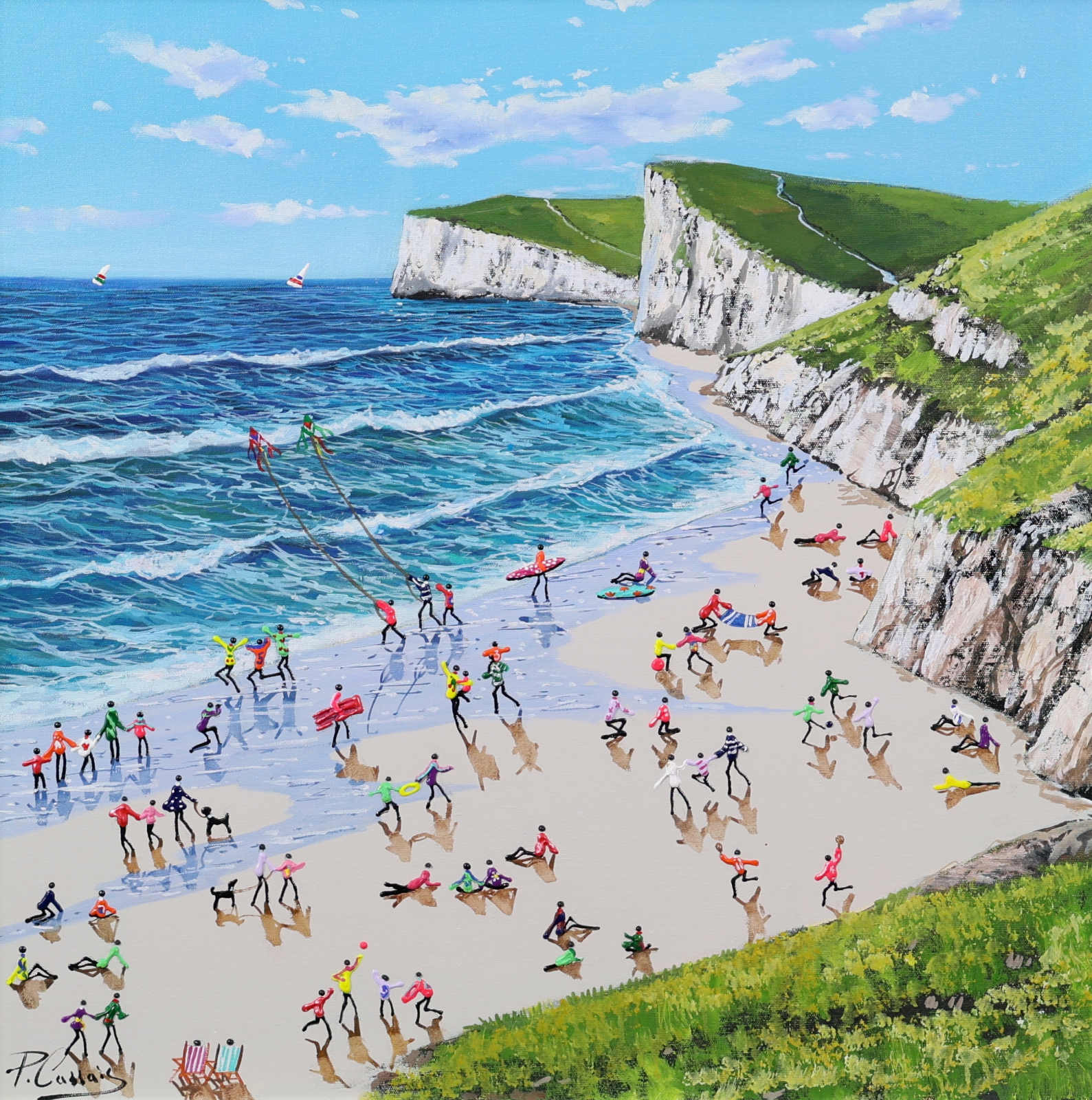A gorgeous beach style painting by Paola Cassais featuring the artist’s much loved playful figures in 3D. Presented in a wide matt white frame as pictured and ready to hang — ideal for adding warmth to a smaller wall.