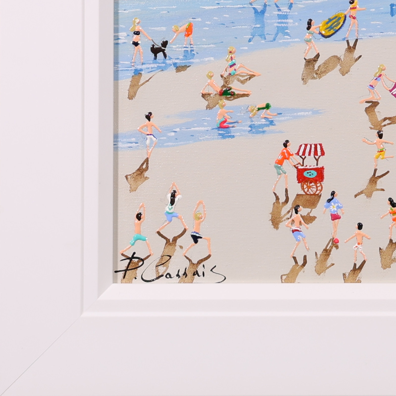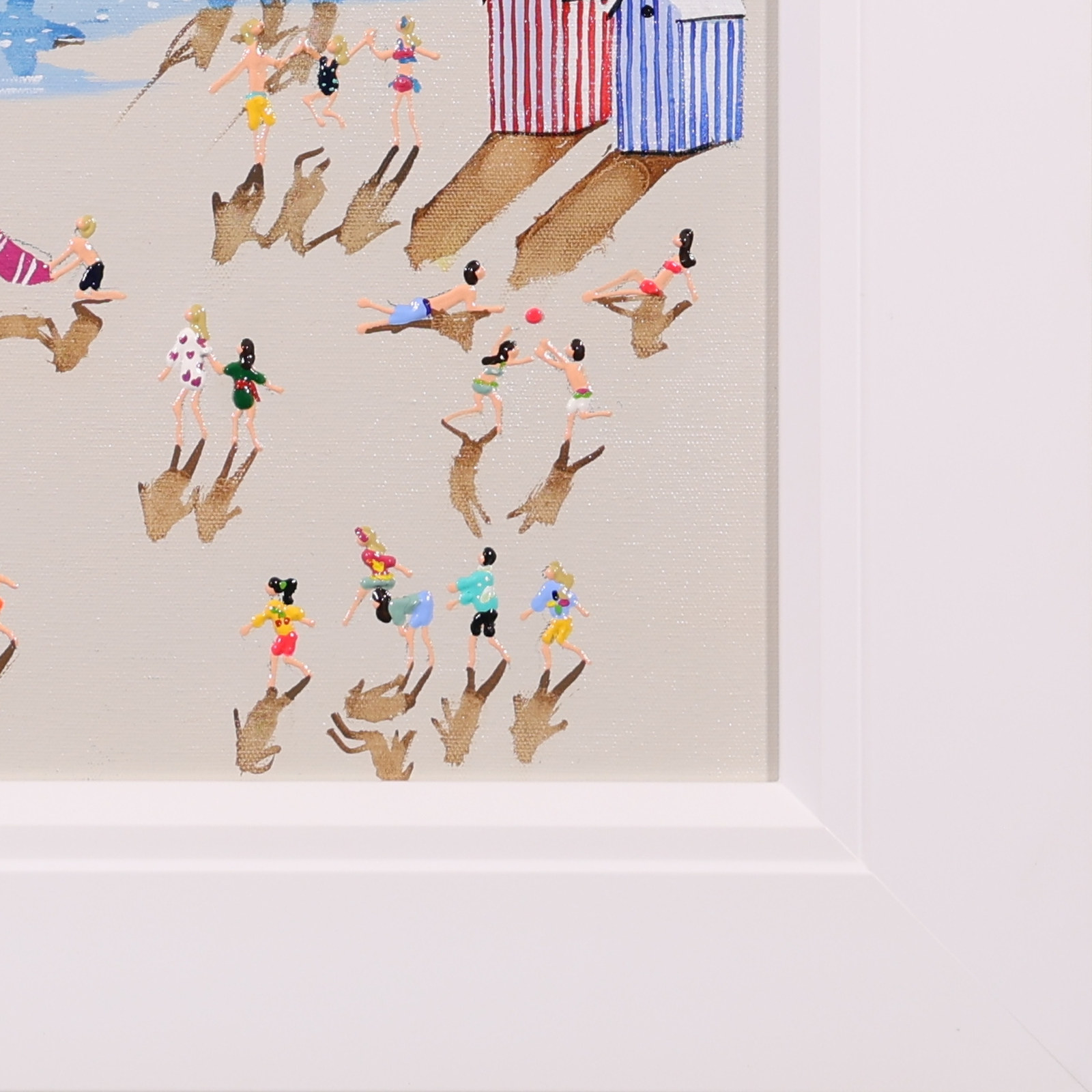 A gorgeous beach style painting by Paola Cassais featuring the artist’s much loved playful figures in 3D. Presented in a wide matt white frame as pictured and ready to hang — ideal for adding warmth to a smaller wall.
