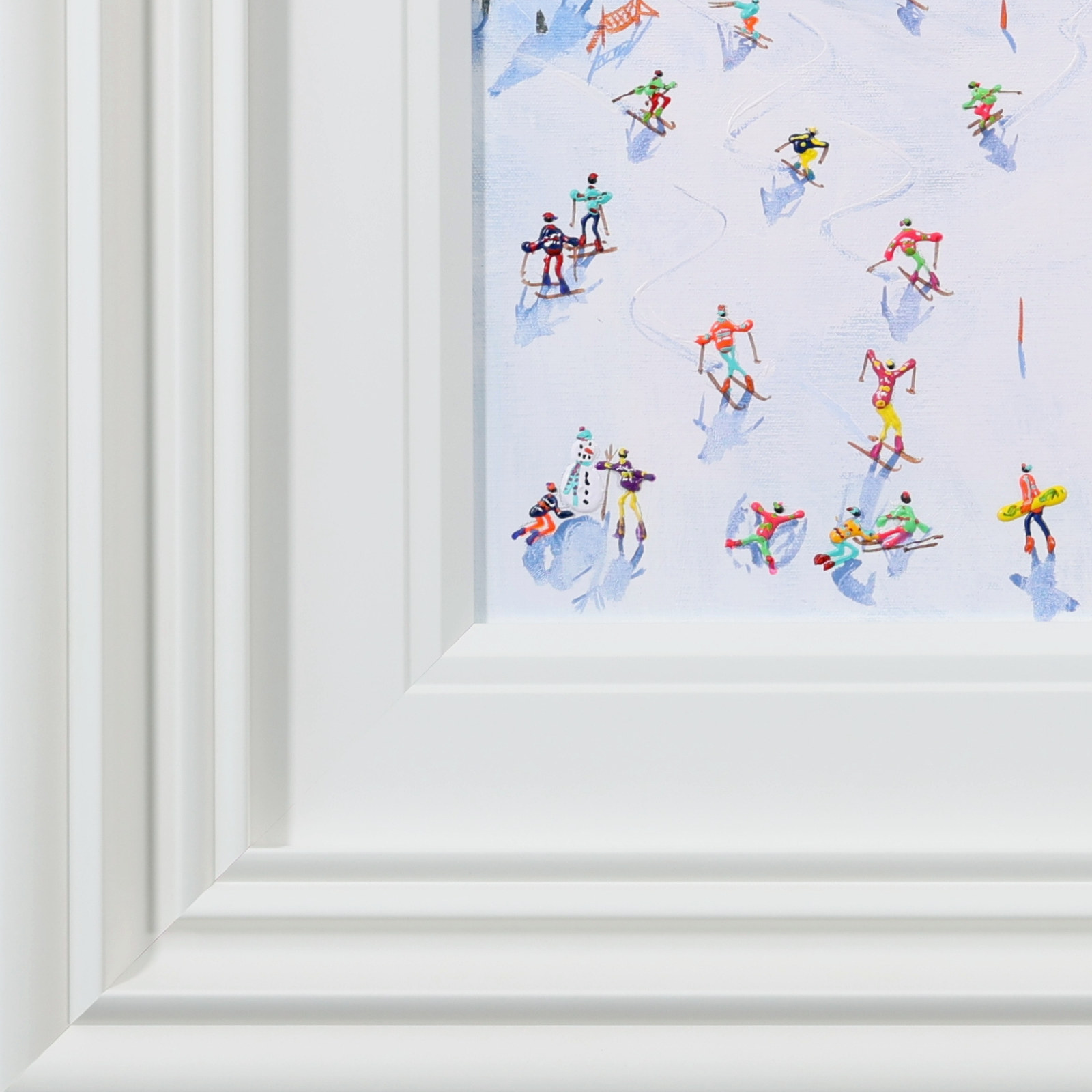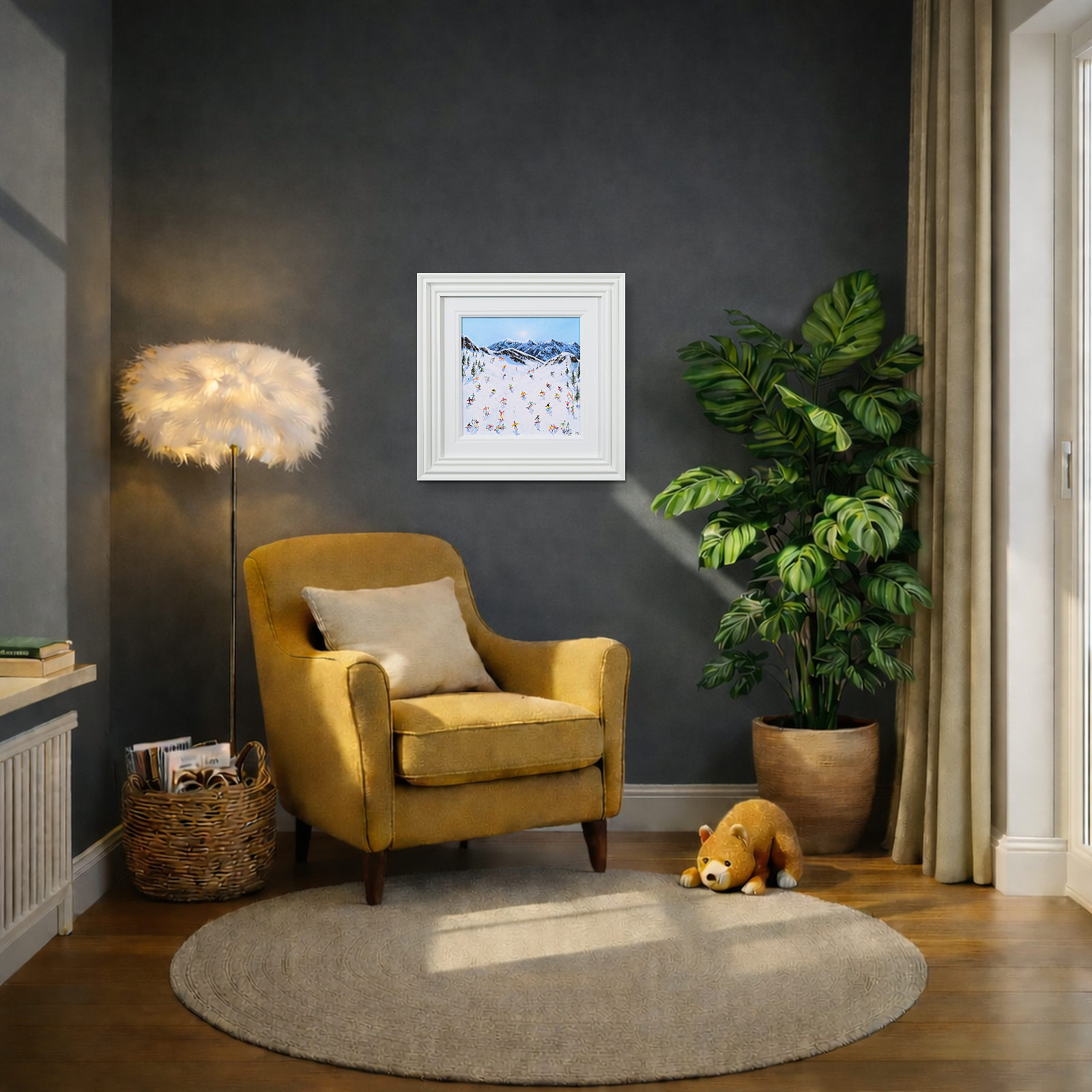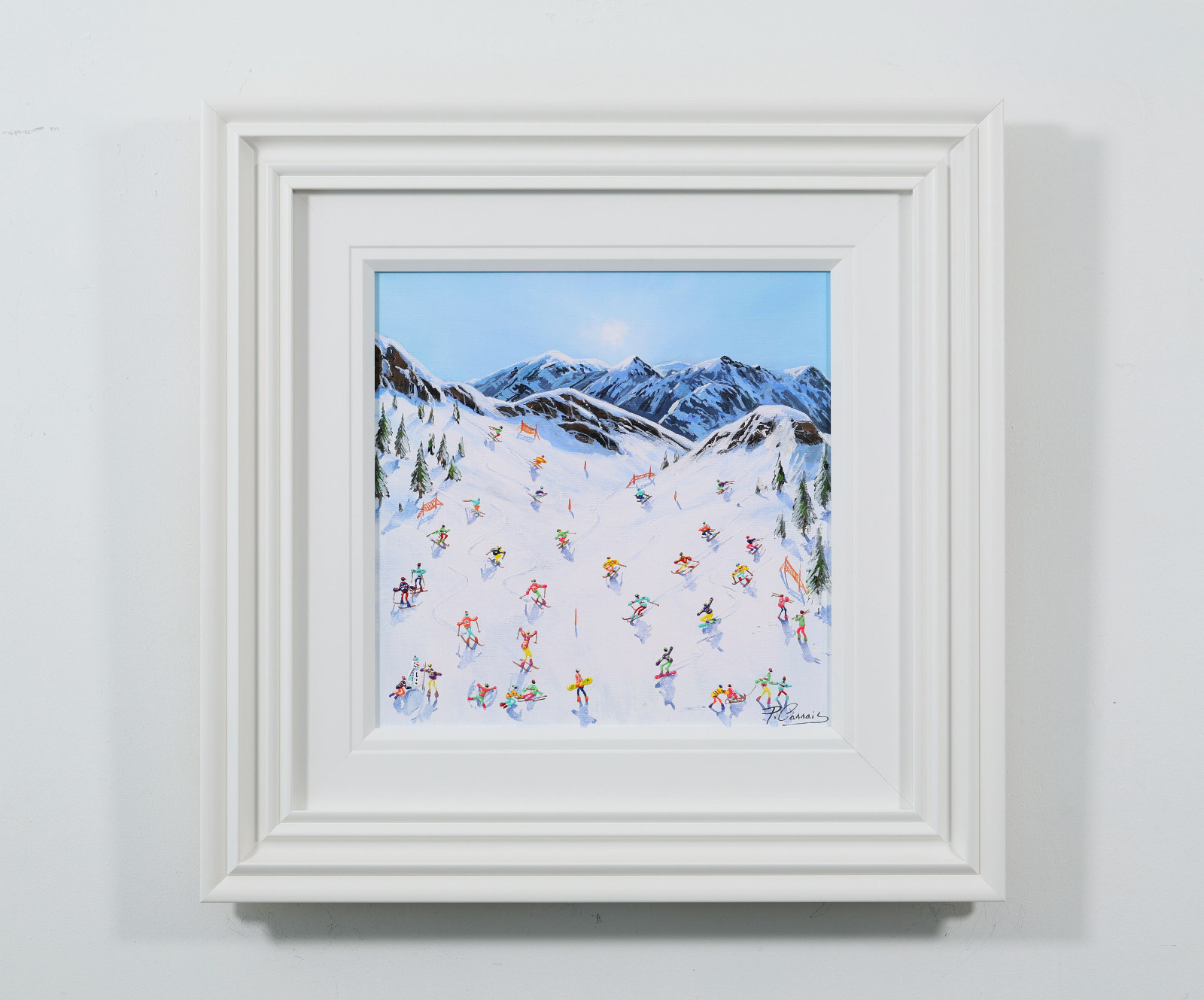 A joyful winter scene by Paola Cassais capturing skiers weaving through crisp white slopes beneath a brilliant blue sky. Full of movement and charm, this small original is beautifully presented in a wide matt white frame as pictured and ready to hang — perfect for that smaller space.