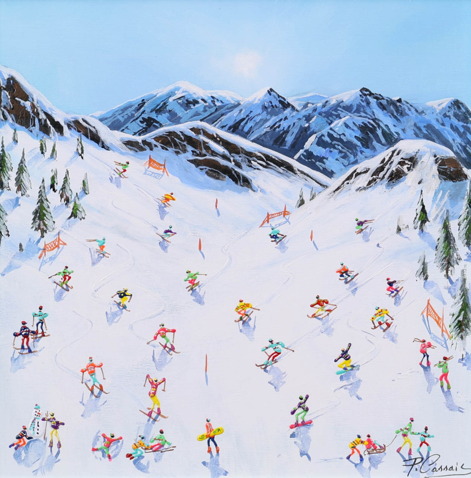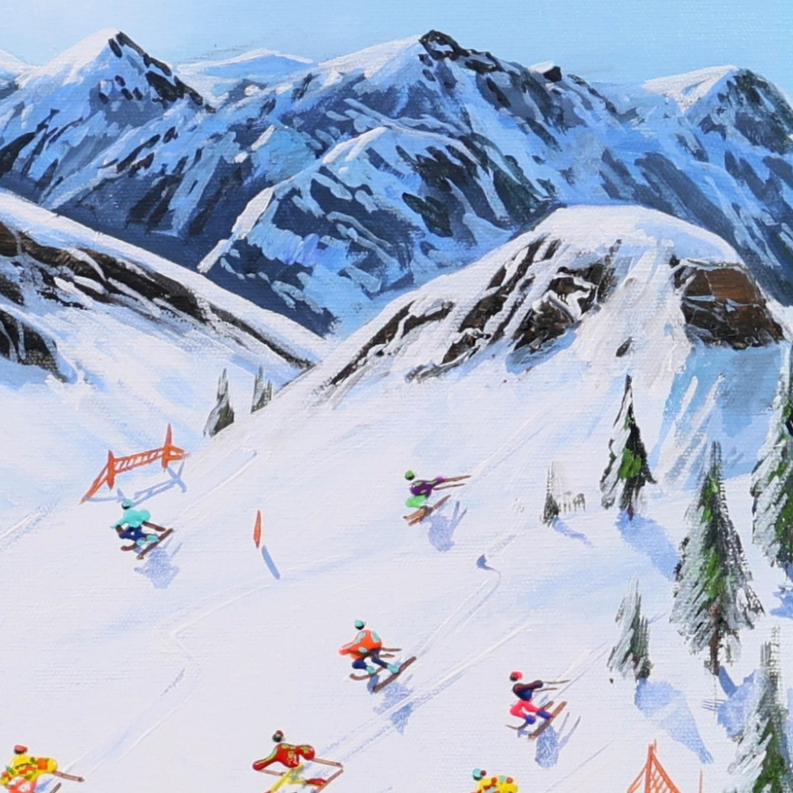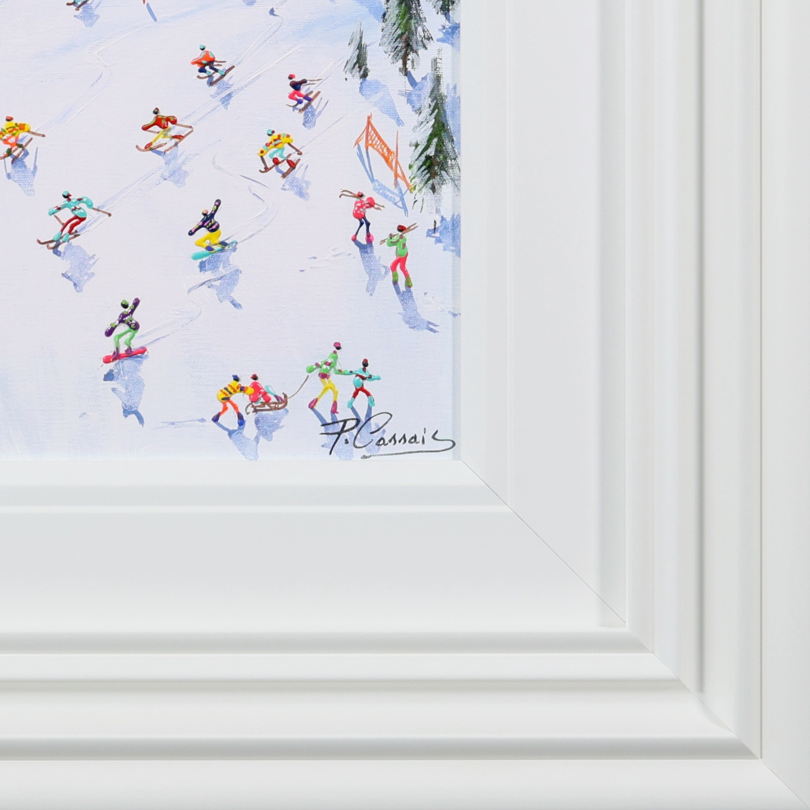 A joyful winter scene by Paola Cassais capturing skiers weaving through crisp white slopes beneath a brilliant blue sky. Full of movement and charm, this small original is beautifully presented in a wide matt white frame as pictured and ready to hang — perfect for that smaller space.