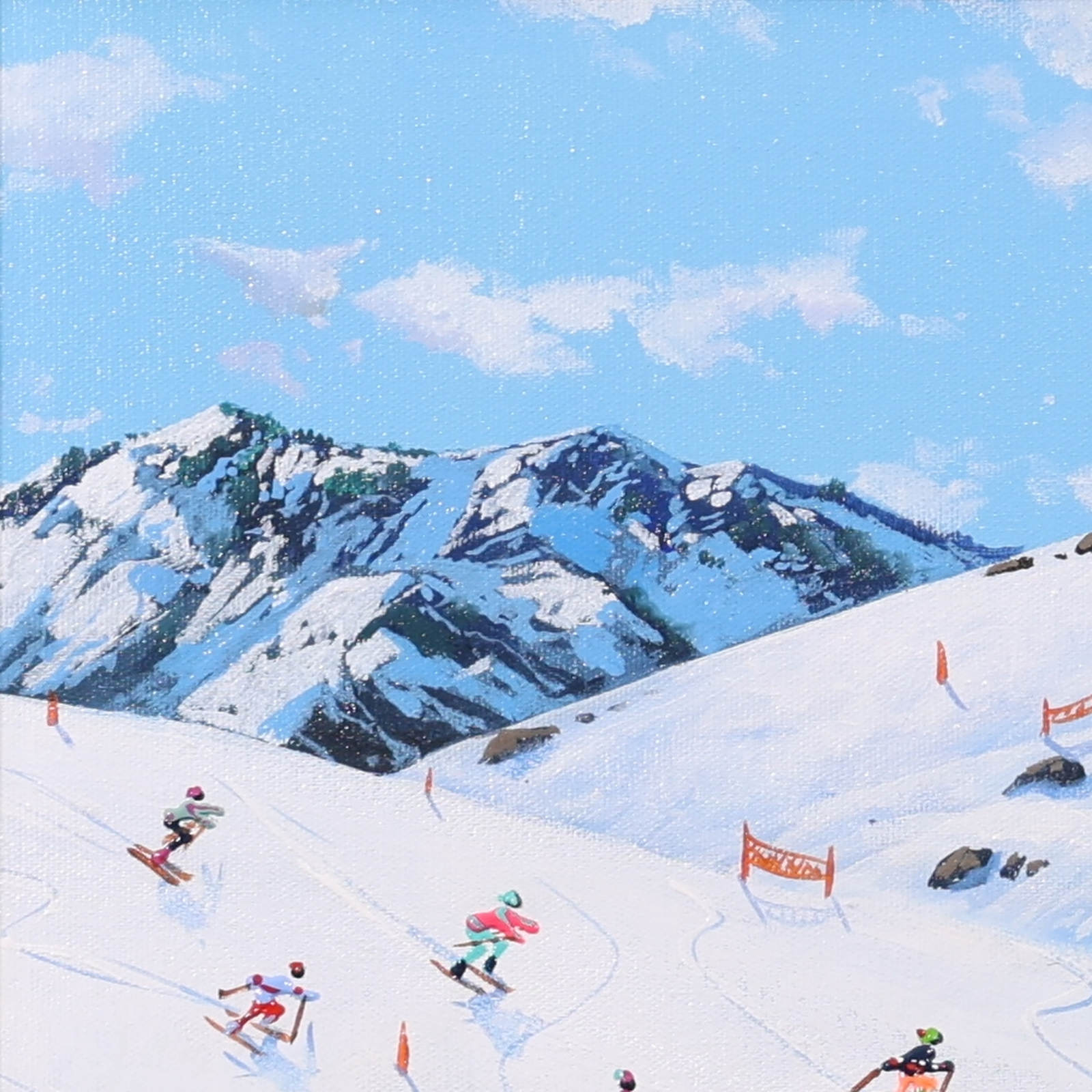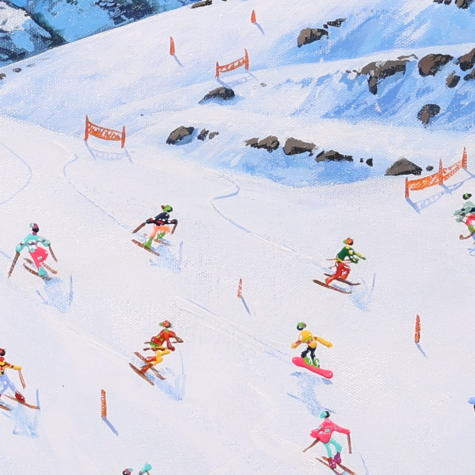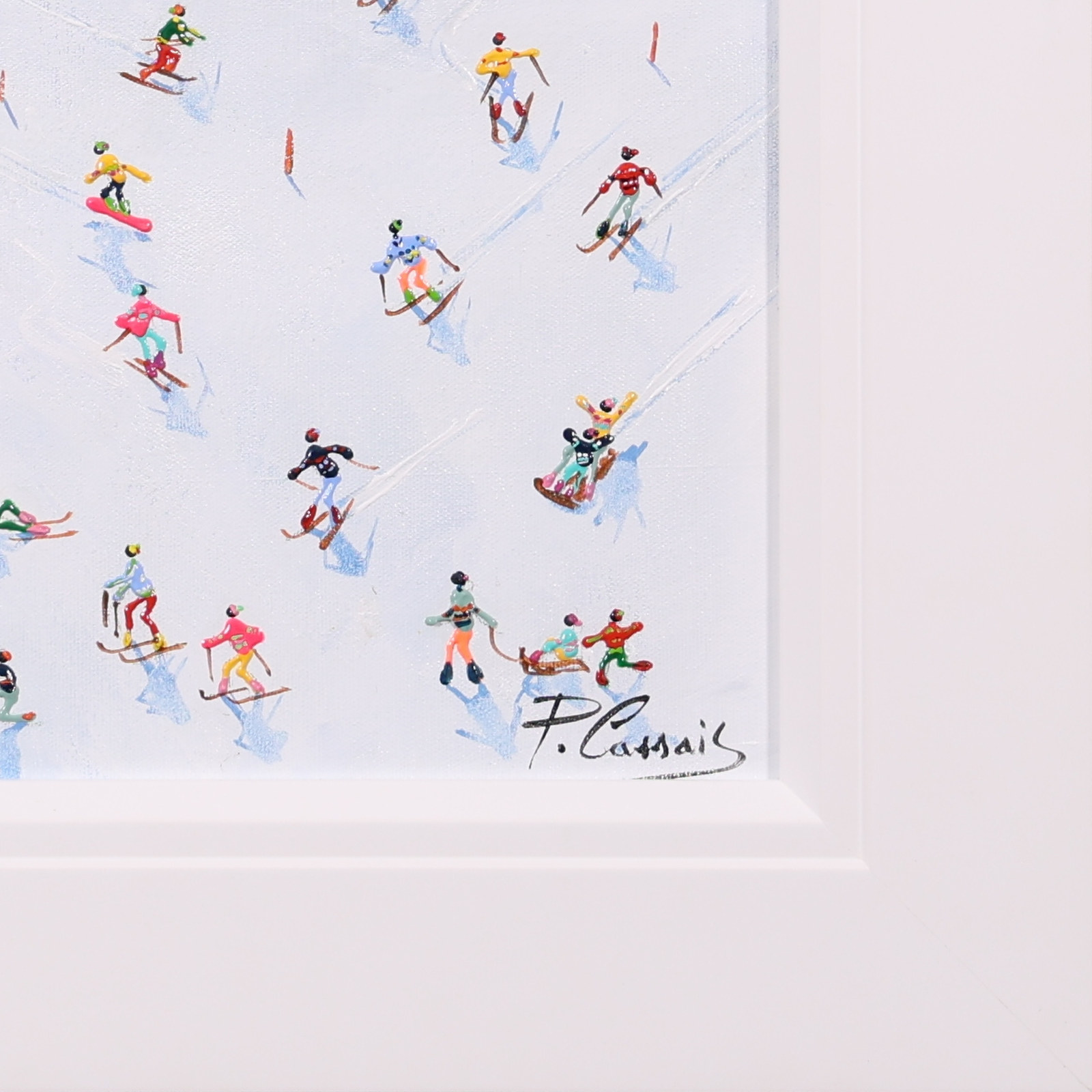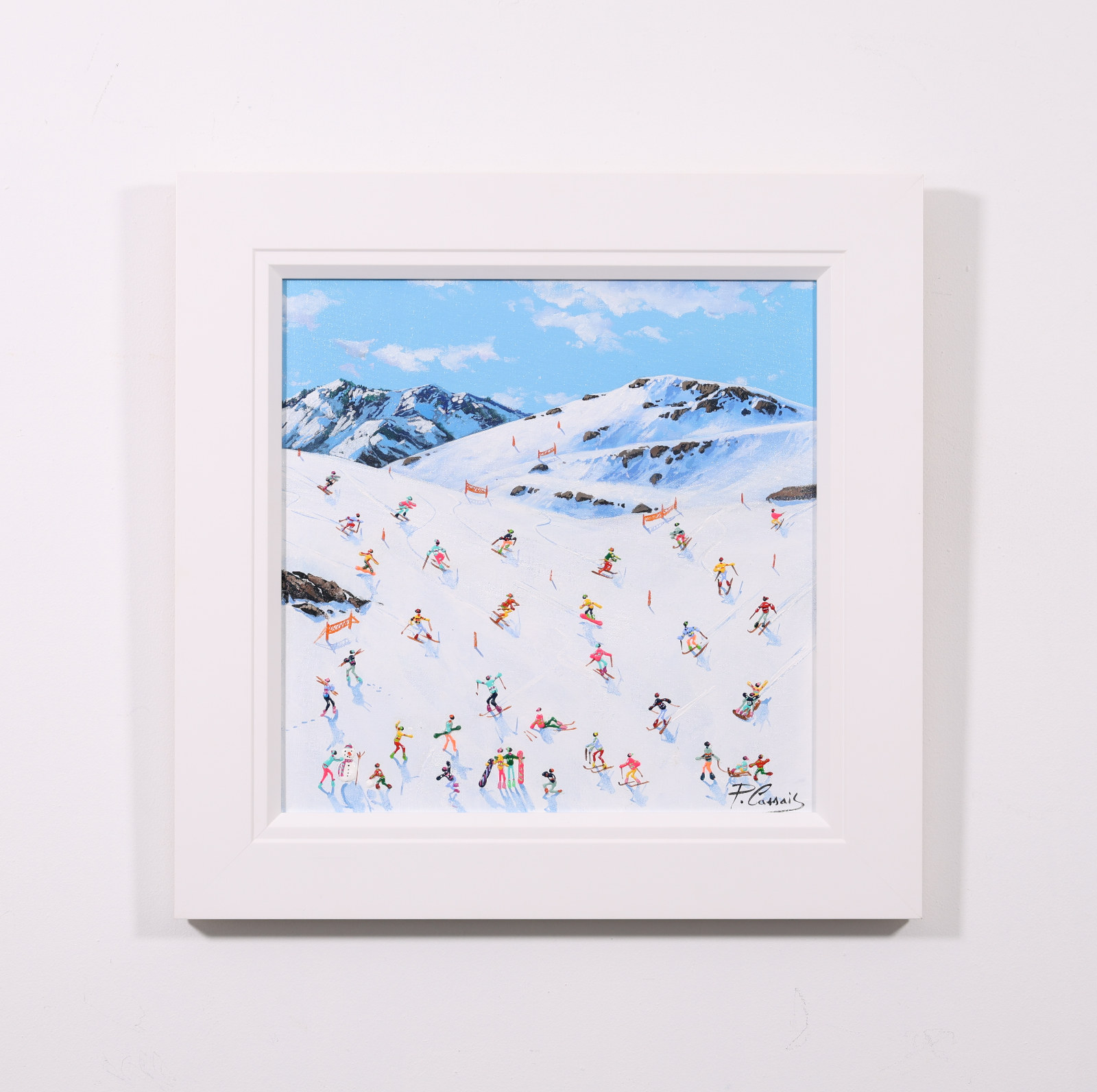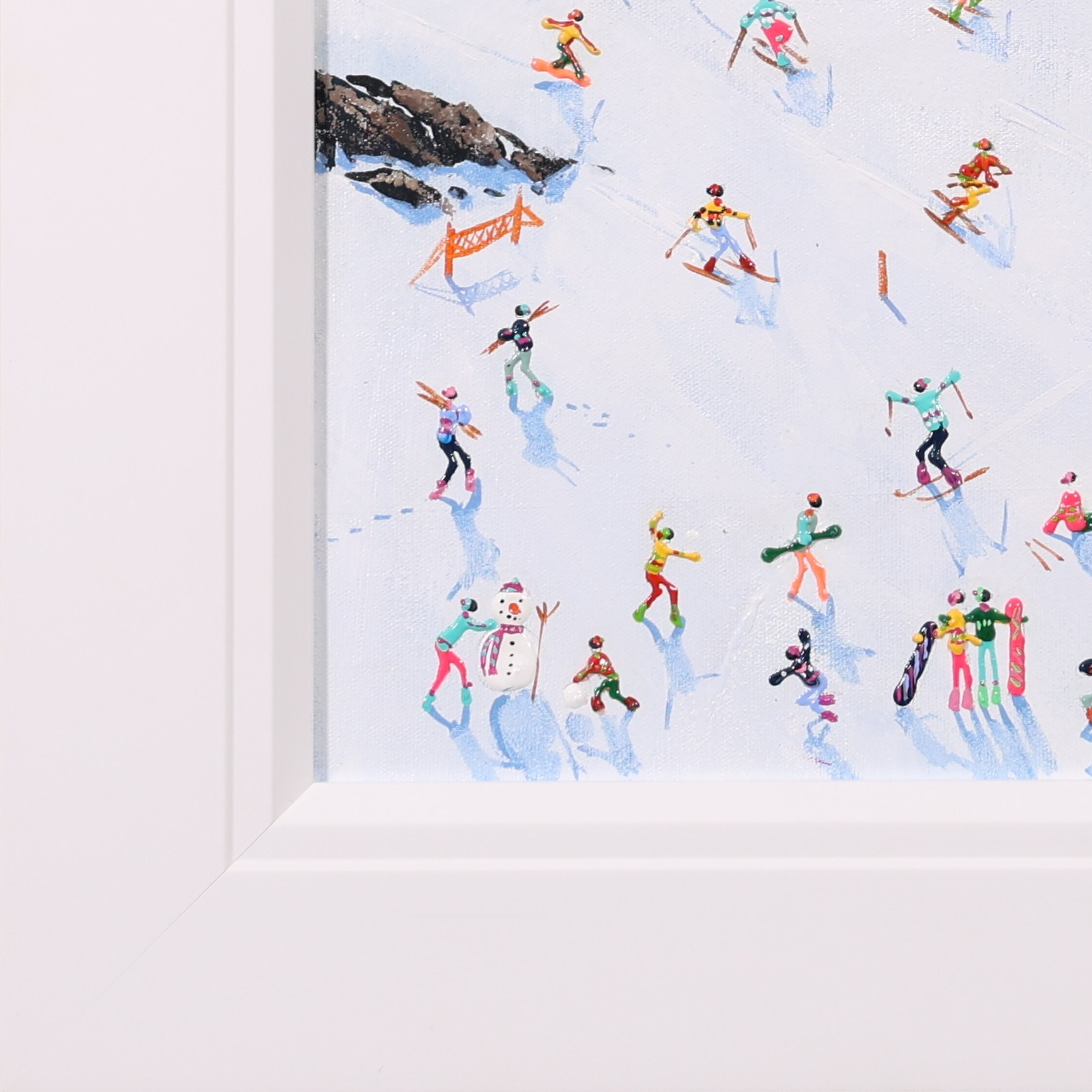 Fresh powder and colourful figures bring this delightful alpine composition to life. Paola Cassais’ signature naïve style lends warmth and character to the snowy landscape. Presented in a wide matt white frame as pictured and ready to hang.