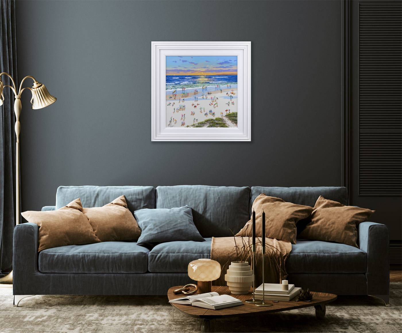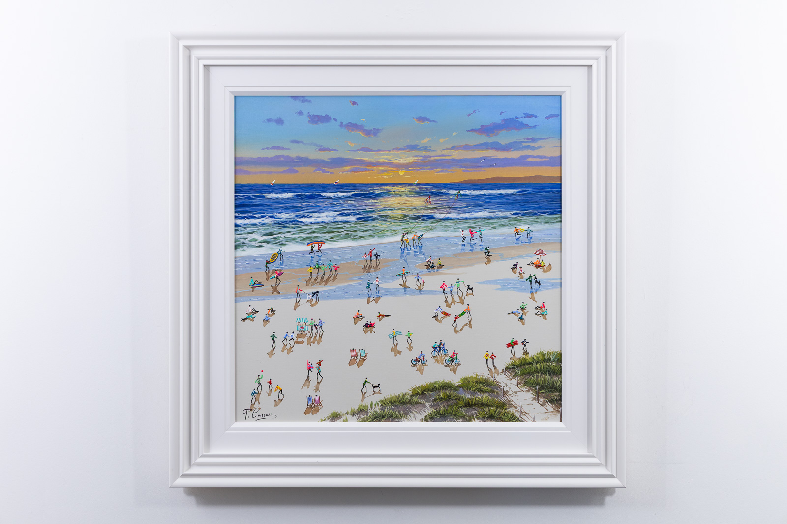 An original painting by Paola Cassais featuring the artist’s joyful little people on the beach. The piece is three-dimensional with thick paint and is presented framed with a white slip and outer frame as shown.