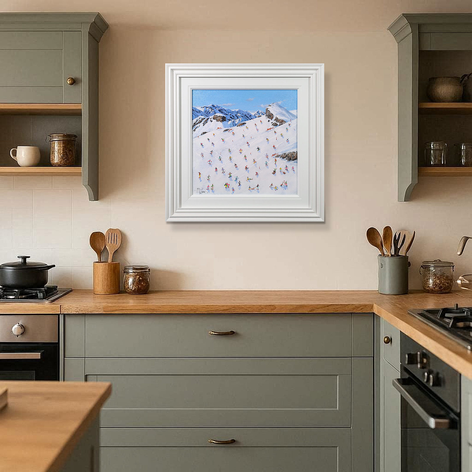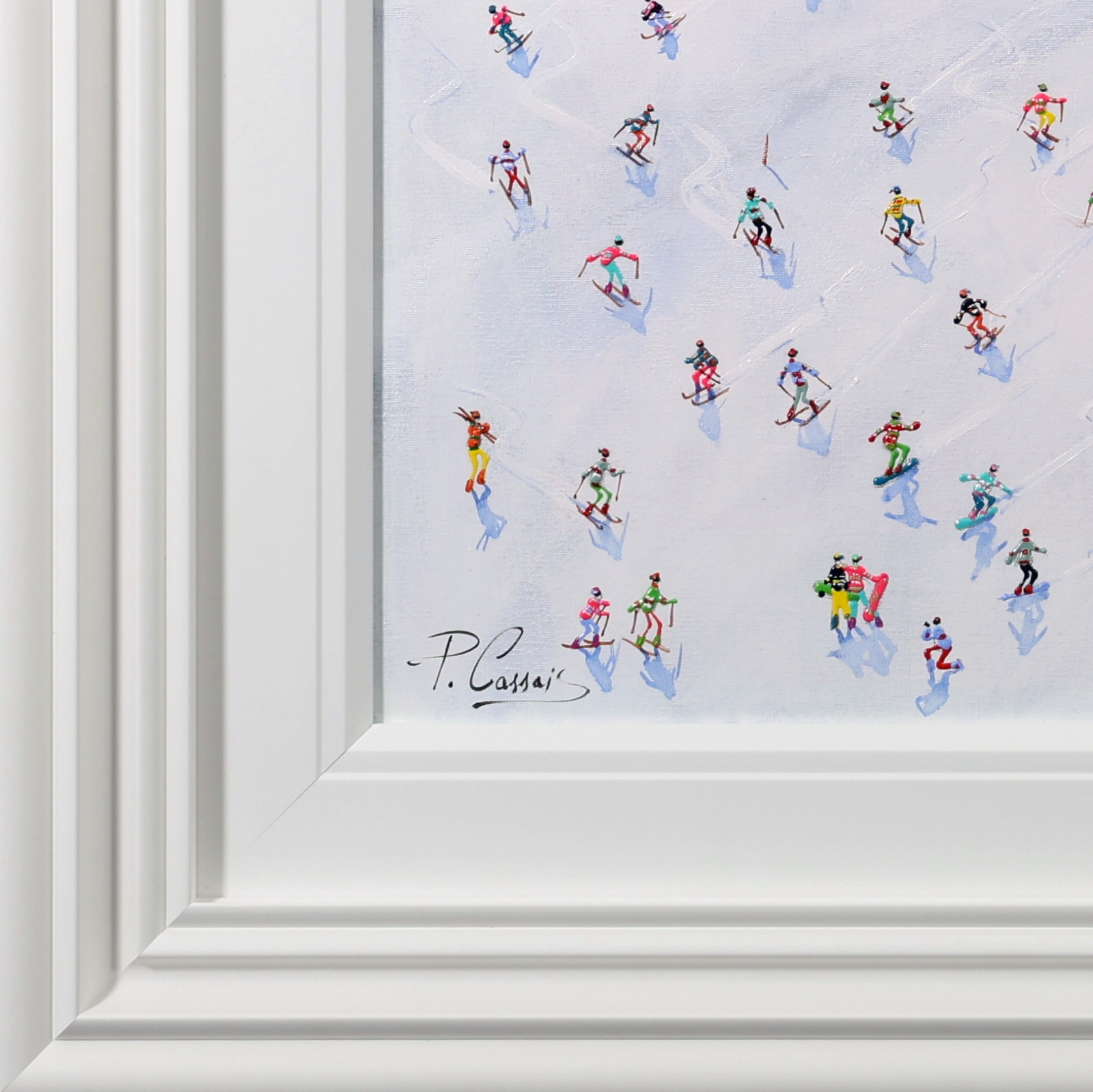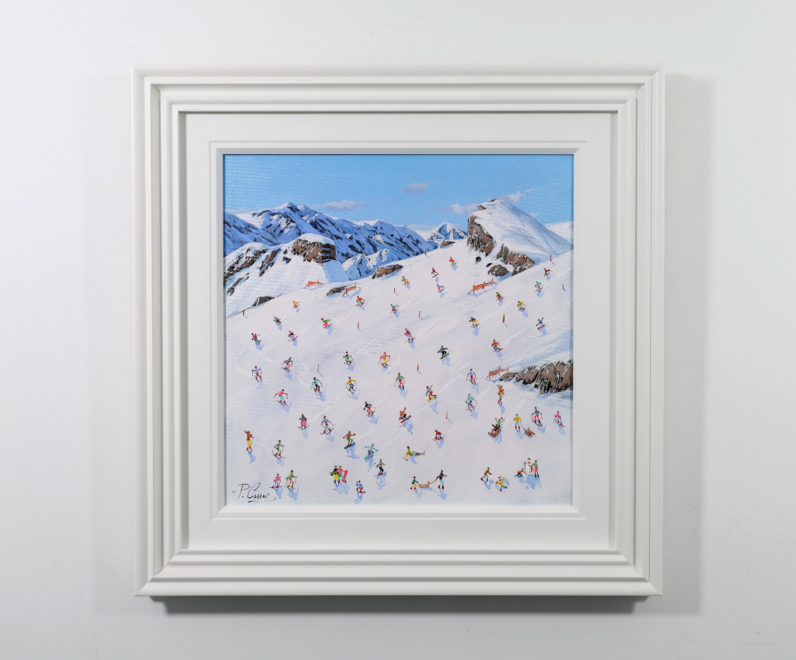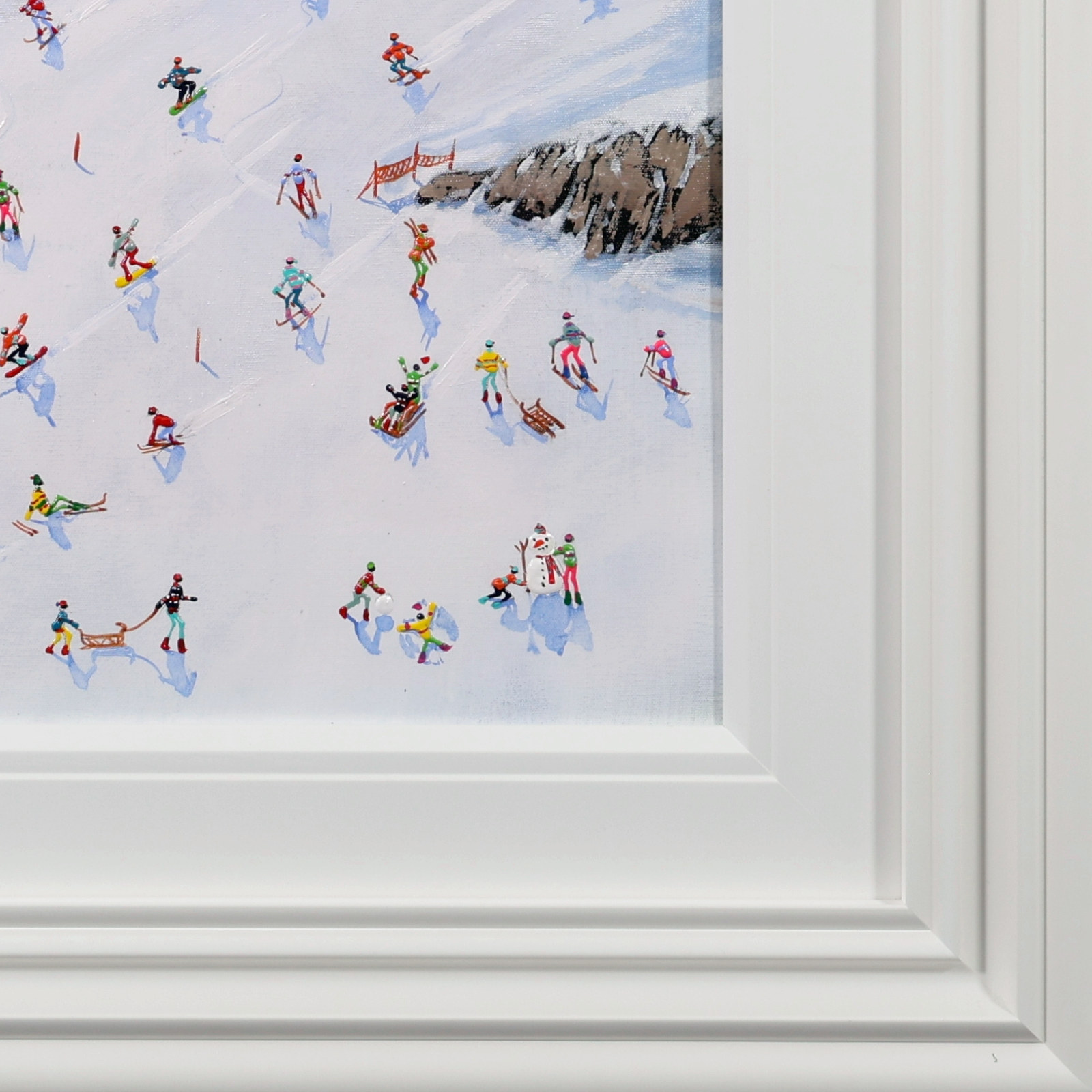 A lively alpine painting by Paola Cassais capturing the energy of the ski season in her distinctive three-dimensional style. Presented in a matt white slip and sculpted frame as pictured and ready to hang.