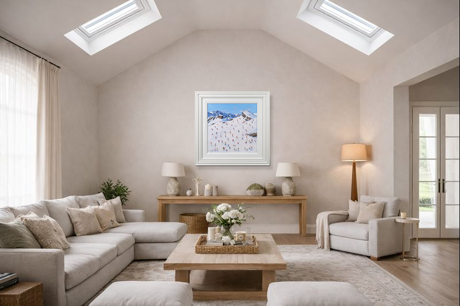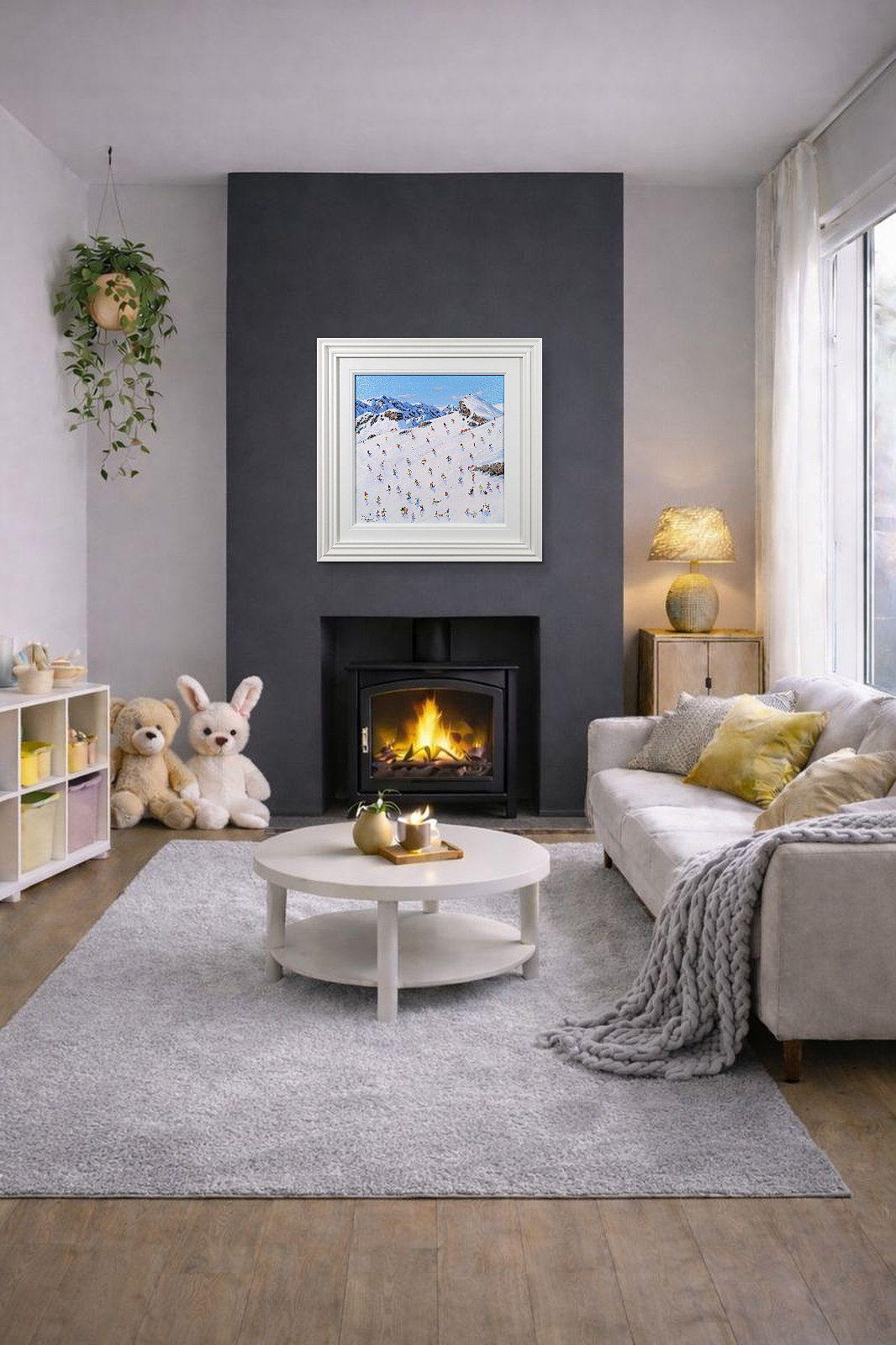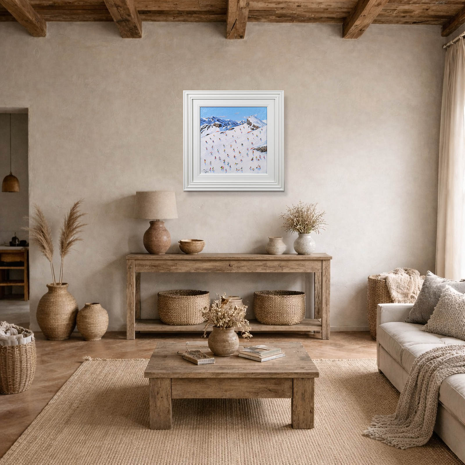 A lively alpine painting by Paola Cassais capturing the energy of the ski season in her distinctive three-dimensional style. Presented in a matt white slip and sculpted frame as pictured and ready to hang.