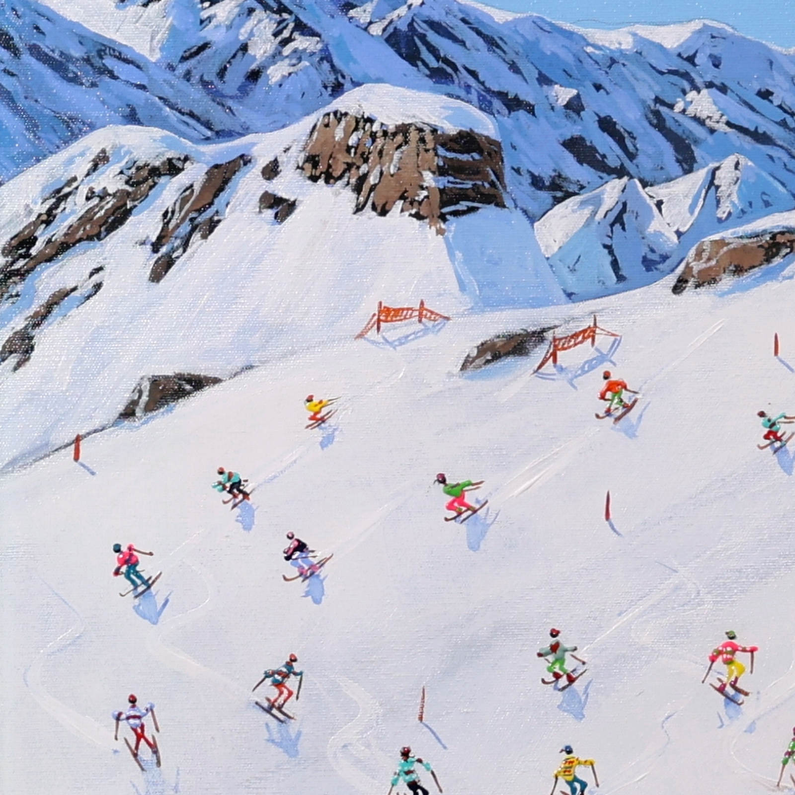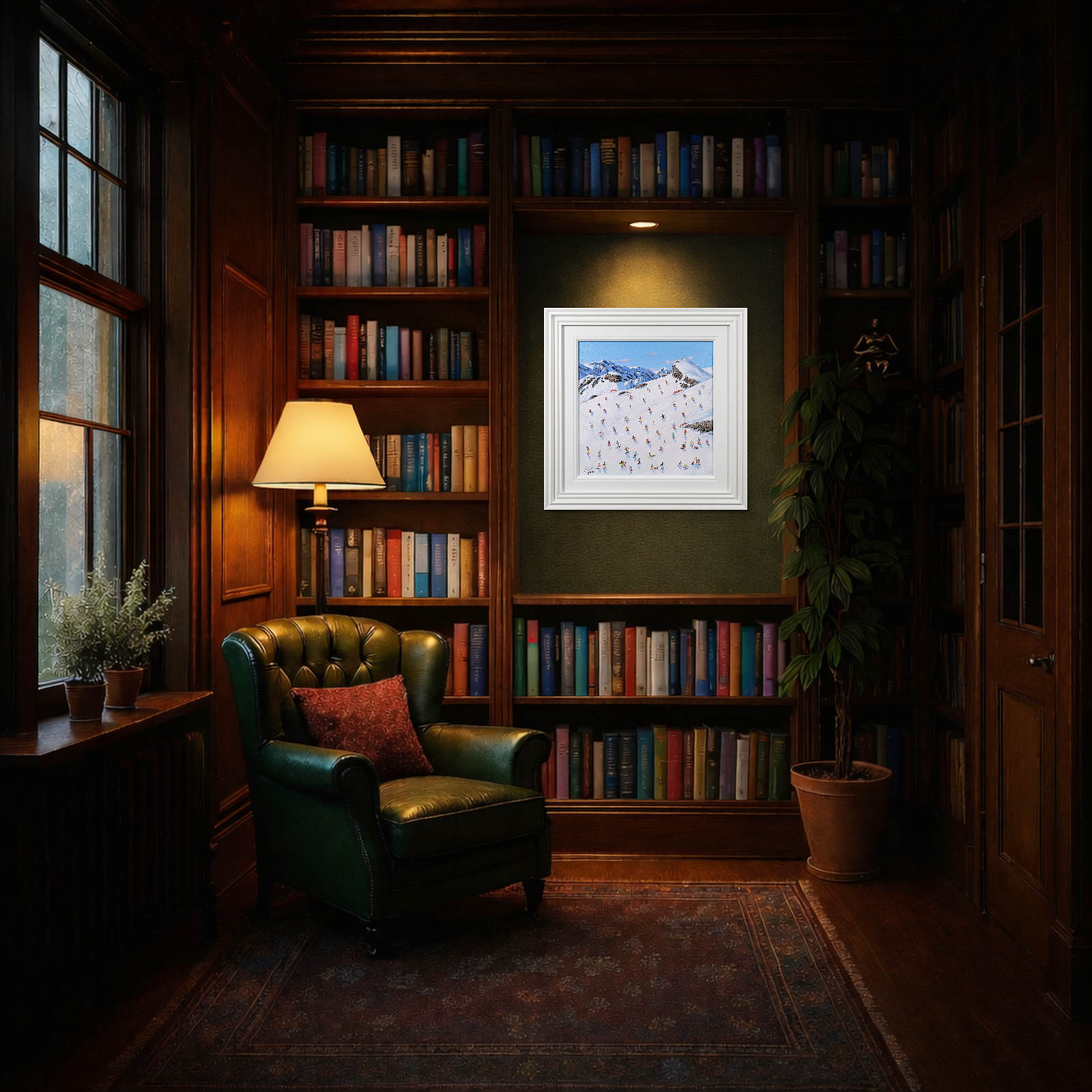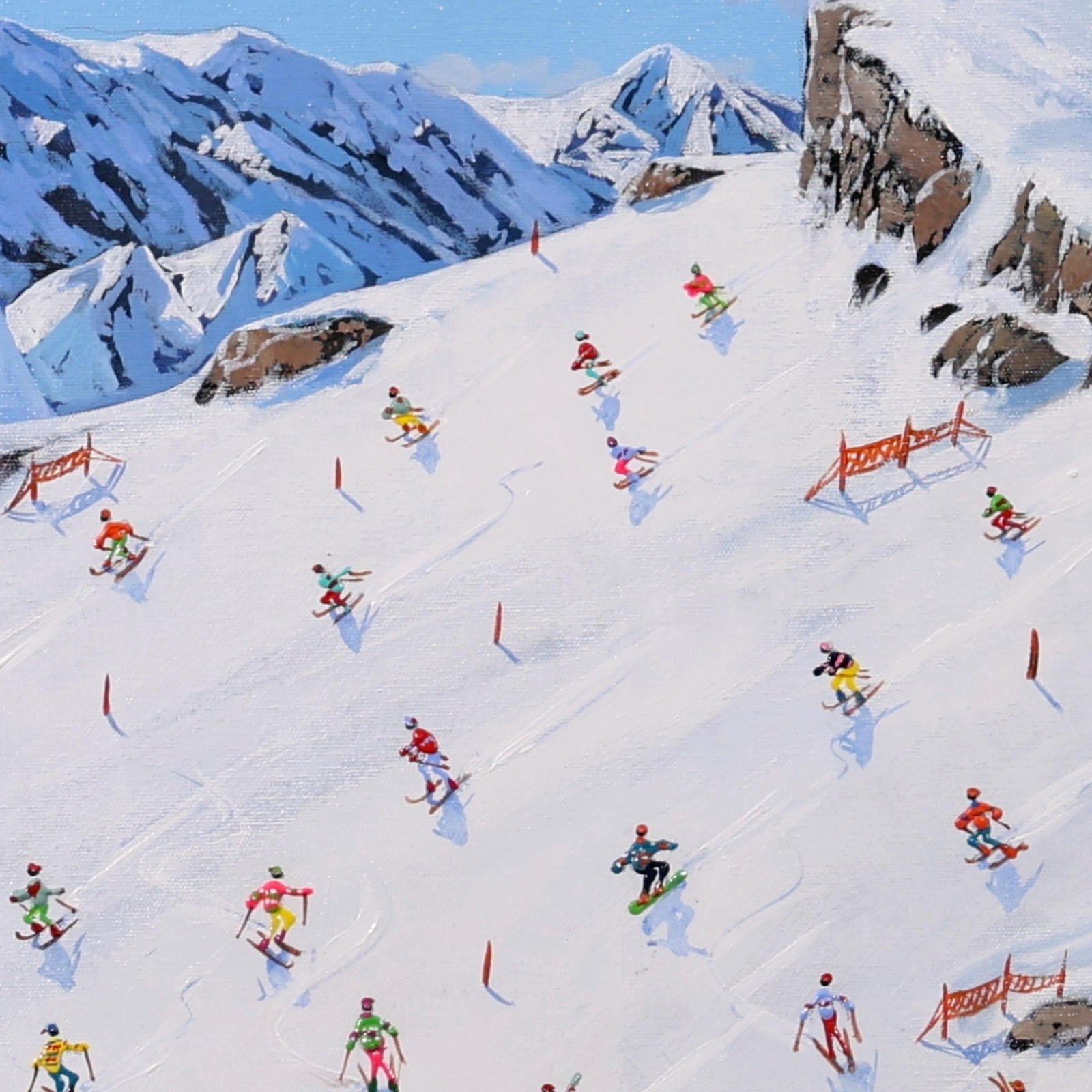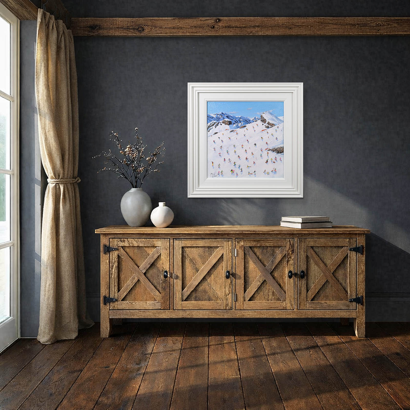 A lively alpine painting by Paola Cassais capturing the energy of the ski season in her distinctive three-dimensional style. Presented in a matt white slip and sculpted frame as pictured and ready to hang.