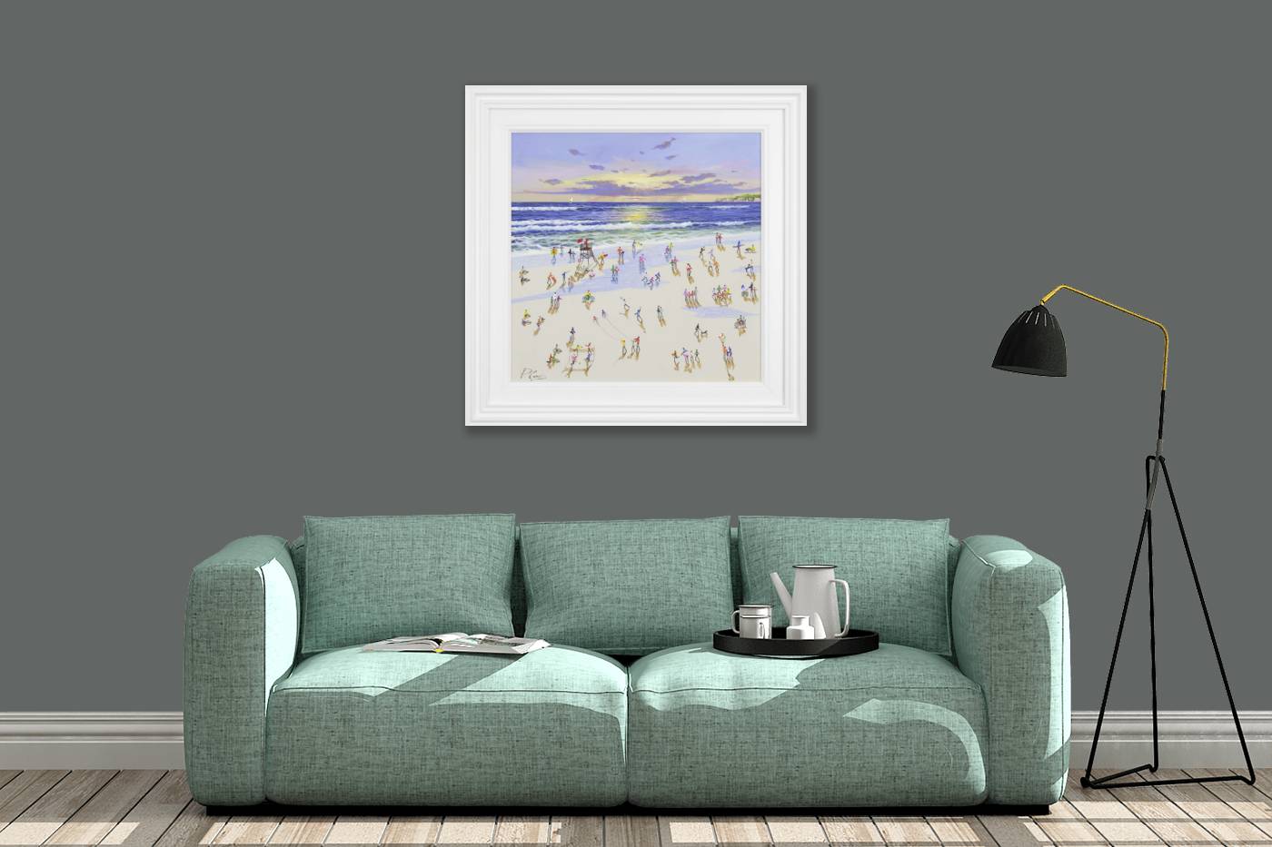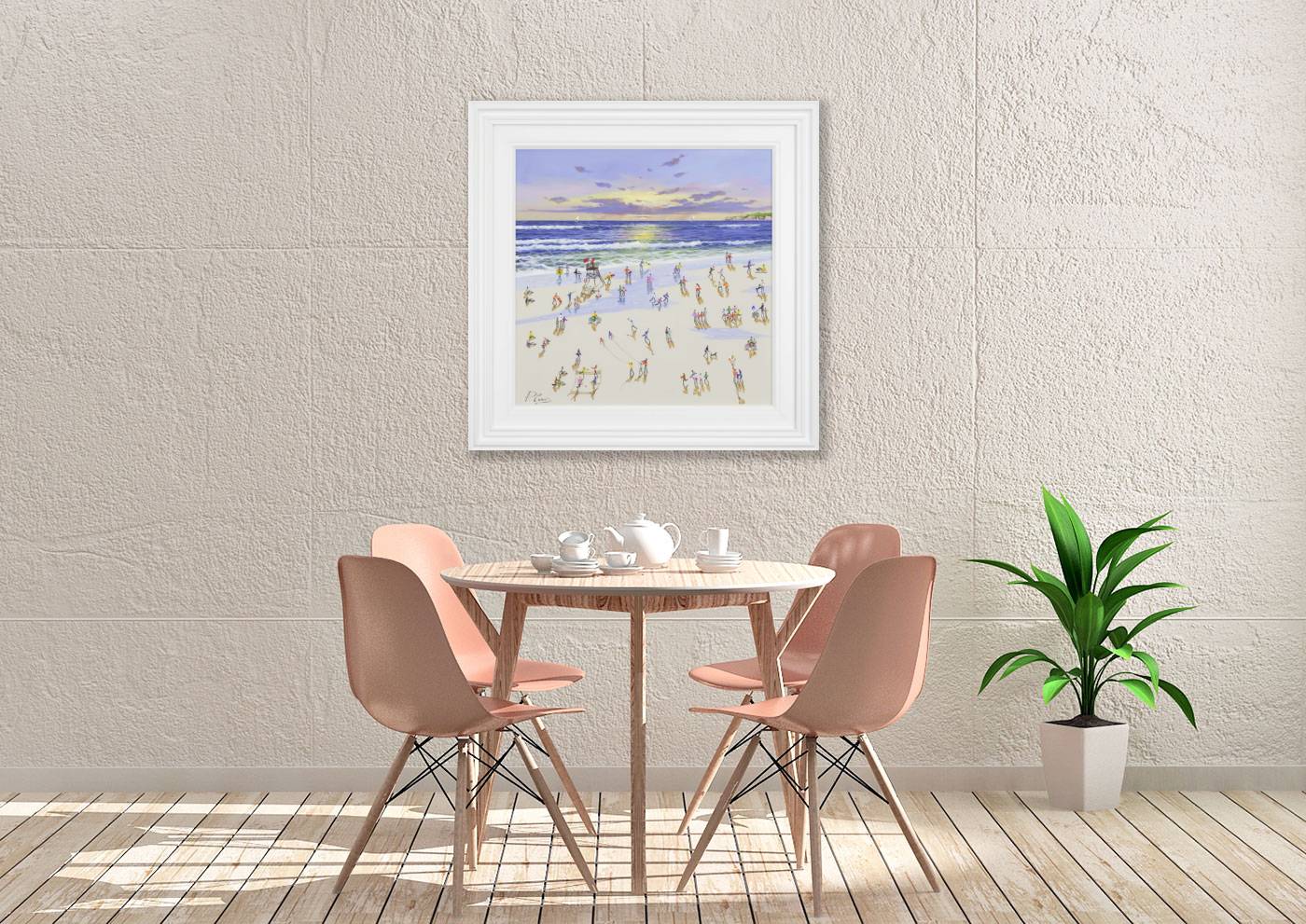An original painting by Paola Cassais featuring the artist’s joyful little people along the beach. The piece is three-dimensional with thick paint and is presented framed with a white slip and outer frame as shown.