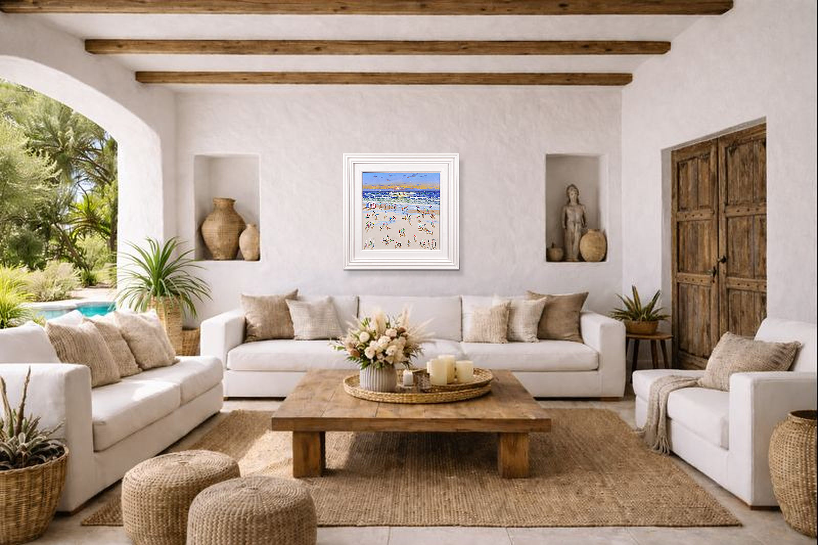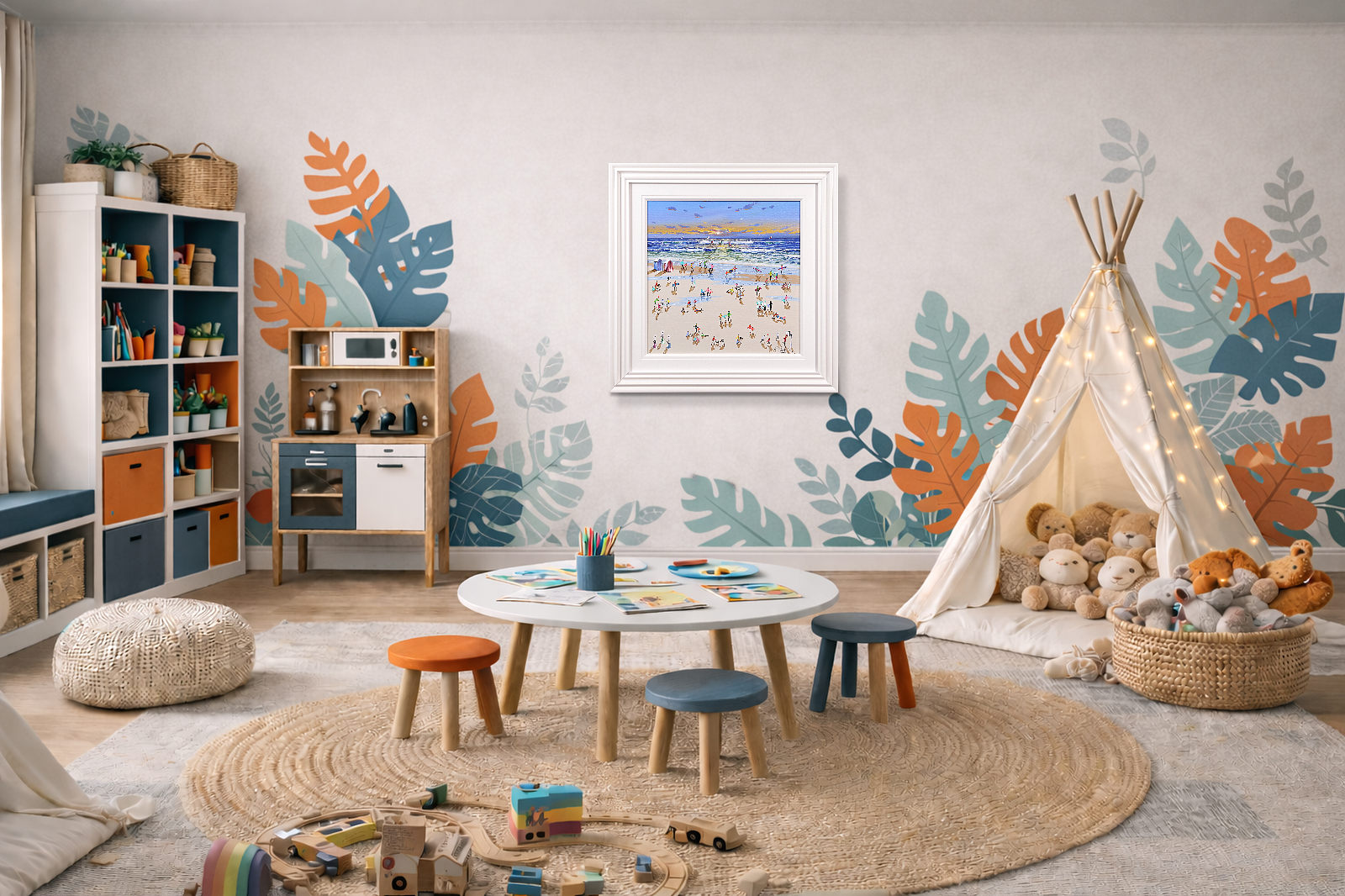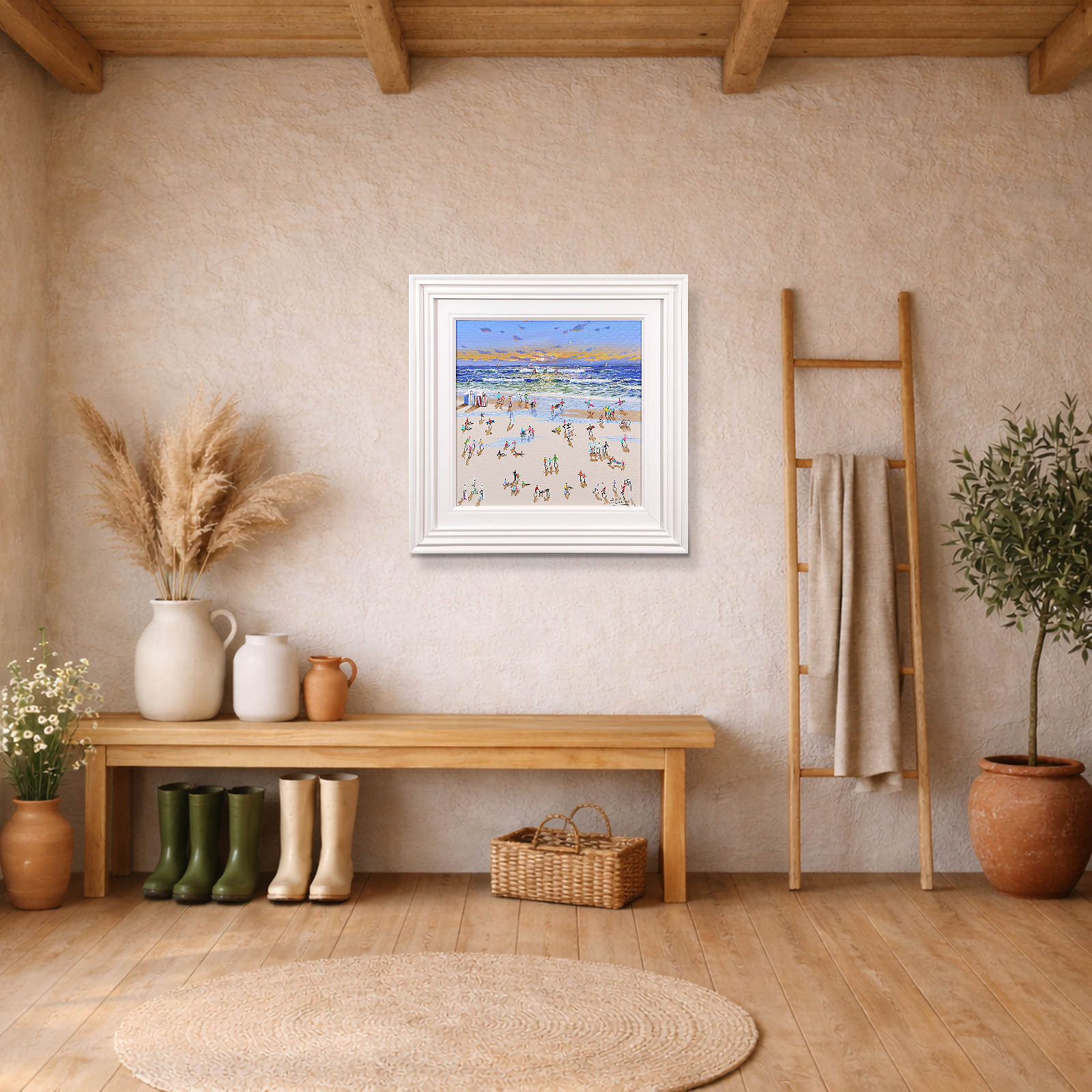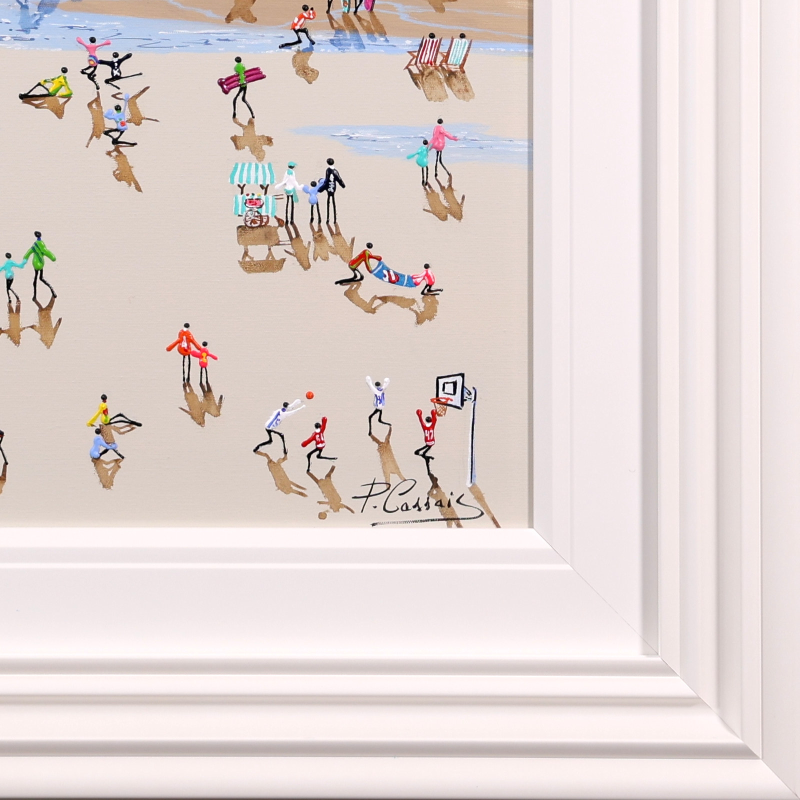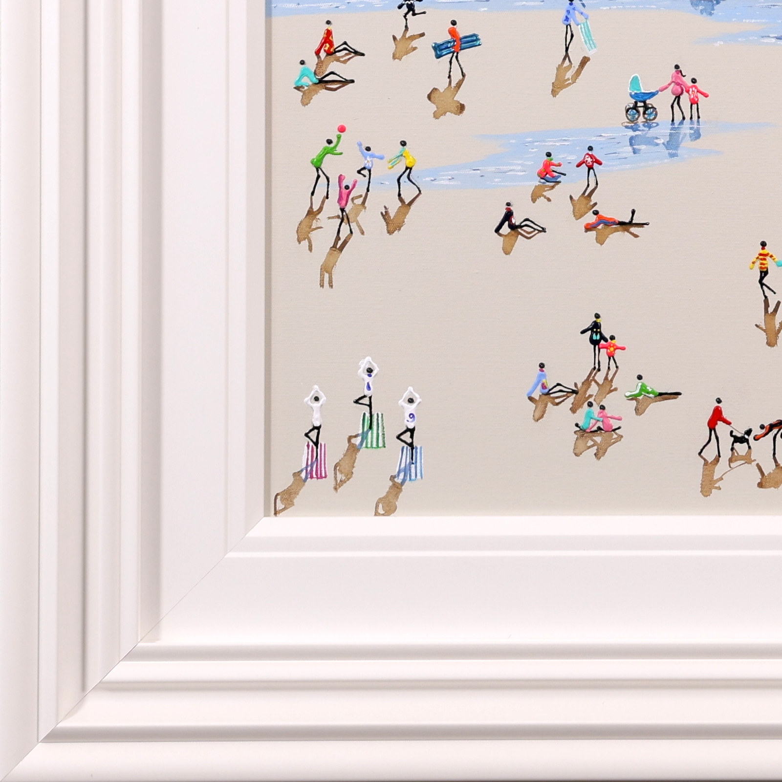 A wonderful original painting by Paola Cassais featuring the artist’s much loved 3D playful figures on the beach. Presented in a wide matt white slip and sculpted frame as pictured.