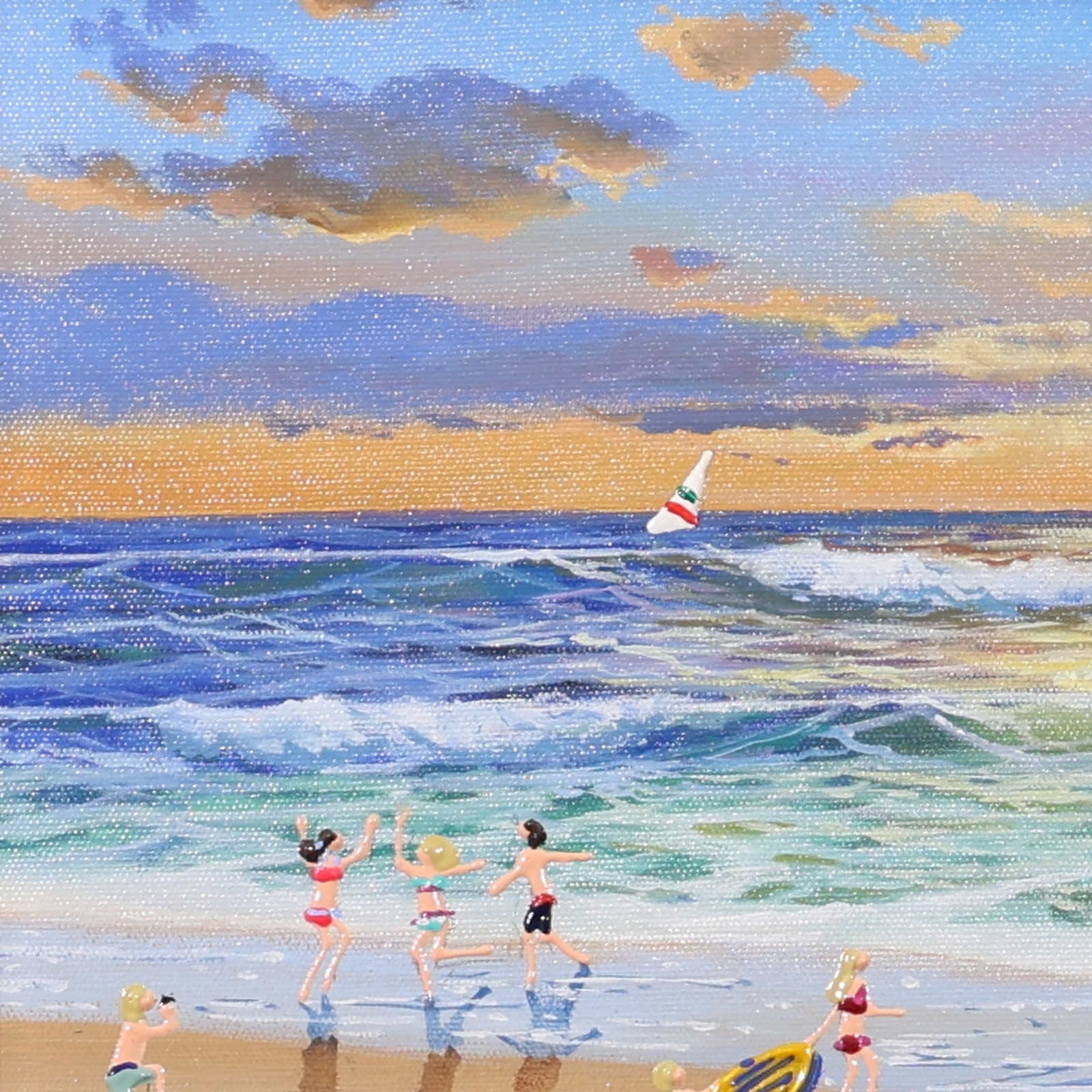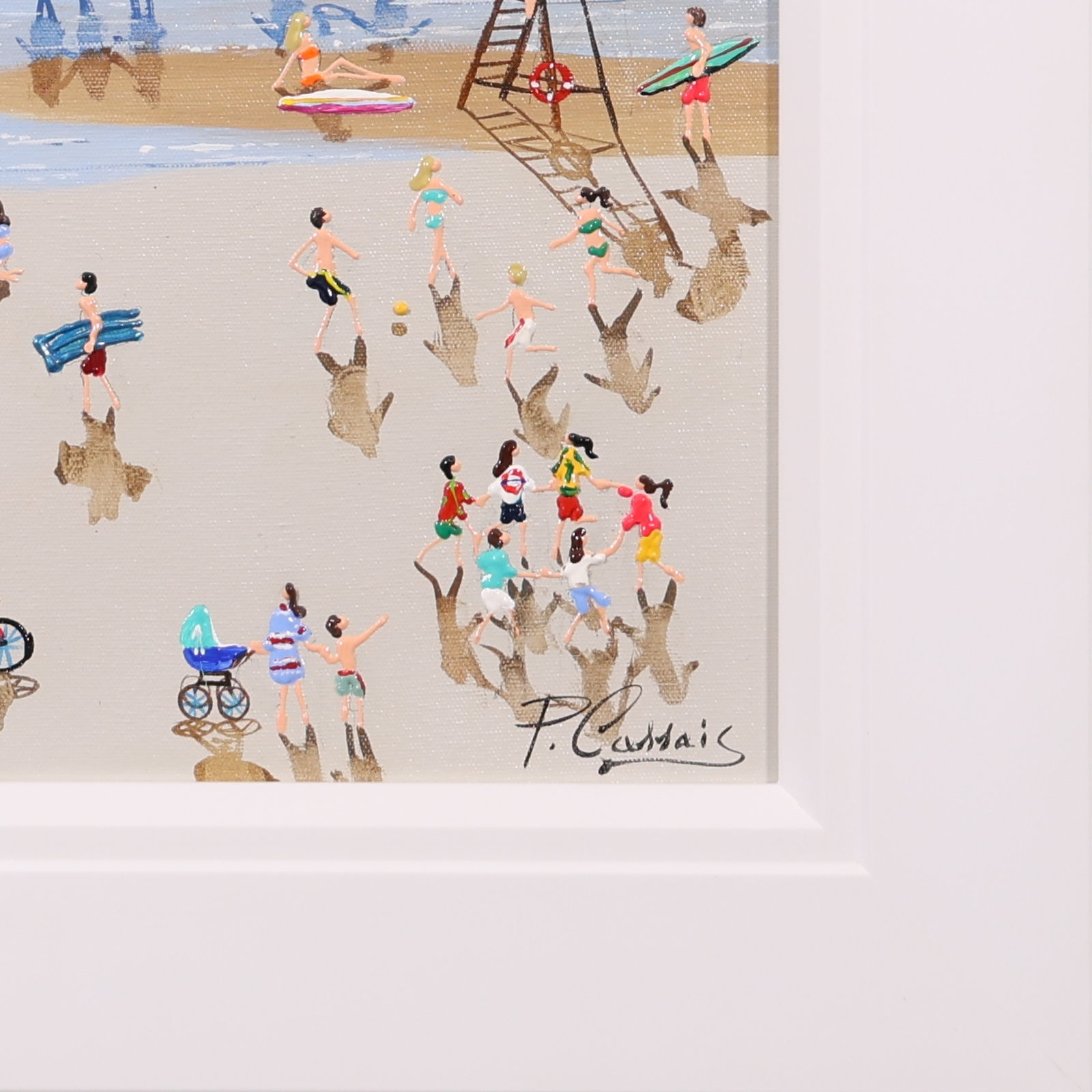 A gorgeous beach style painting by Paola Cassais featuring the artist’s much loved playful figures in 3D. Presented in a wide matt white frame as pictured and ready to hang — ideal for adding warmth to a smaller wall.