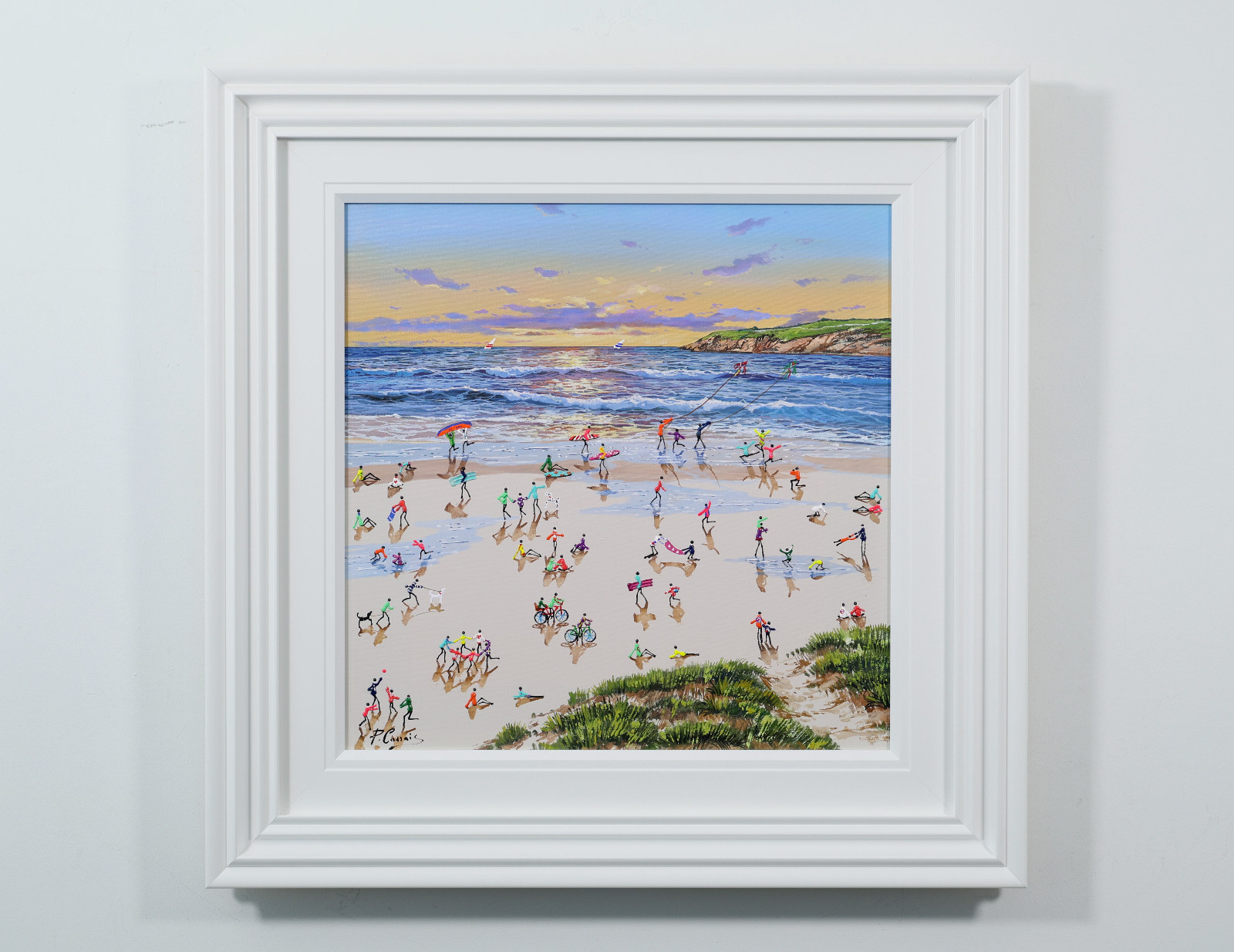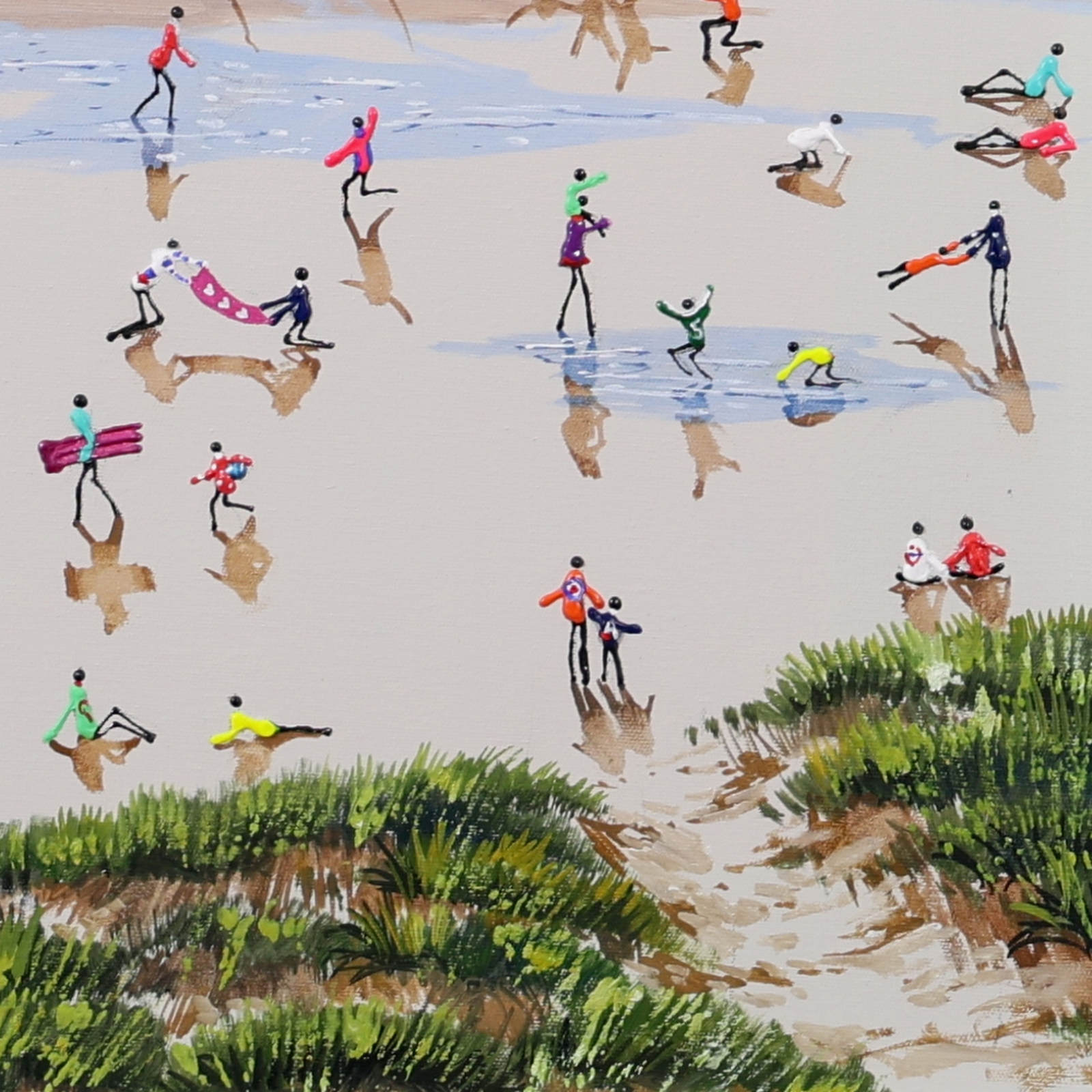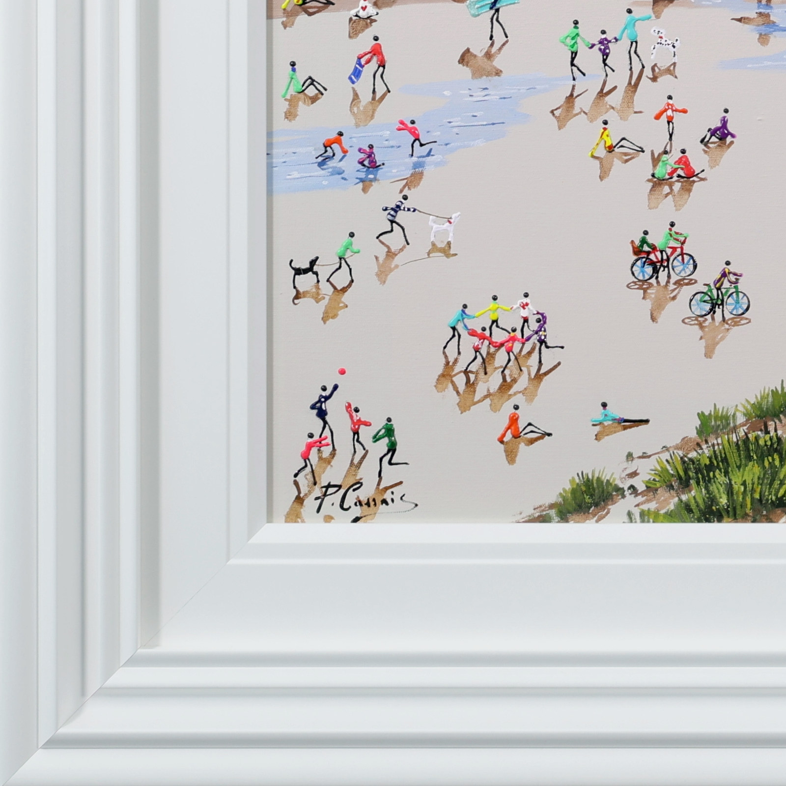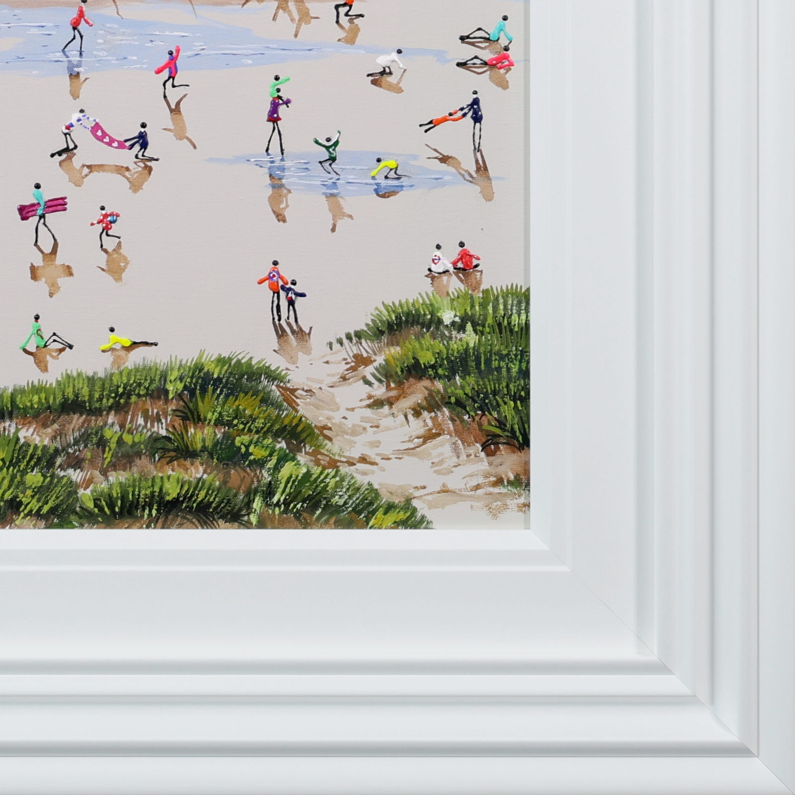 A gorgeous beach style painting by Paola Cassais featuring the artist’s much loved playful figures in 3D. Presented in a wide matt white frame as pictured and ready to hang — ideal for adding warmth to a smaller wall.