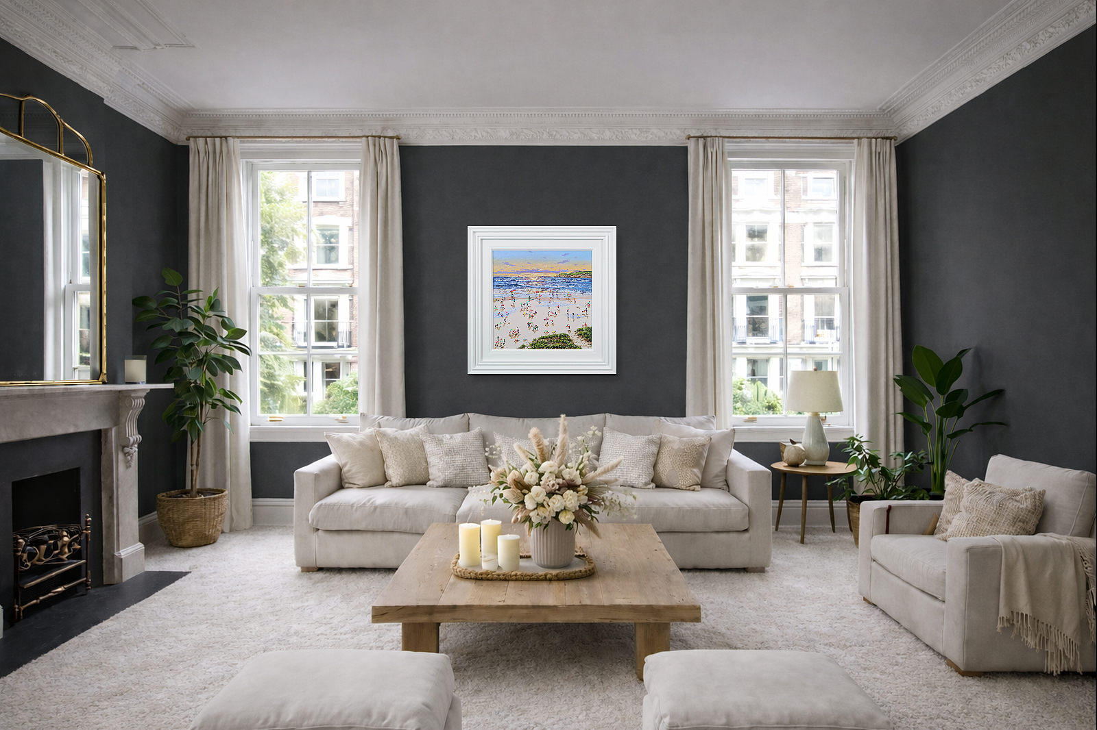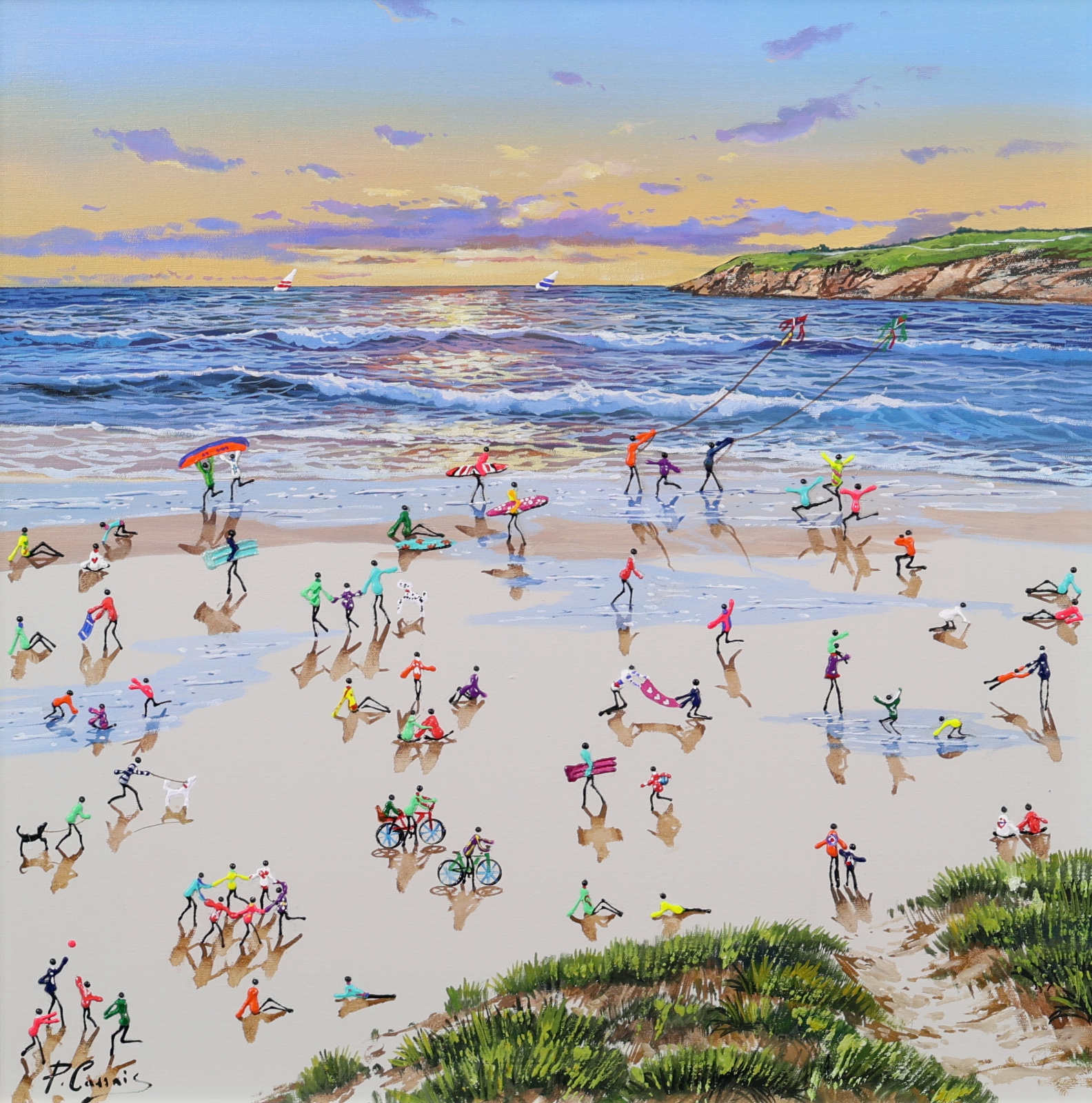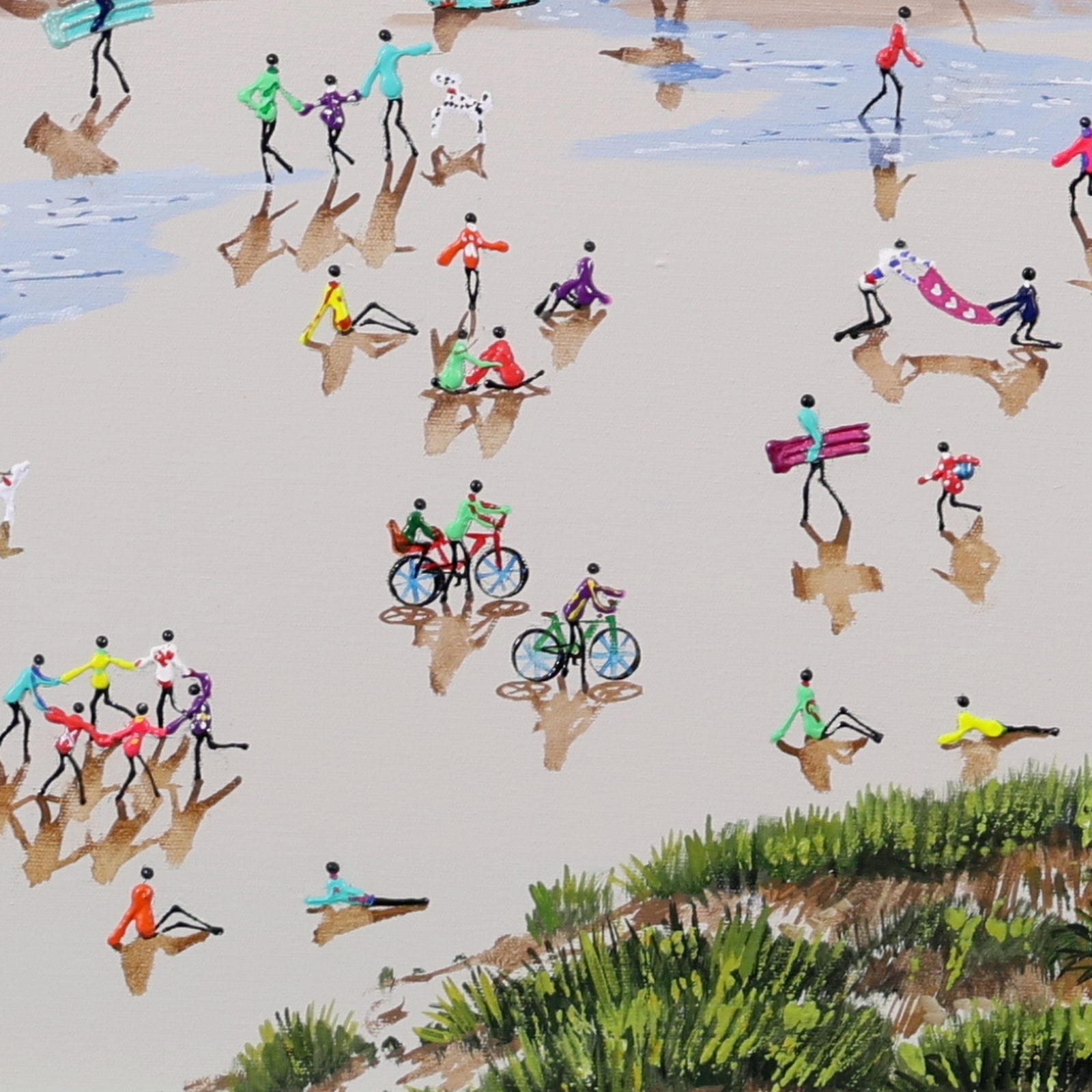 A gorgeous beach style painting by Paola Cassais featuring the artist’s much loved playful figures in 3D. Presented in a wide matt white frame as pictured and ready to hang — ideal for adding warmth to a smaller wall.