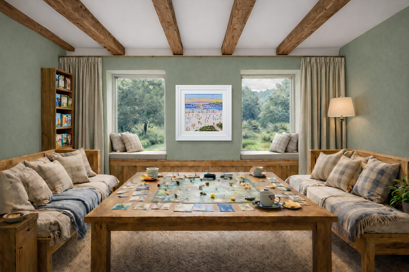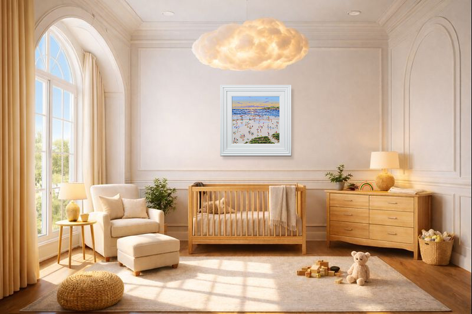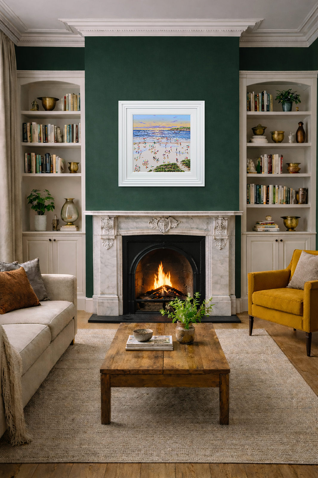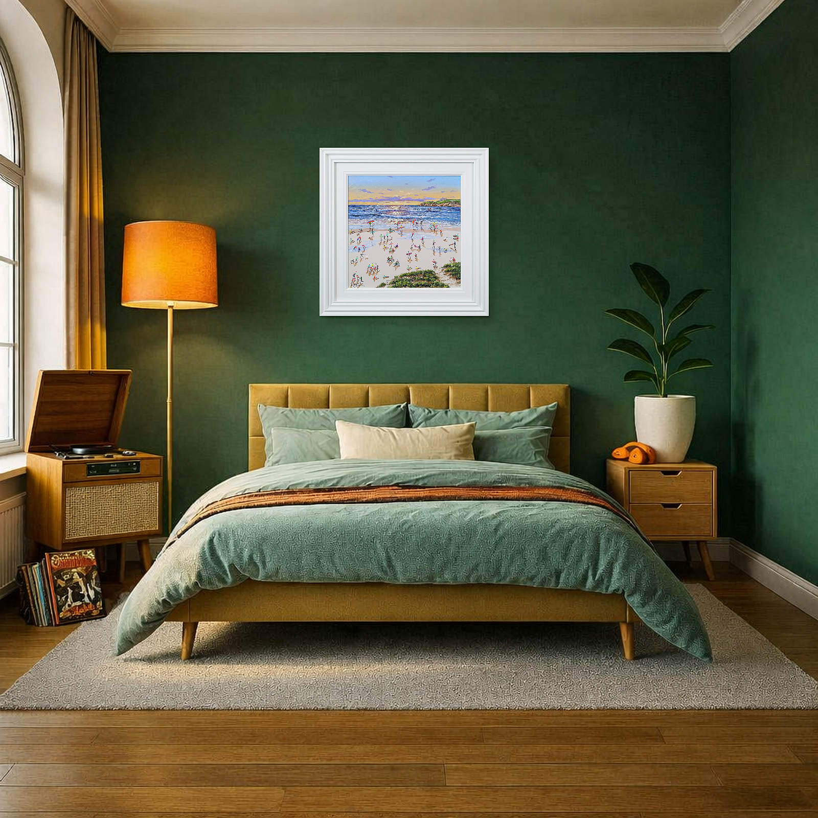 A gorgeous beach style painting by Paola Cassais featuring the artist’s much loved playful figures in 3D. Presented in a wide matt white frame as pictured and ready to hang — ideal for adding warmth to a smaller wall.