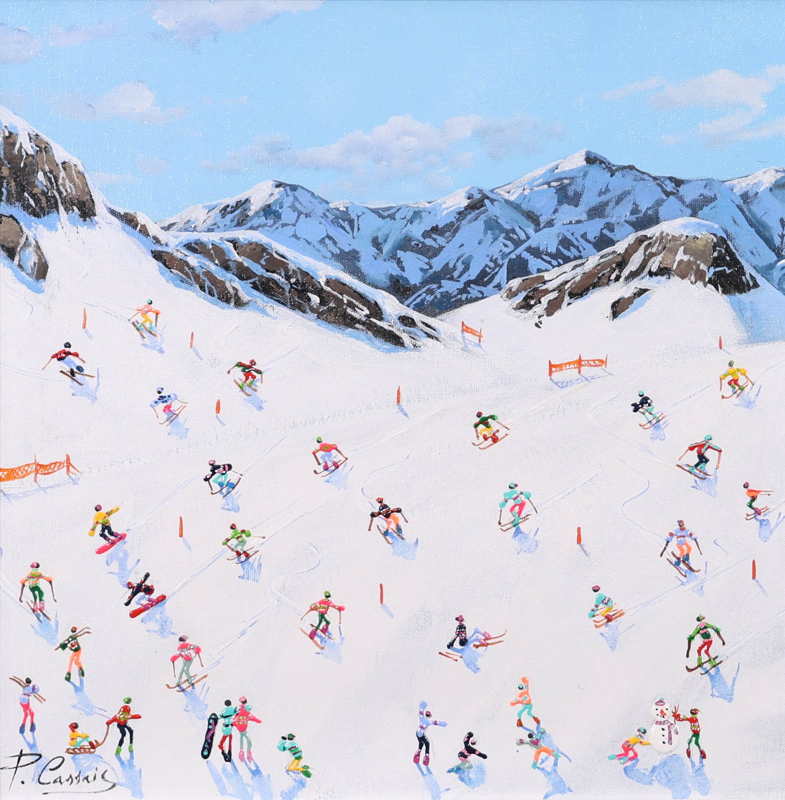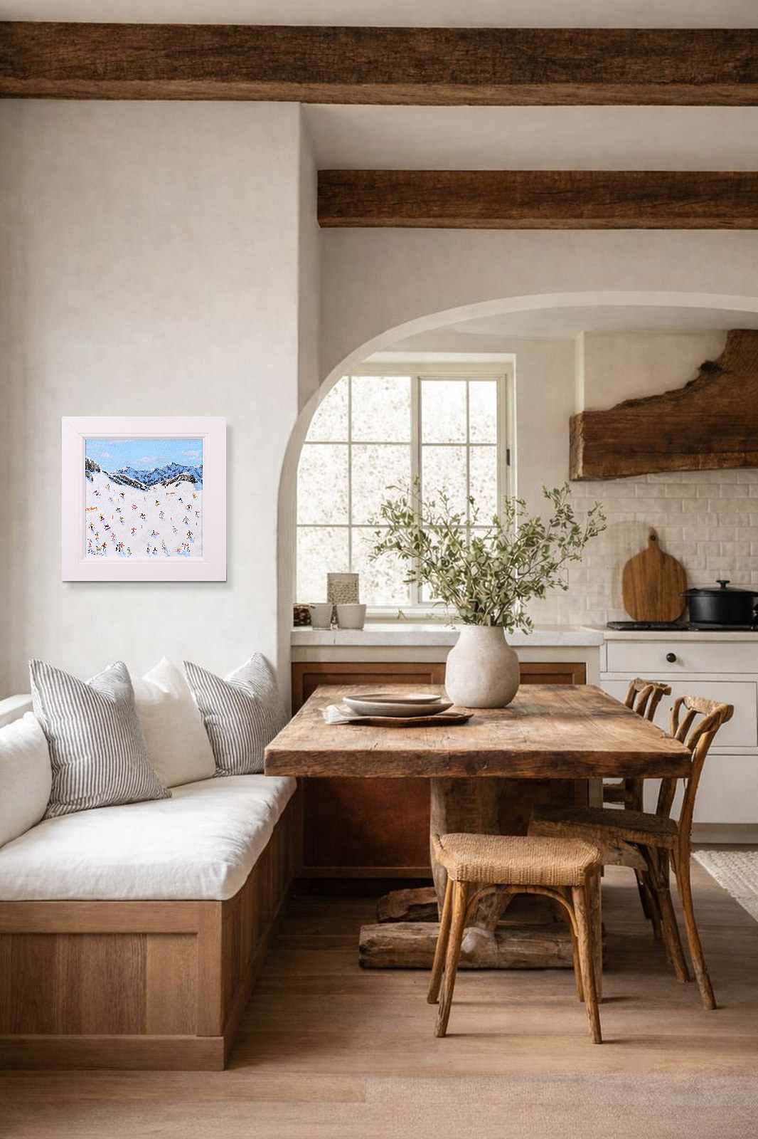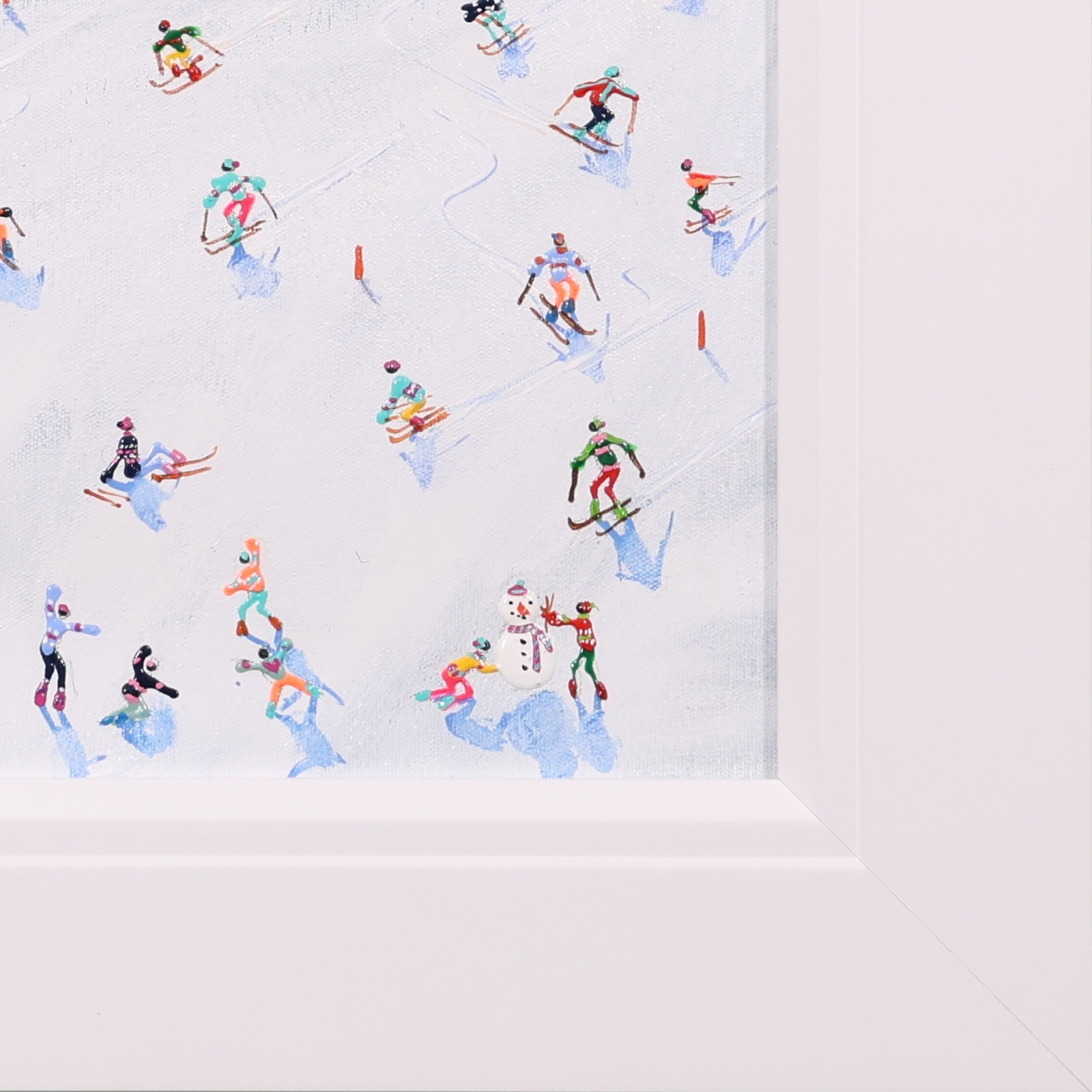 A joyful winter scene by Paola Cassais capturing skiers weaving through crisp white slopes beneath a brilliant blue sky. Full of movement and charm, this small original is beautifully presented in a wide matt white frame as pictured and ready to hang — perfect for that smaller space.