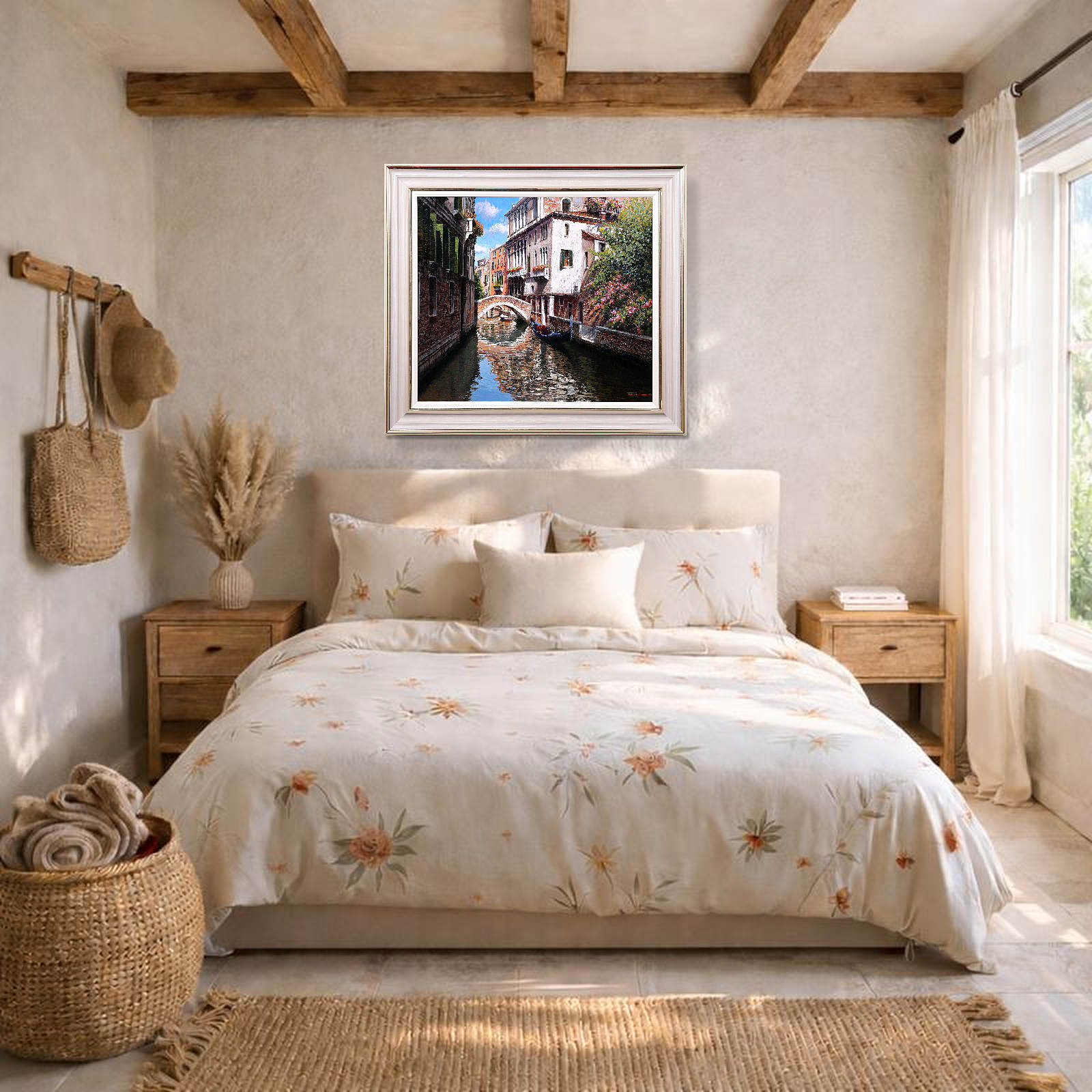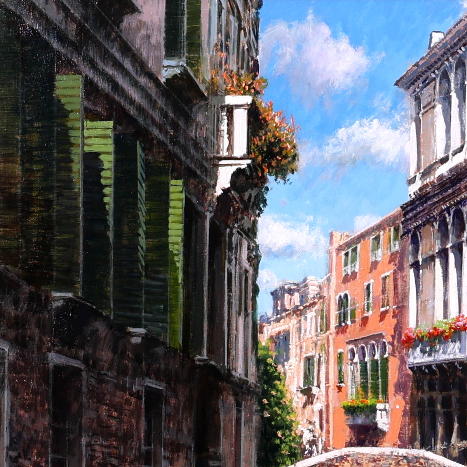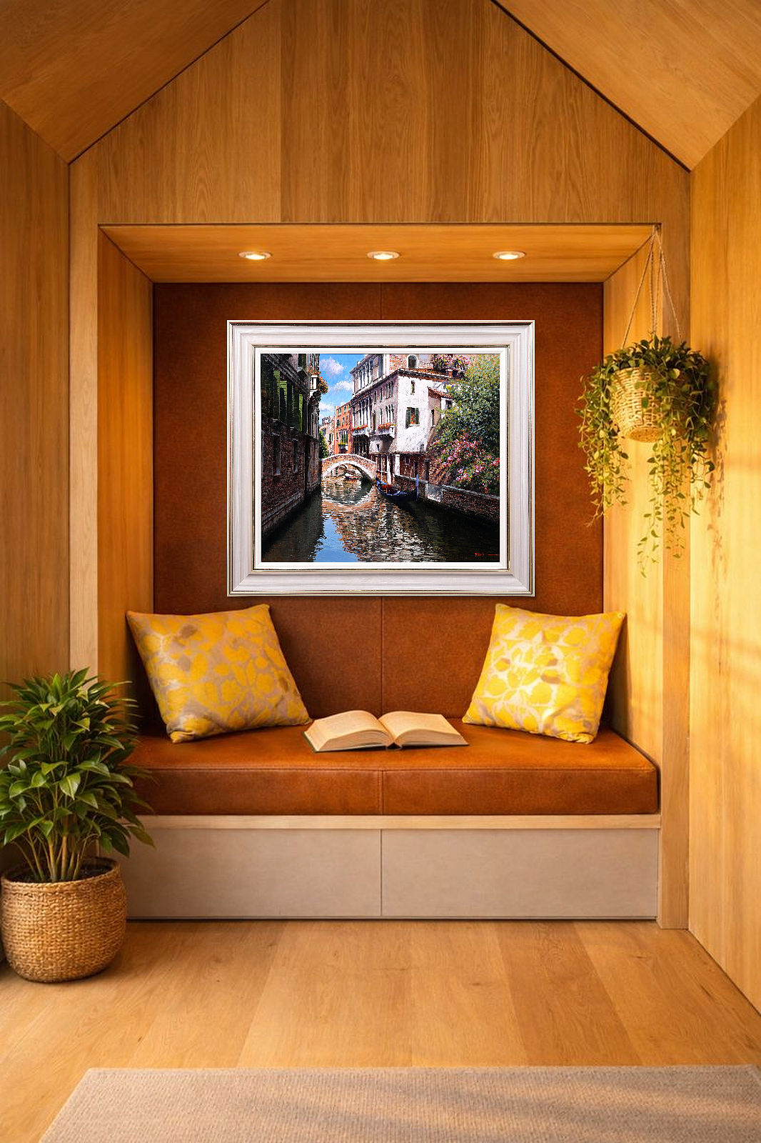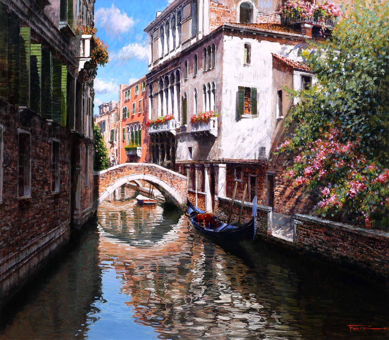 His favourite subjects are Venetian canal scenes and Tuscan landscapes. The sense of tension that emerges from the interaction of light and shadow affords his Venetian paintings a special quality allowing the viewer to embark on a journey through time. In particular the way in which the water is represented in Fiore’s oil paintings deserves special mention. Every ripple and reflection seems alive with light and energy.