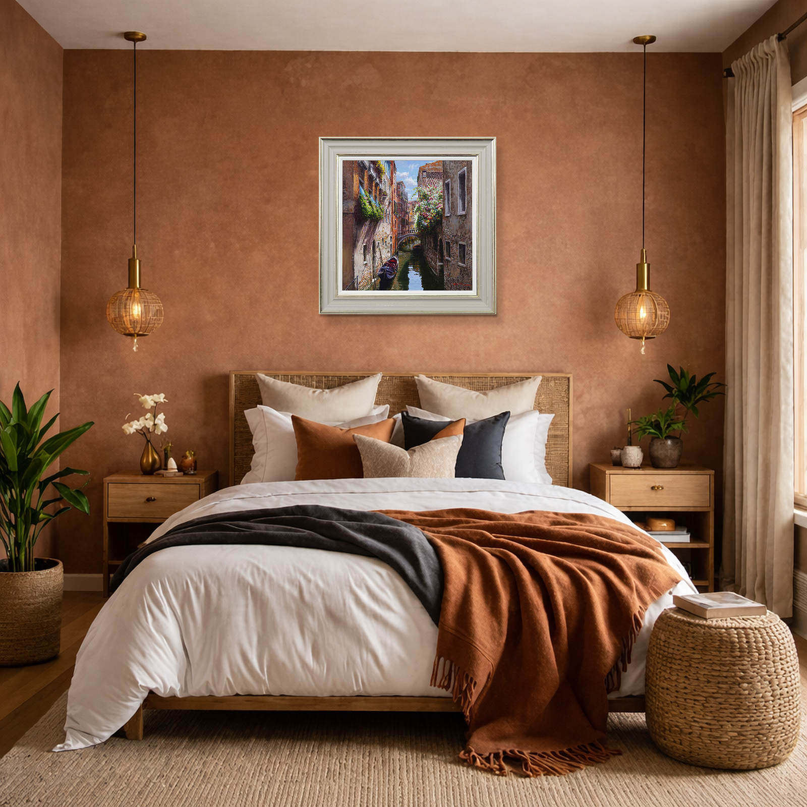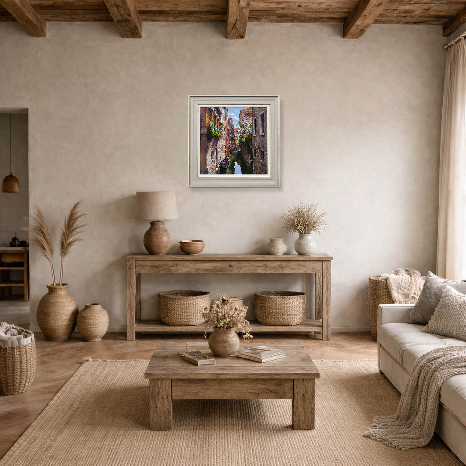 Stunning original painting of Venice replete with detail by Italian artist Raffaele Fiore. Framed in a beautiful wide moulding with warm tones, gold edging and a white slip as shown.