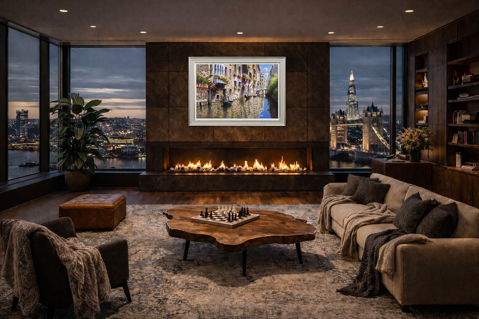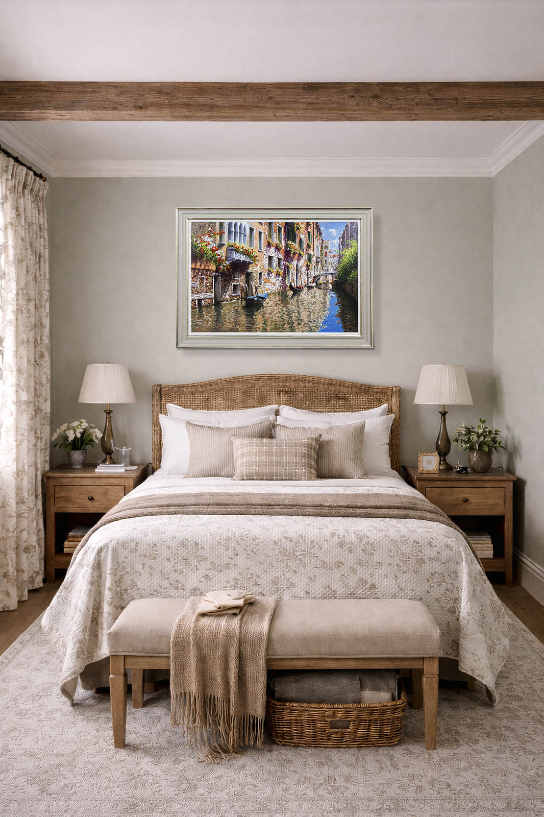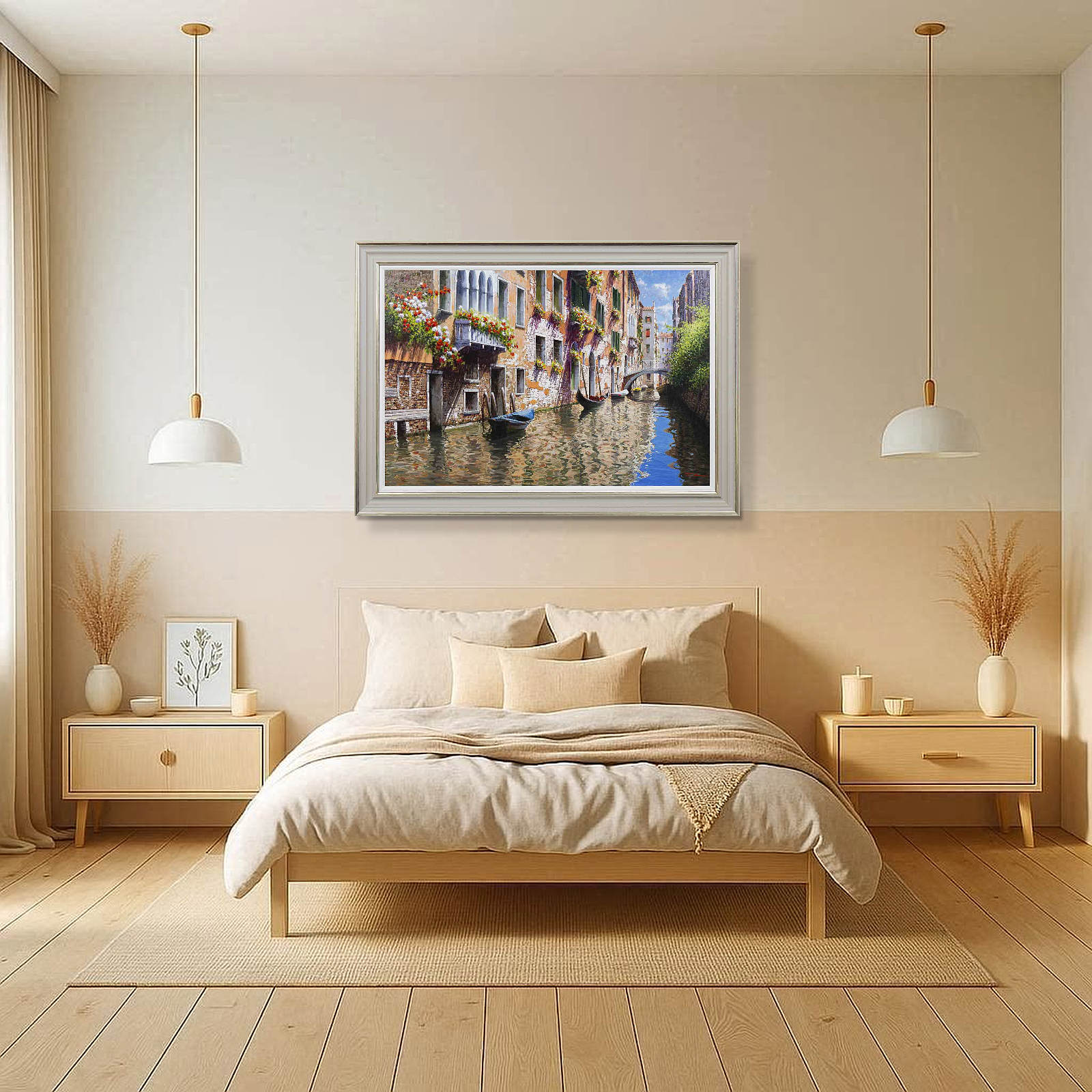 Stunning original painting of Venice replete with detail by Italian artist Raffaele Fiore. Framed in a beautiful wide moulding with warm tones, gold edging and a white slip as shown.