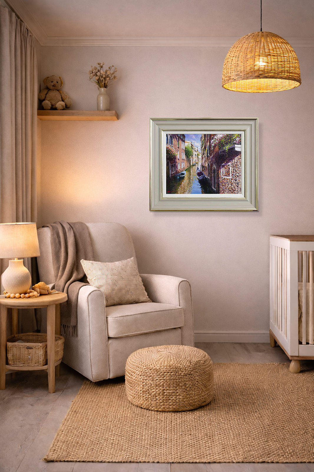 A wonderful new Venice scene by Italian artist, Raffaele Fiore. Framed in a beautiful wide moulding with warm tones, gold edging and a white slip as shown.