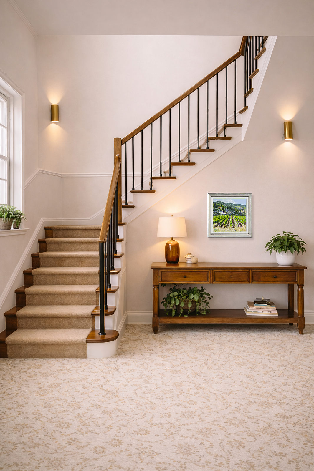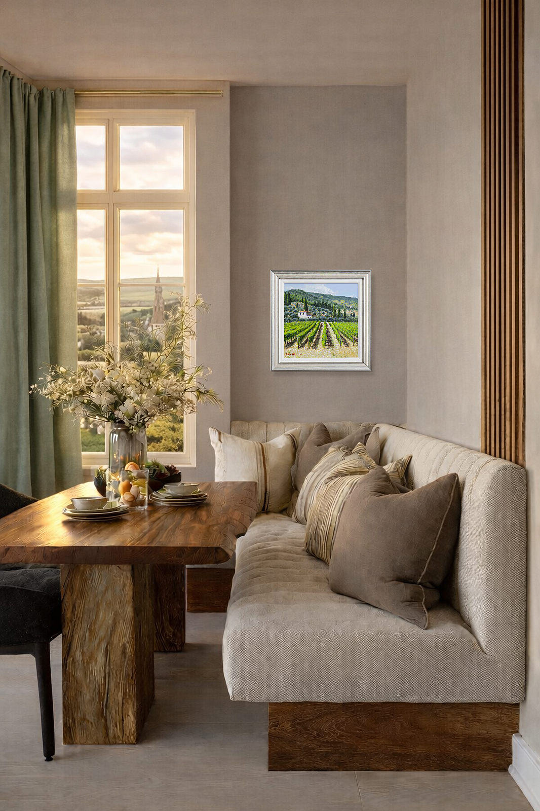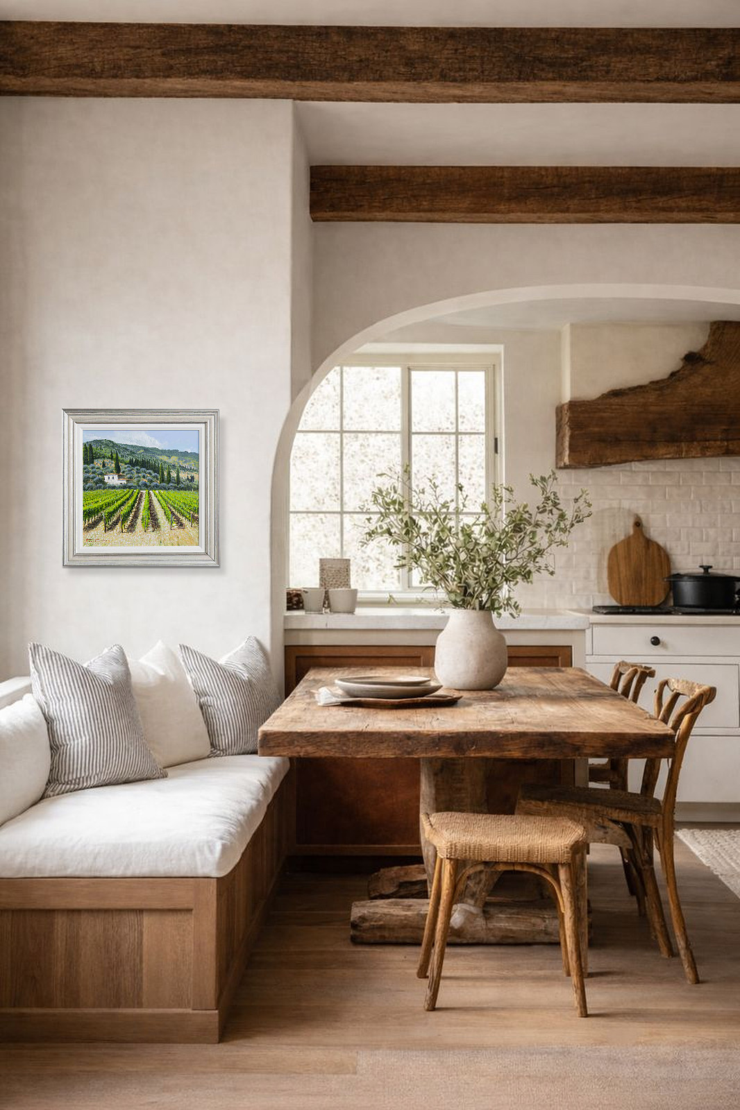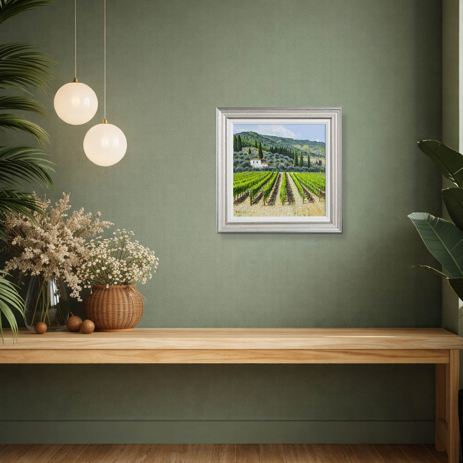 Tuscan vista beautifully captured by Italian artist Raffaele Fiore. Presented framed in an off white slip and silver frame as shown and ready to hang.