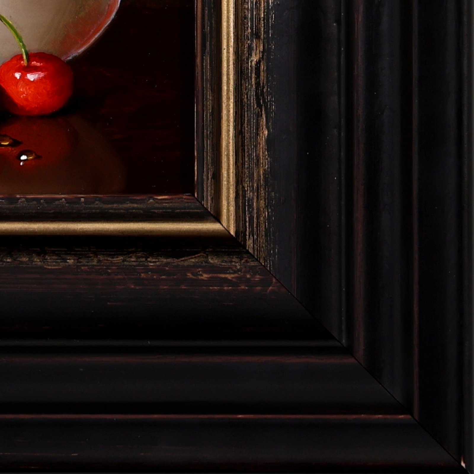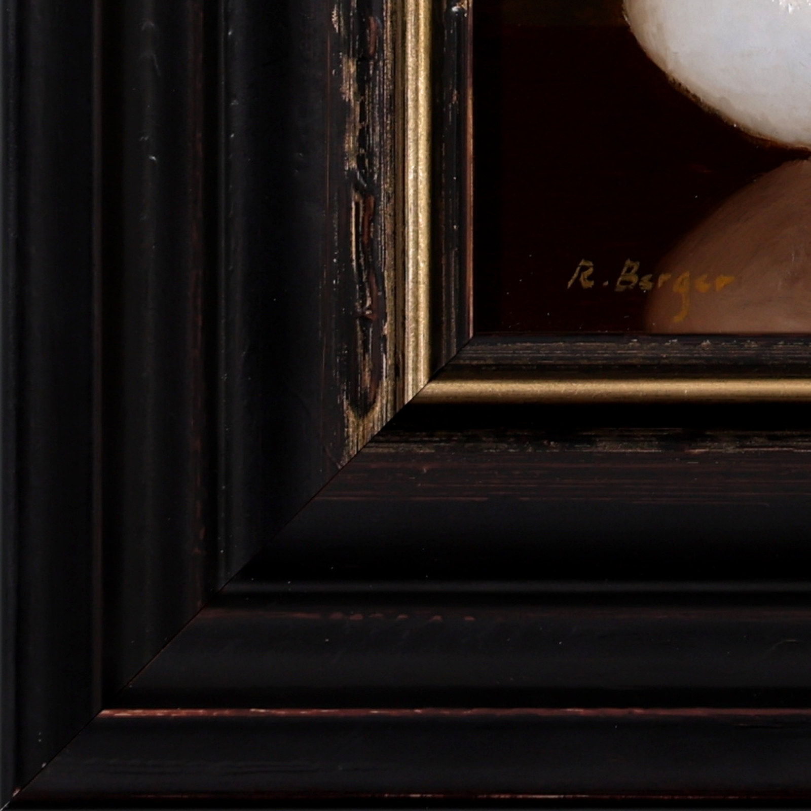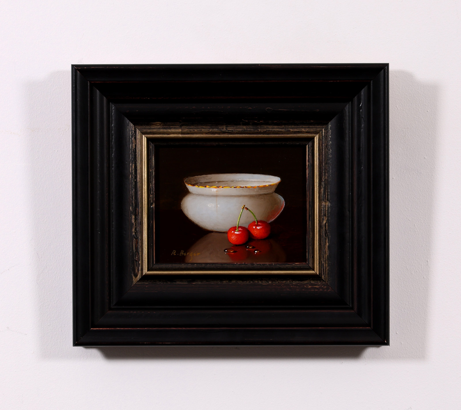 Beautiful still life oil painting contrasted against a dark background by Ronald Berger. Presented in a bespoke dark frame with gold edge as pictured.