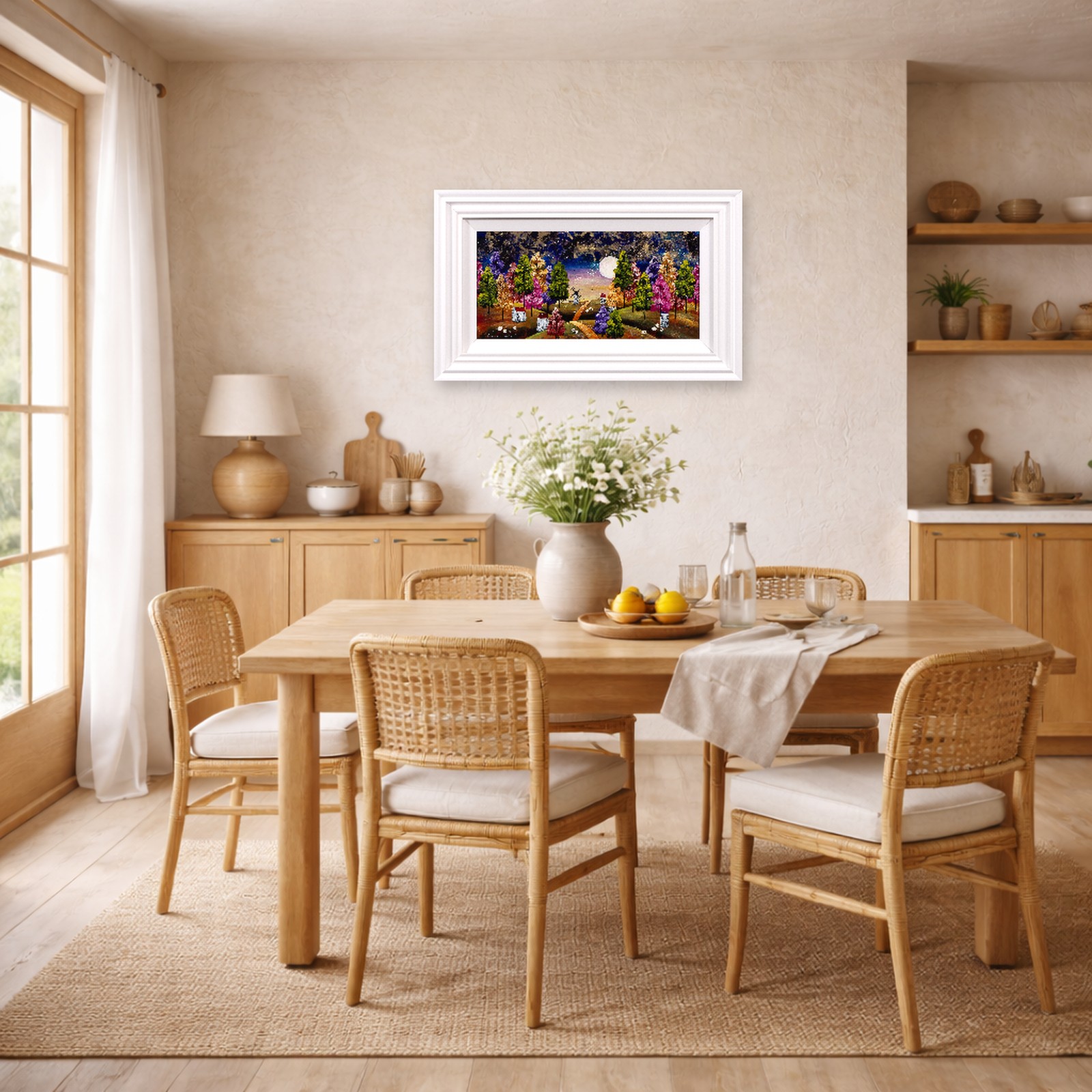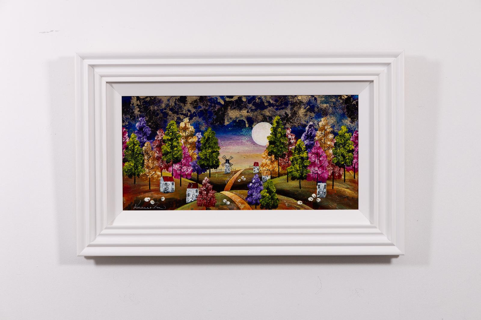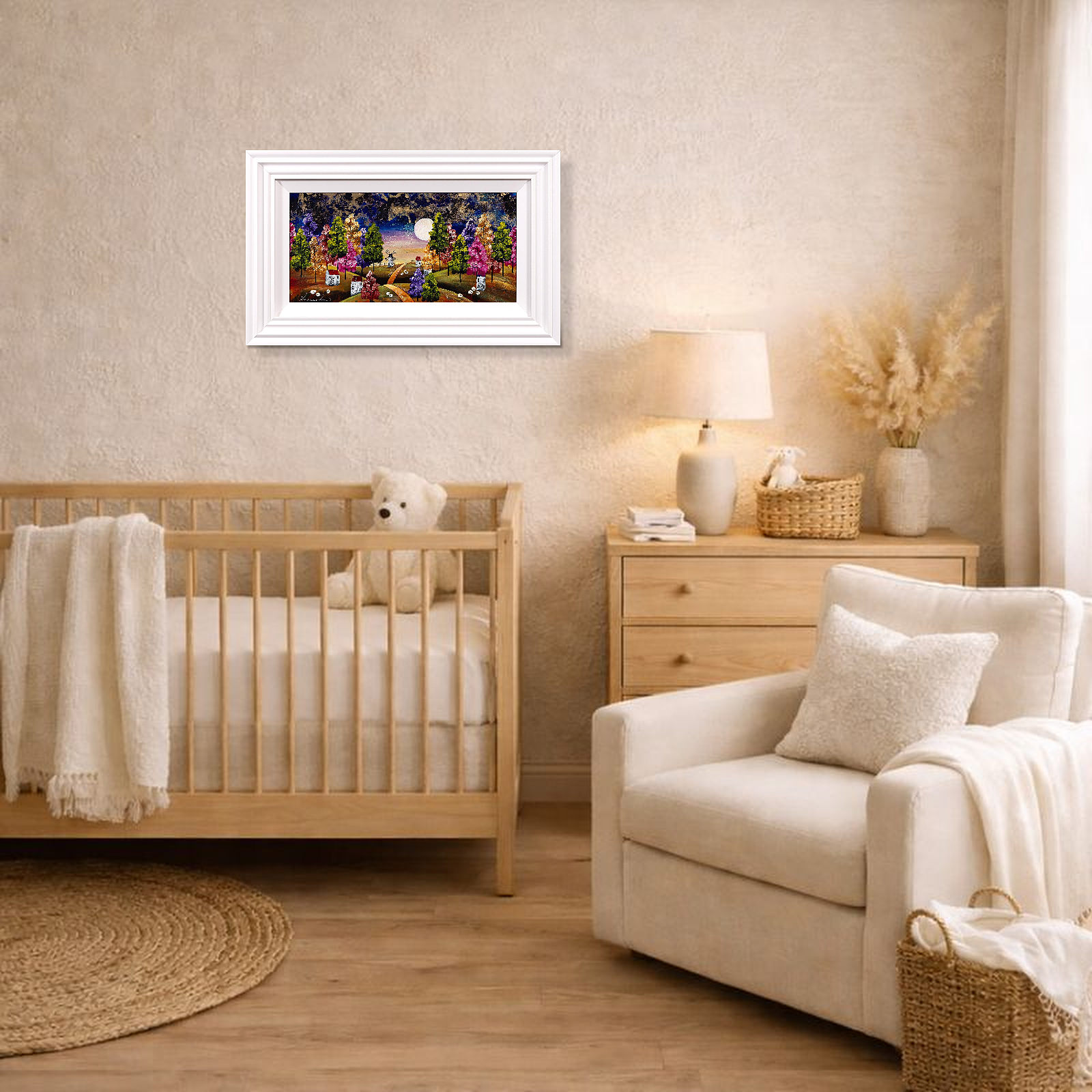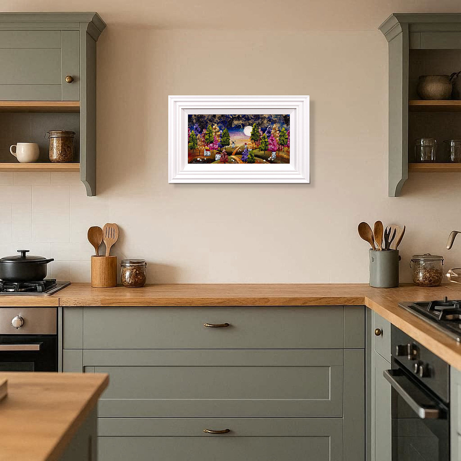 Original painting from Rozanne Bell’s playful Harvest Moon series, rendered in her signature fun, naïve art style. Vibrant colours are enhanced with a glossy resin finish, giving the piece a luminous, eye-catching glow. Presented in a sculpted white frame with a matching white slip, this artwork is ready to hang and brighten any wall.