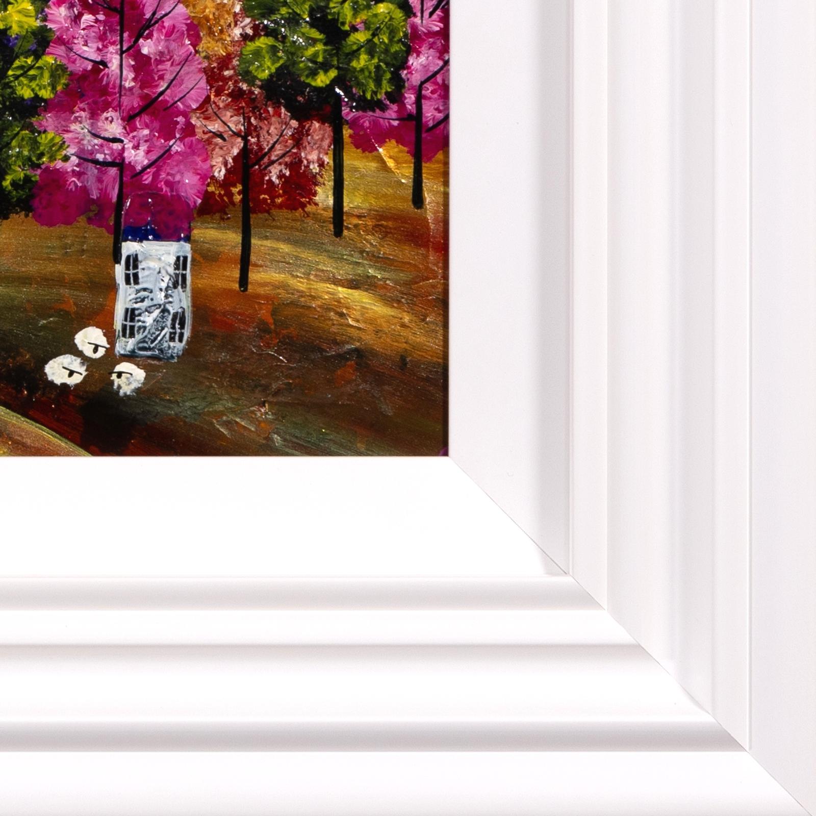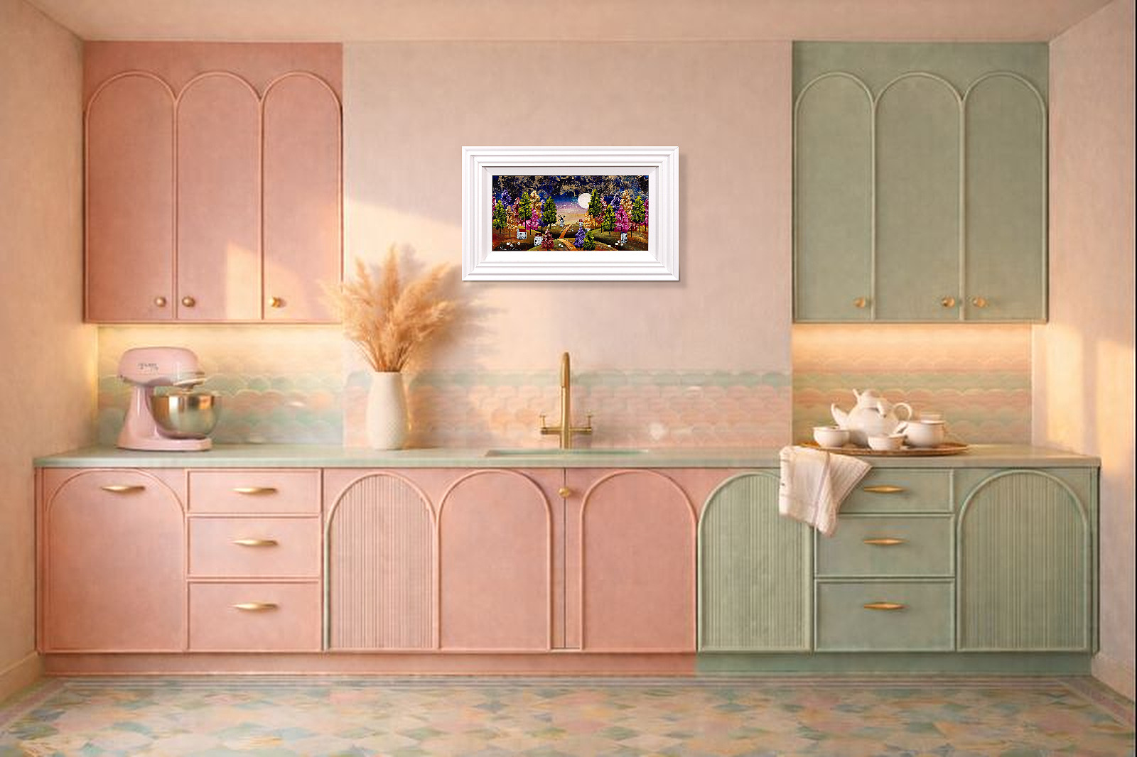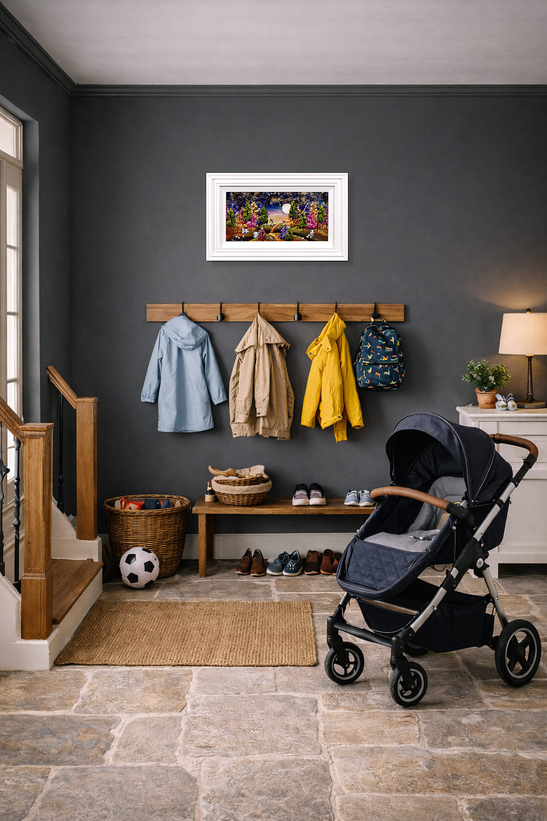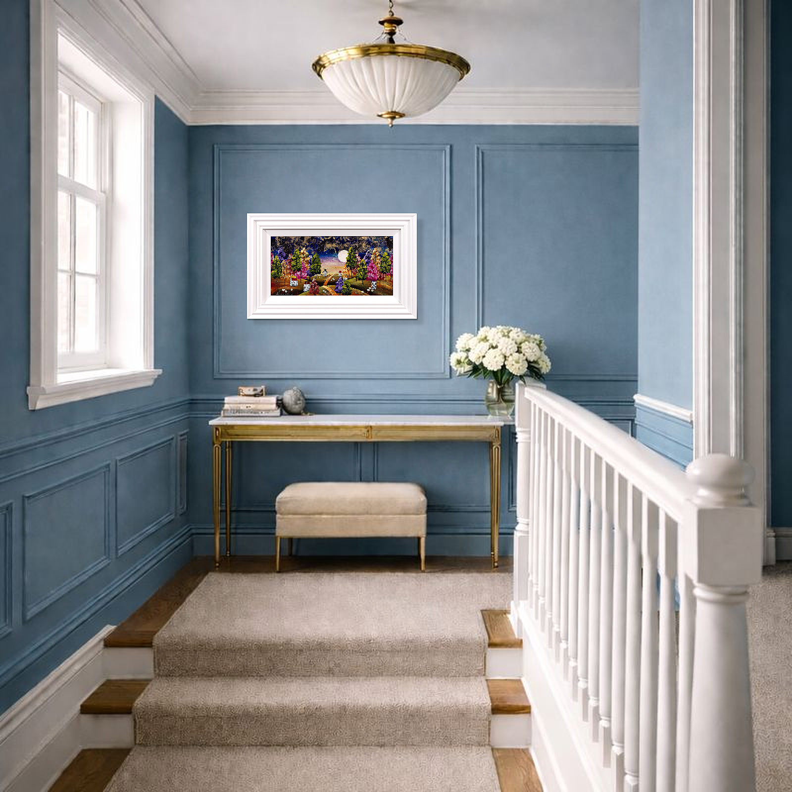 Original painting from Rozanne Bell’s playful Harvest Moon series, rendered in her signature fun, naïve art style. Vibrant colours are enhanced with a glossy resin finish, giving the piece a luminous, eye-catching glow. Presented in a sculpted white frame with a matching white slip, this artwork is ready to hang and brighten any wall.