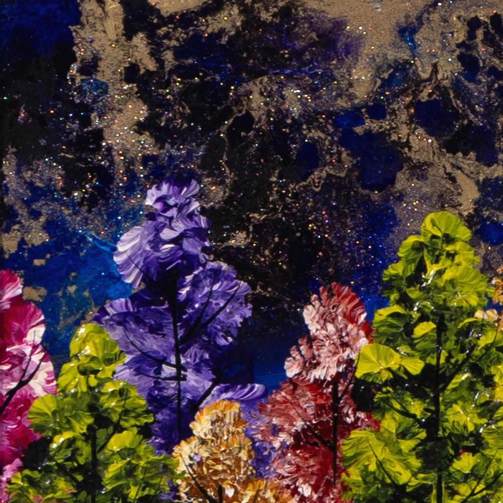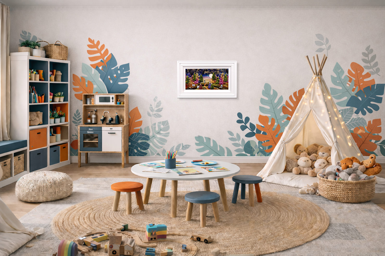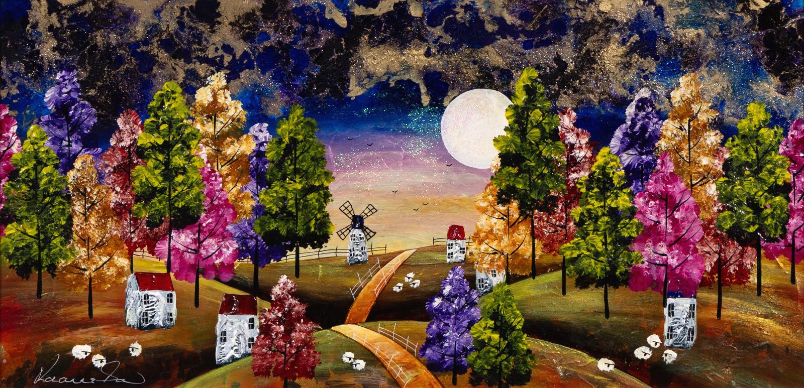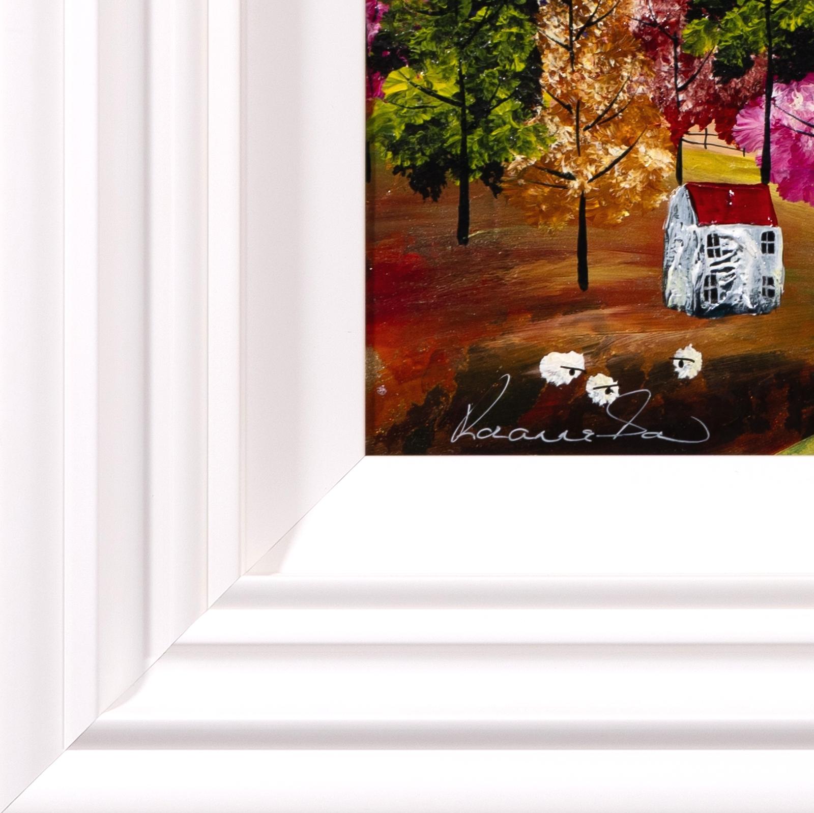 Original painting from Rozanne Bell’s playful Harvest Moon series, rendered in her signature fun, naïve art style. Vibrant colours are enhanced with a glossy resin finish, giving the piece a luminous, eye-catching glow. Presented in a sculpted white frame with a matching white slip, this artwork is ready to hang and brighten any wall.