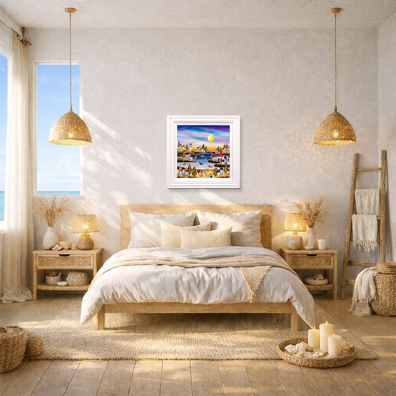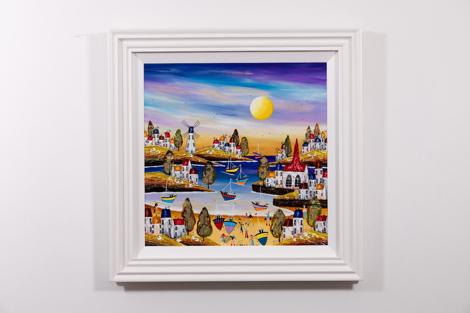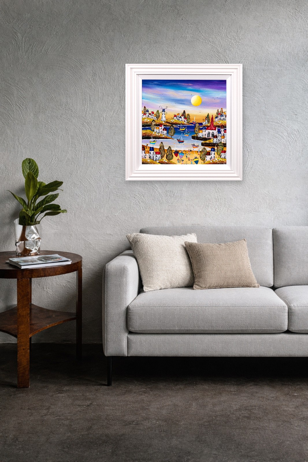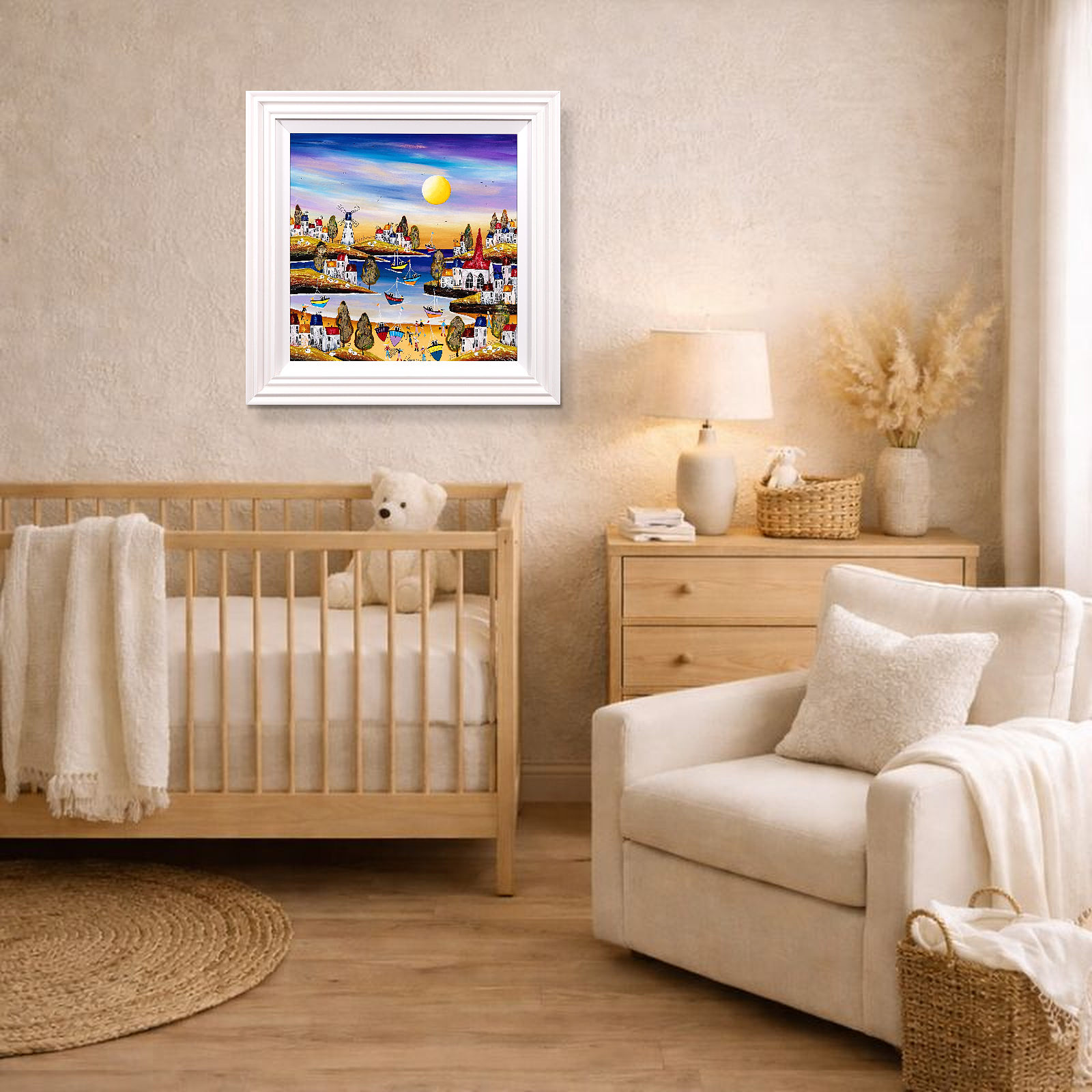 Original beach painting in the fun naïve art style of artist Rozanne Bell. This painting is finished with resin to make the colours truly pop! Complemented by a white slip and sculpted white frame as shown and ready to display on your wall.