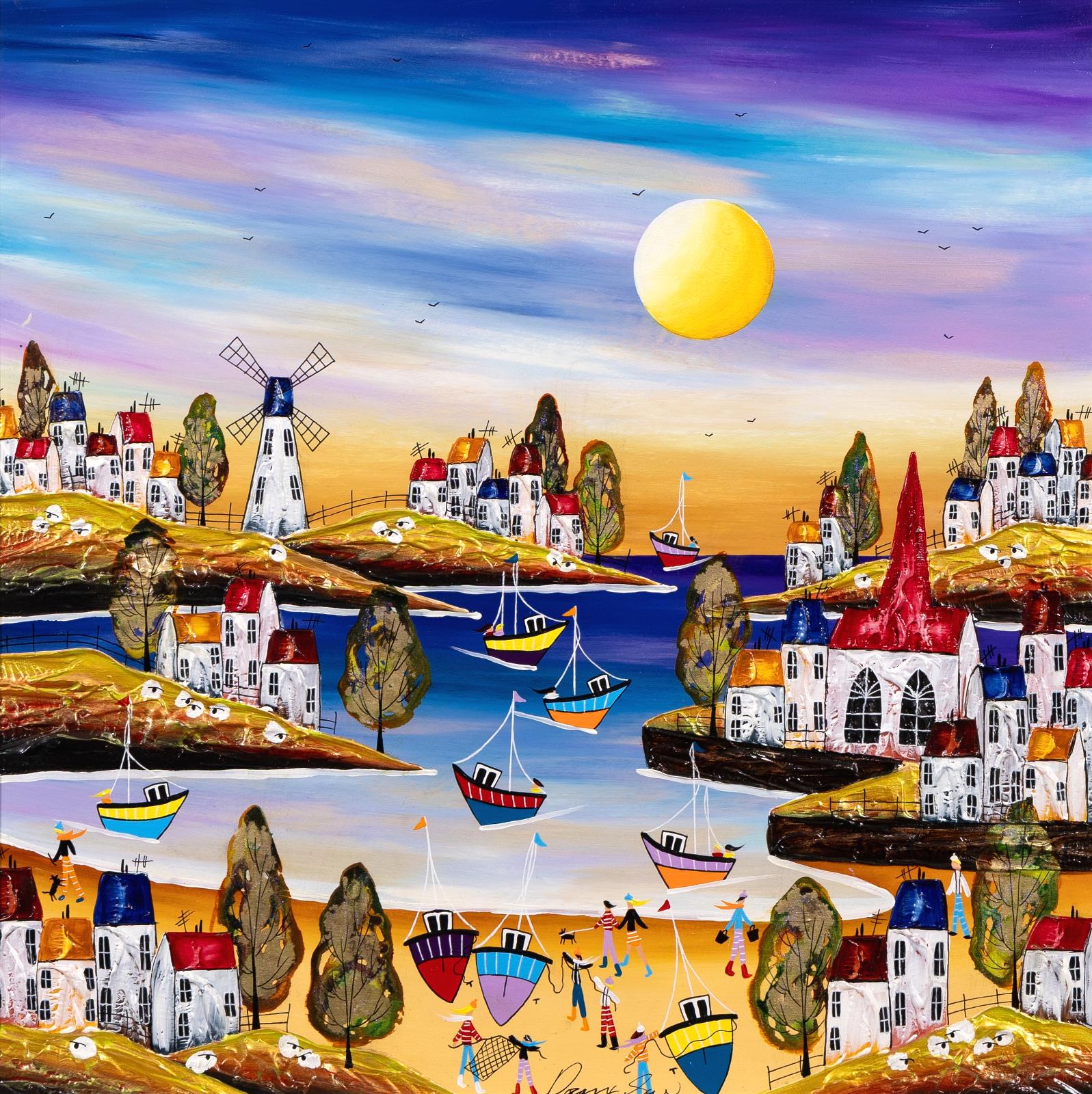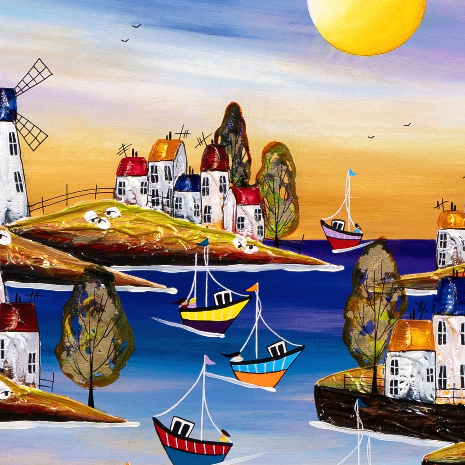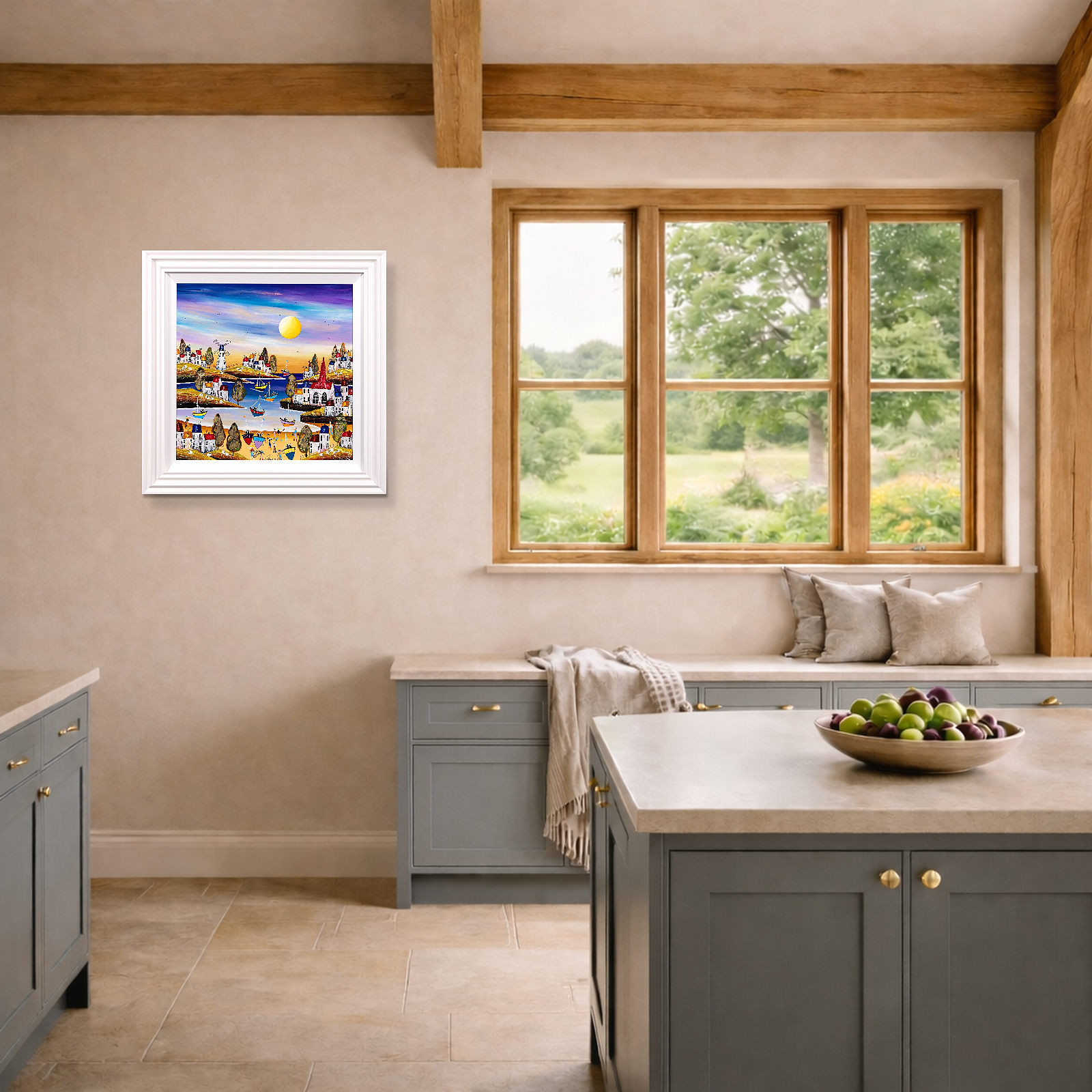 Original beach painting in the fun naïve art style of artist Rozanne Bell. This painting is finished with resin to make the colours truly pop! Complemented by a white slip and sculpted white frame as shown and ready to display on your wall.