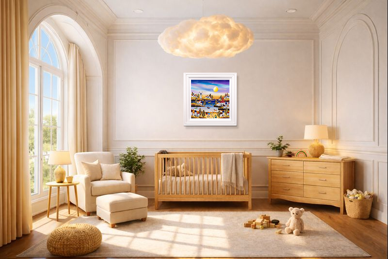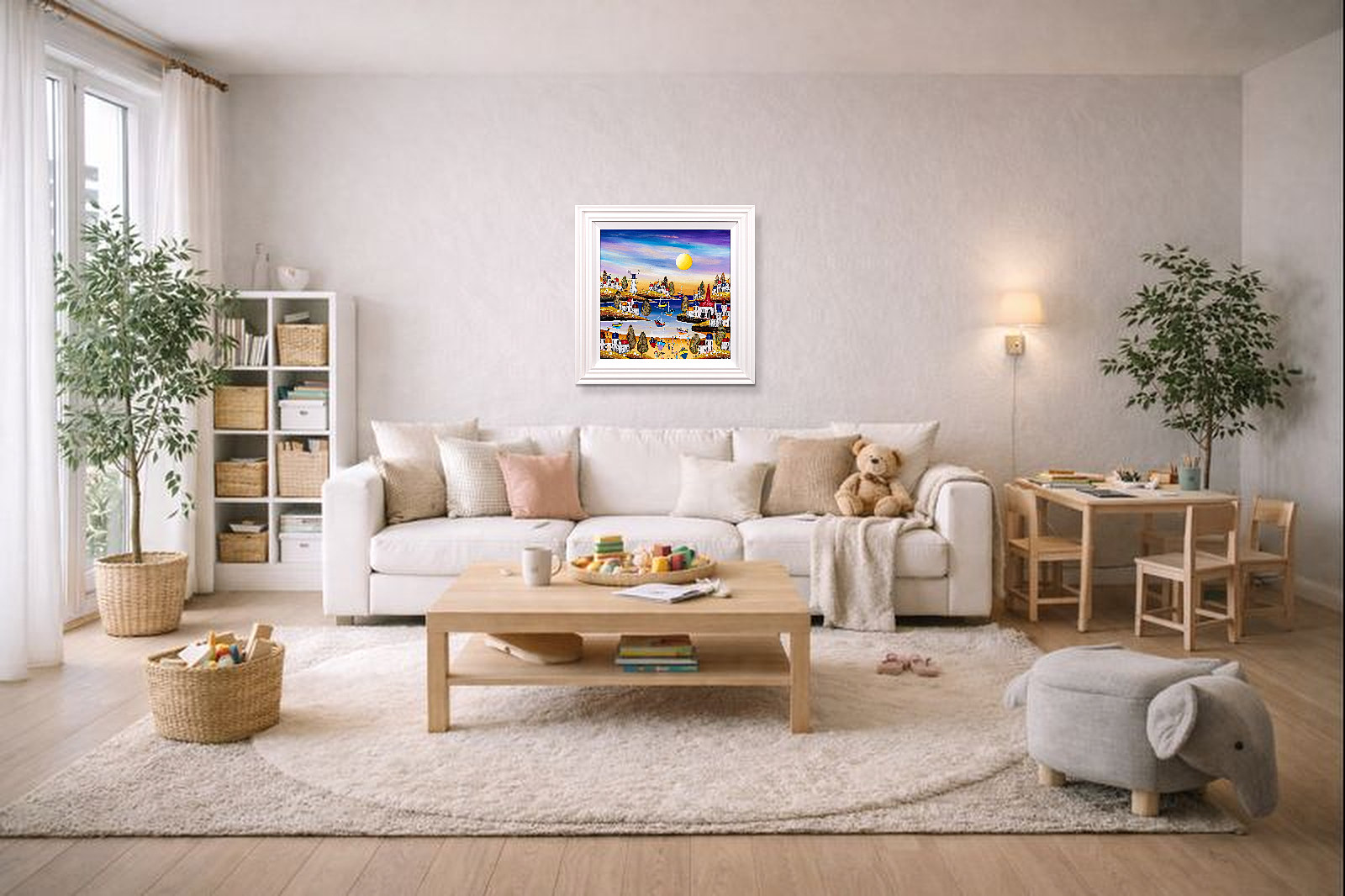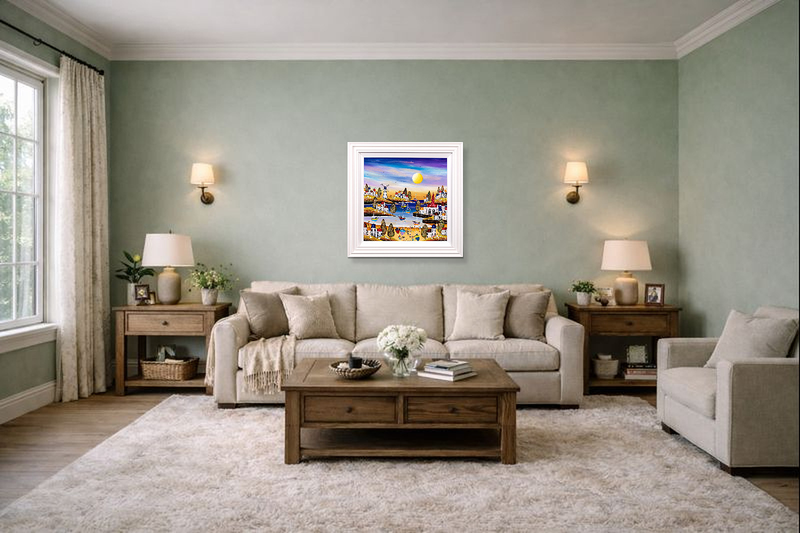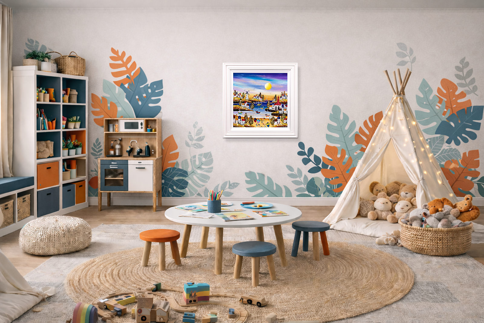 Original beach painting in the fun naïve art style of artist Rozanne Bell. This painting is finished with resin to make the colours truly pop! Complemented by a white slip and sculpted white frame as shown and ready to display on your wall.