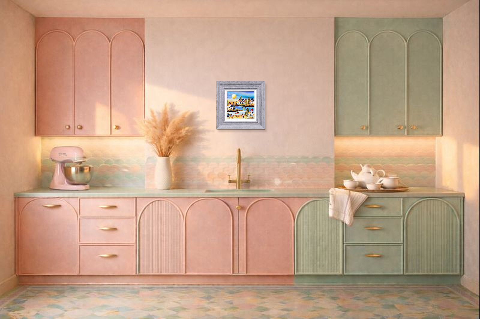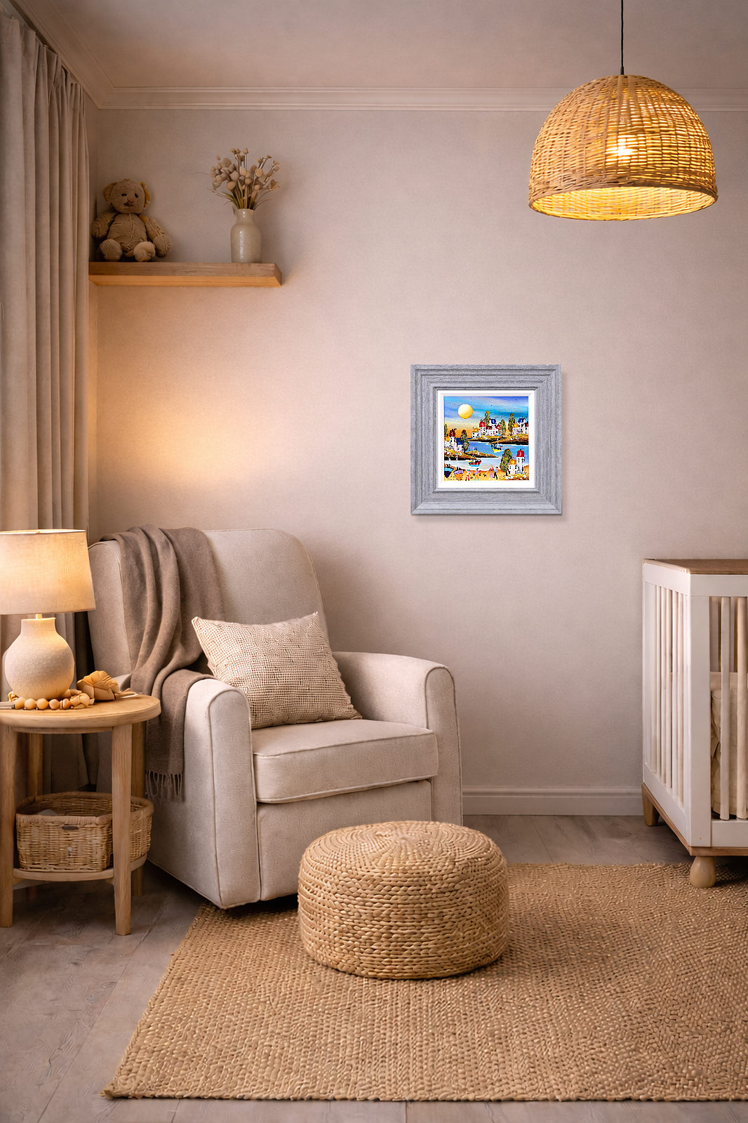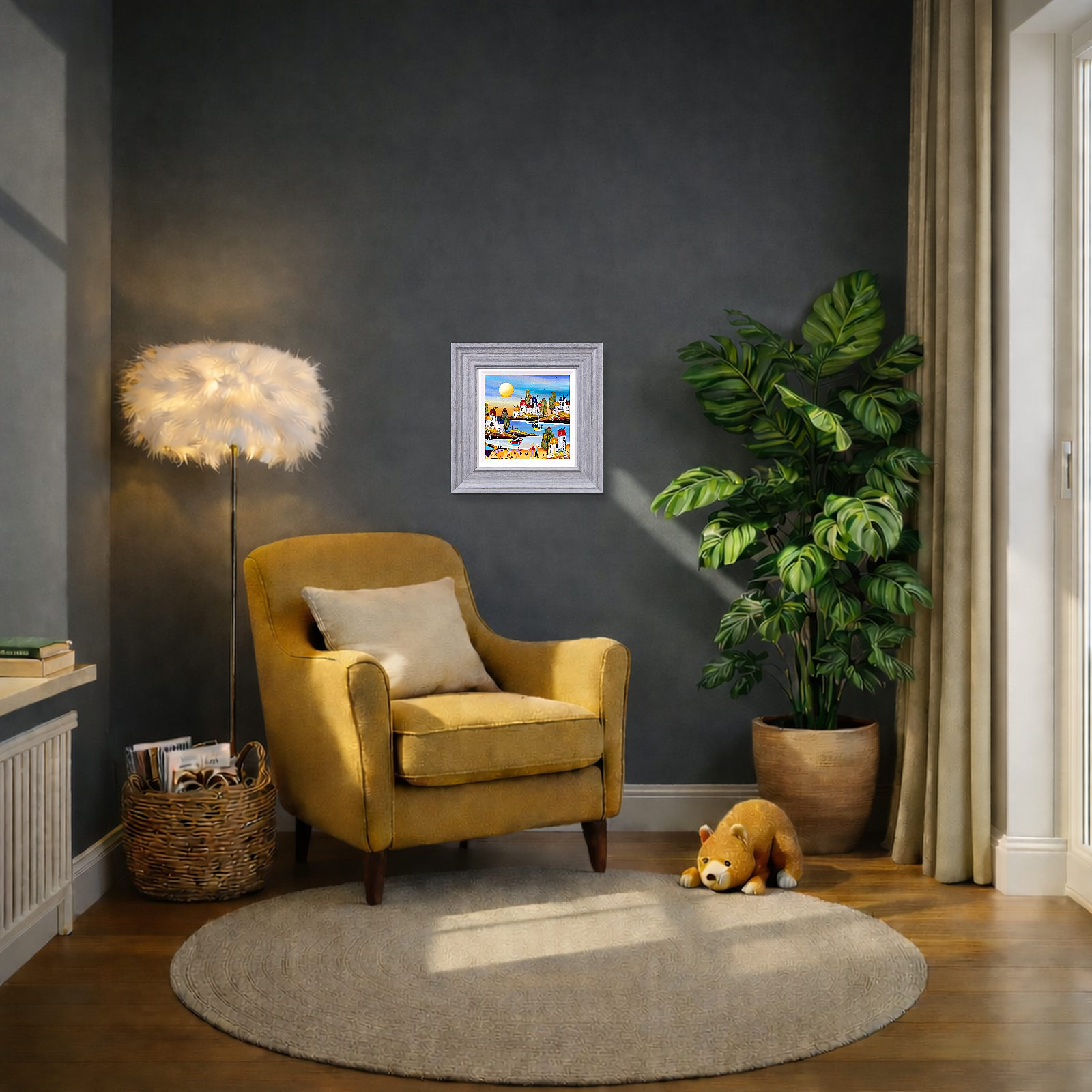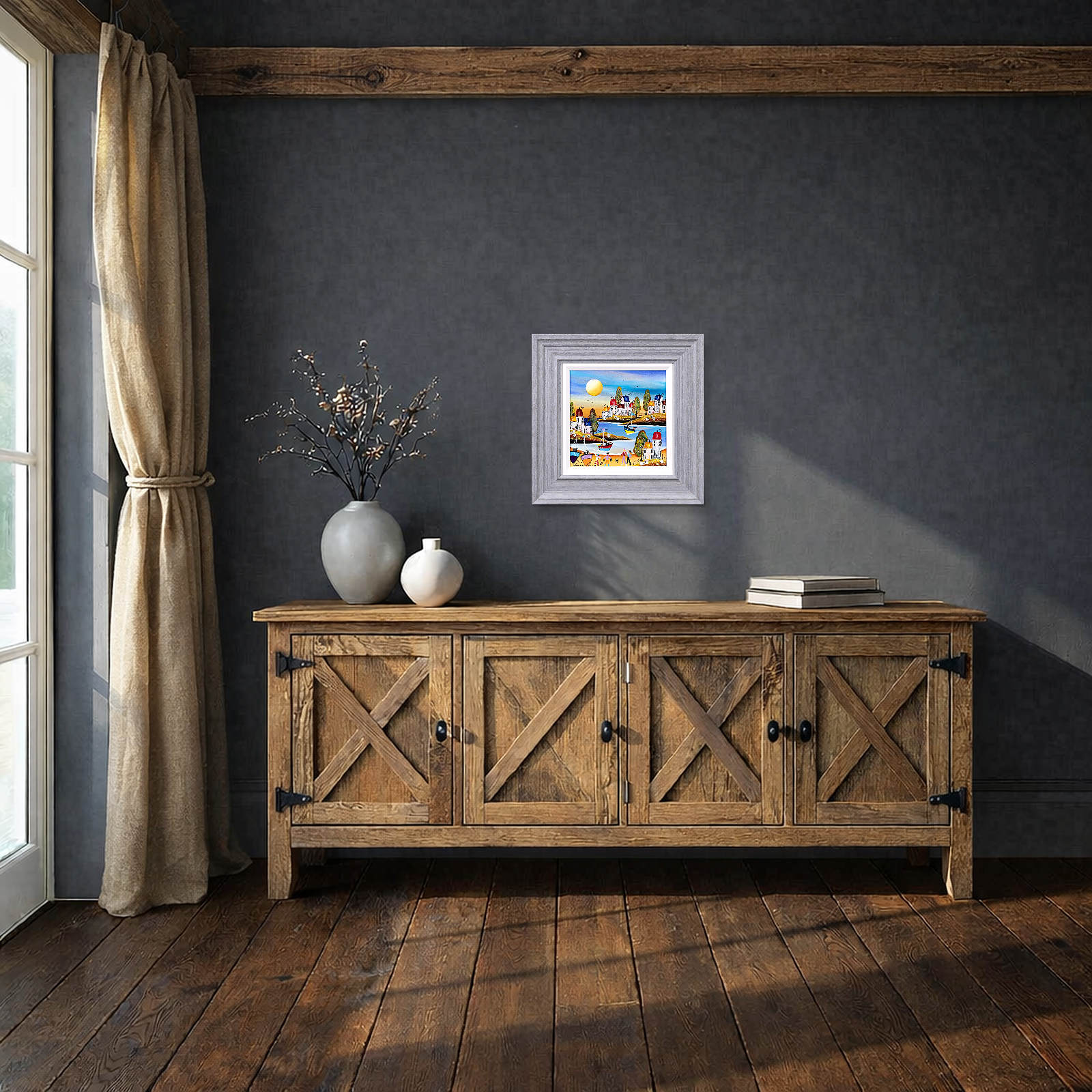 Original beach painting in the fun naïve art style of artist Rozanne Bell. This painting is finished with resin to make the colours truly pop! Complemented by a white slip and grey/blue frame as shown and ready to display on your wall.