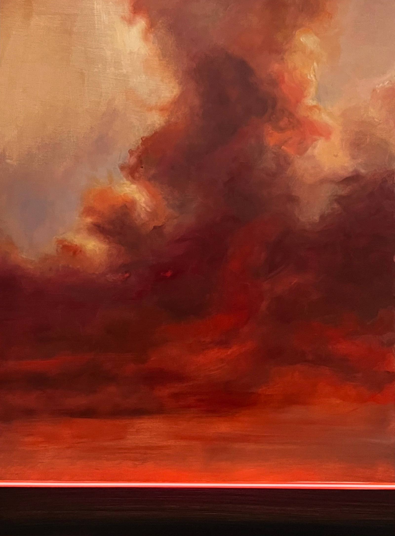 The exploration of materials is an essential part of Rubén’s artistic approach. His works combine acrylic, oil, spray, and airbrushing to create layers of depth and unique atmospheric effects. In many pieces, he dilutes the paint until it becomes almost liquid glazes, achieving transparencies and colour transitions that never repeat, giving each work an unrepeatable character.