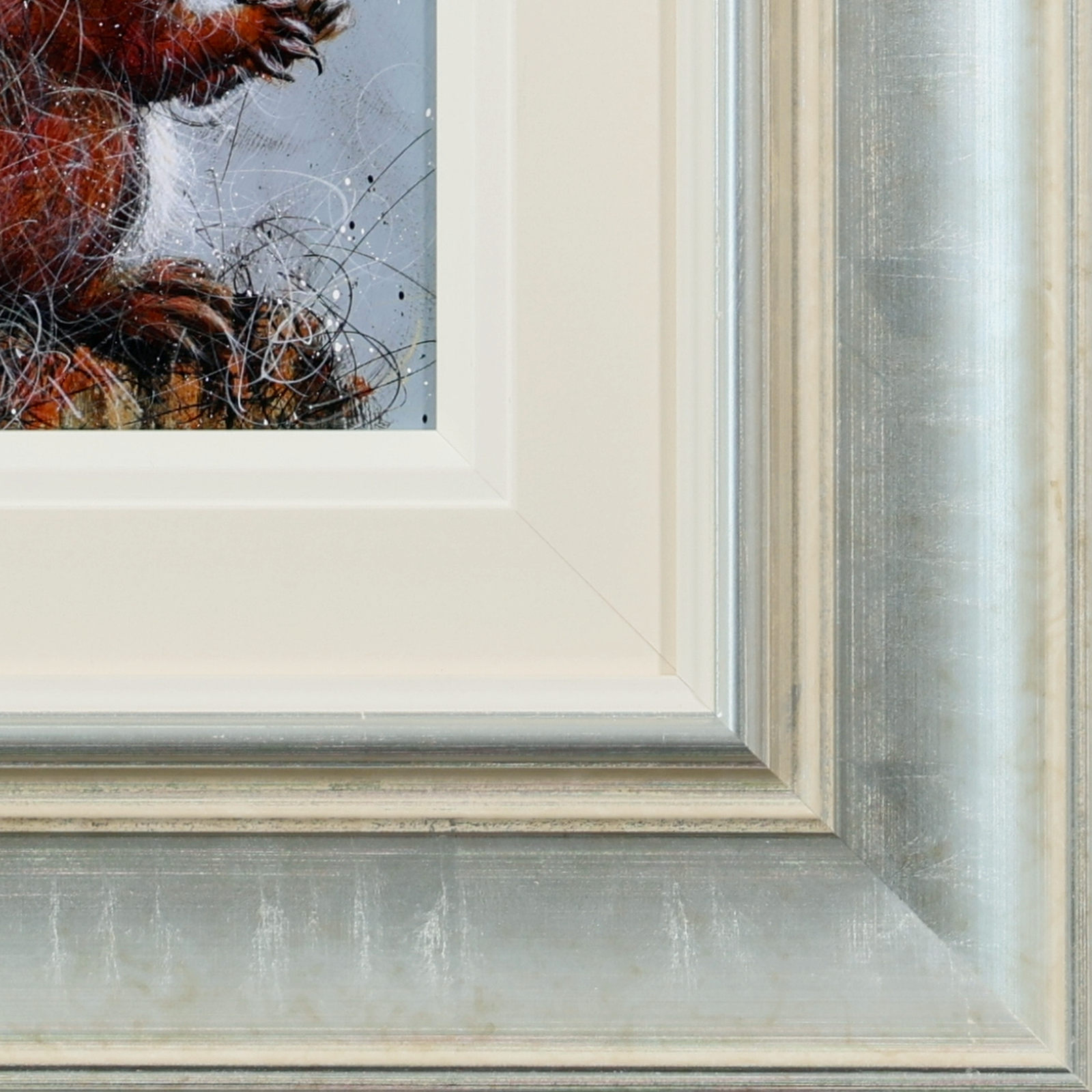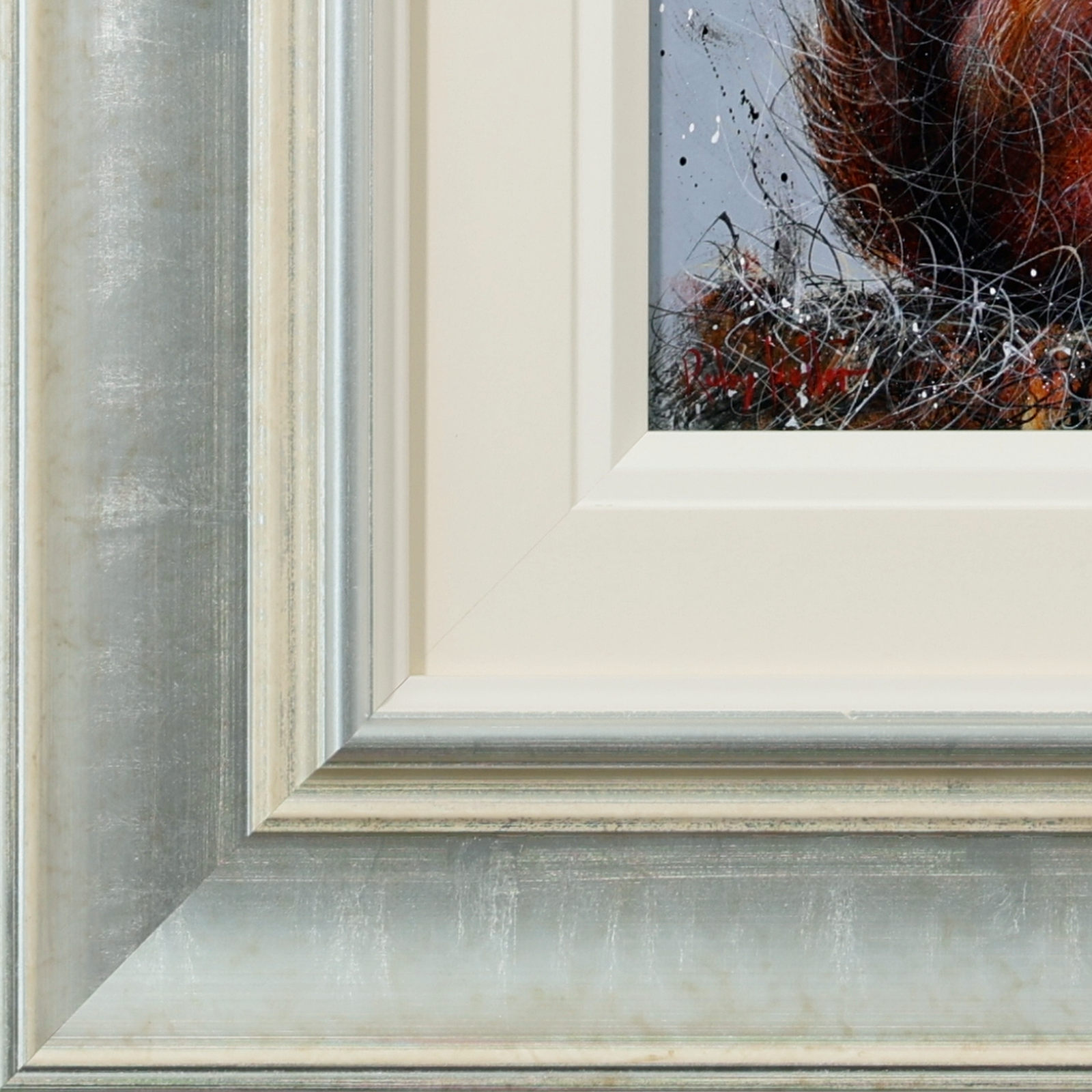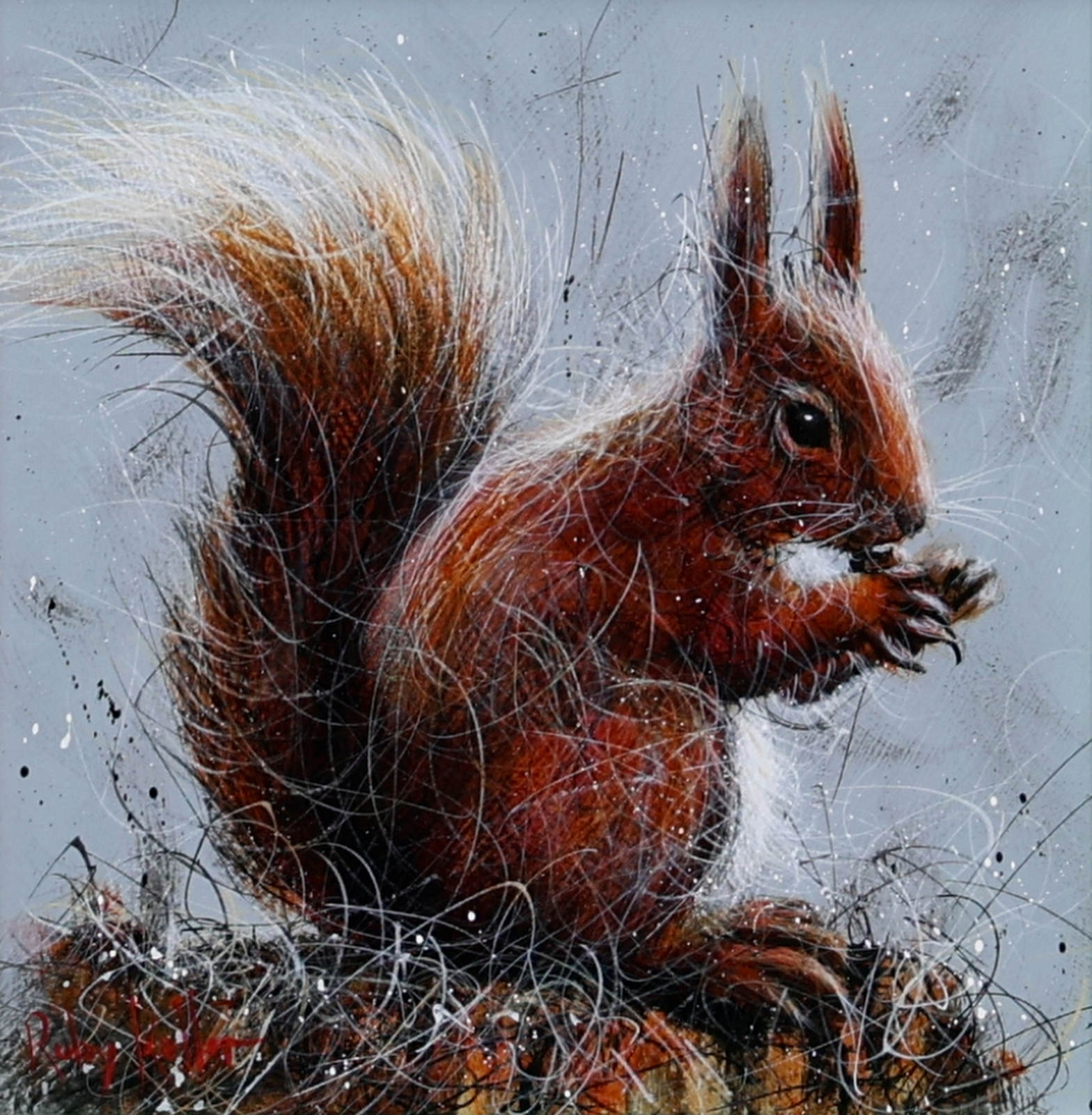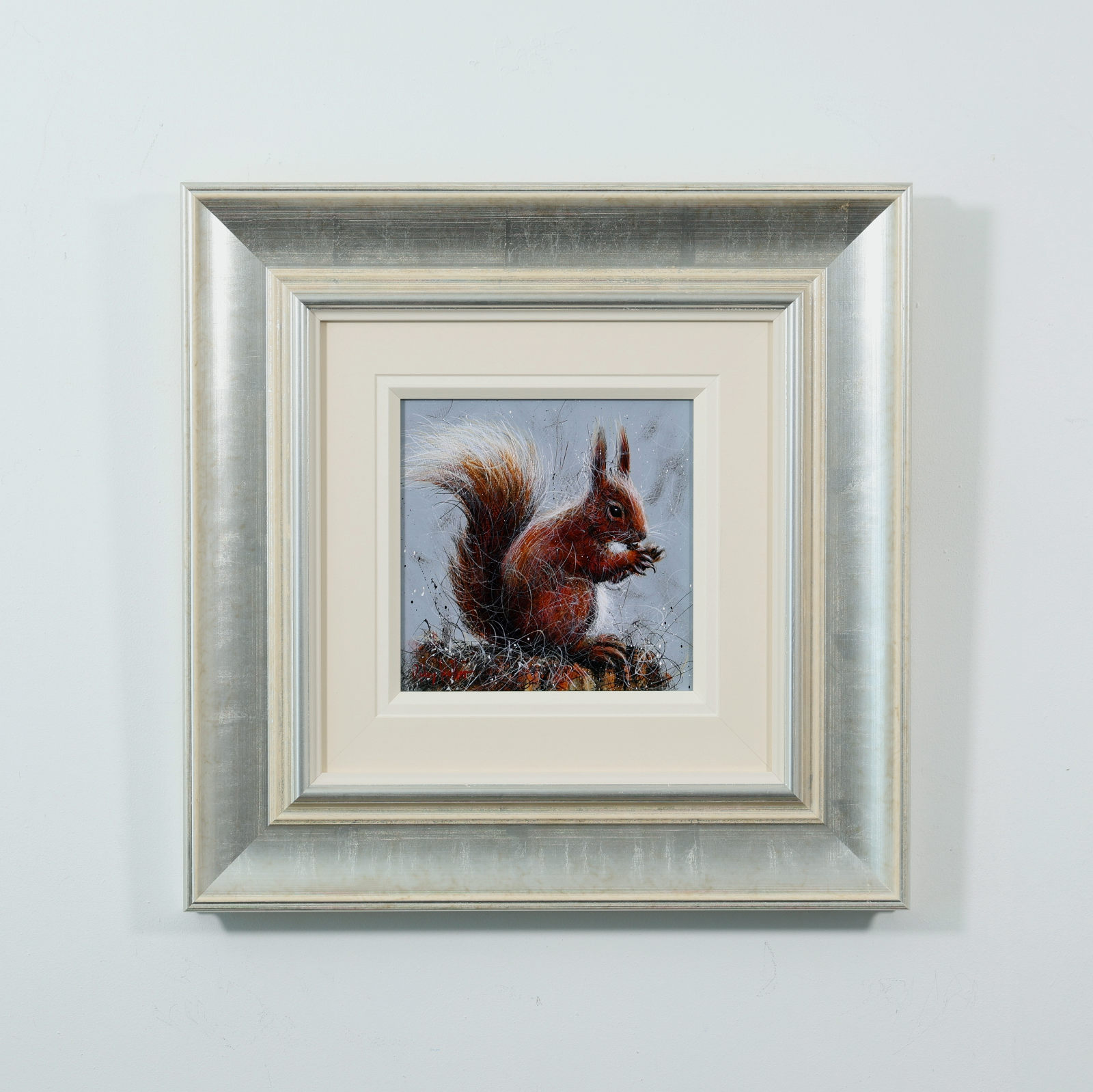 A furry red squirrel painted in Ruby Keller’s loose and evocative style. Framed with a wide white slip and beautiful silver frame as shown and ready to hang.