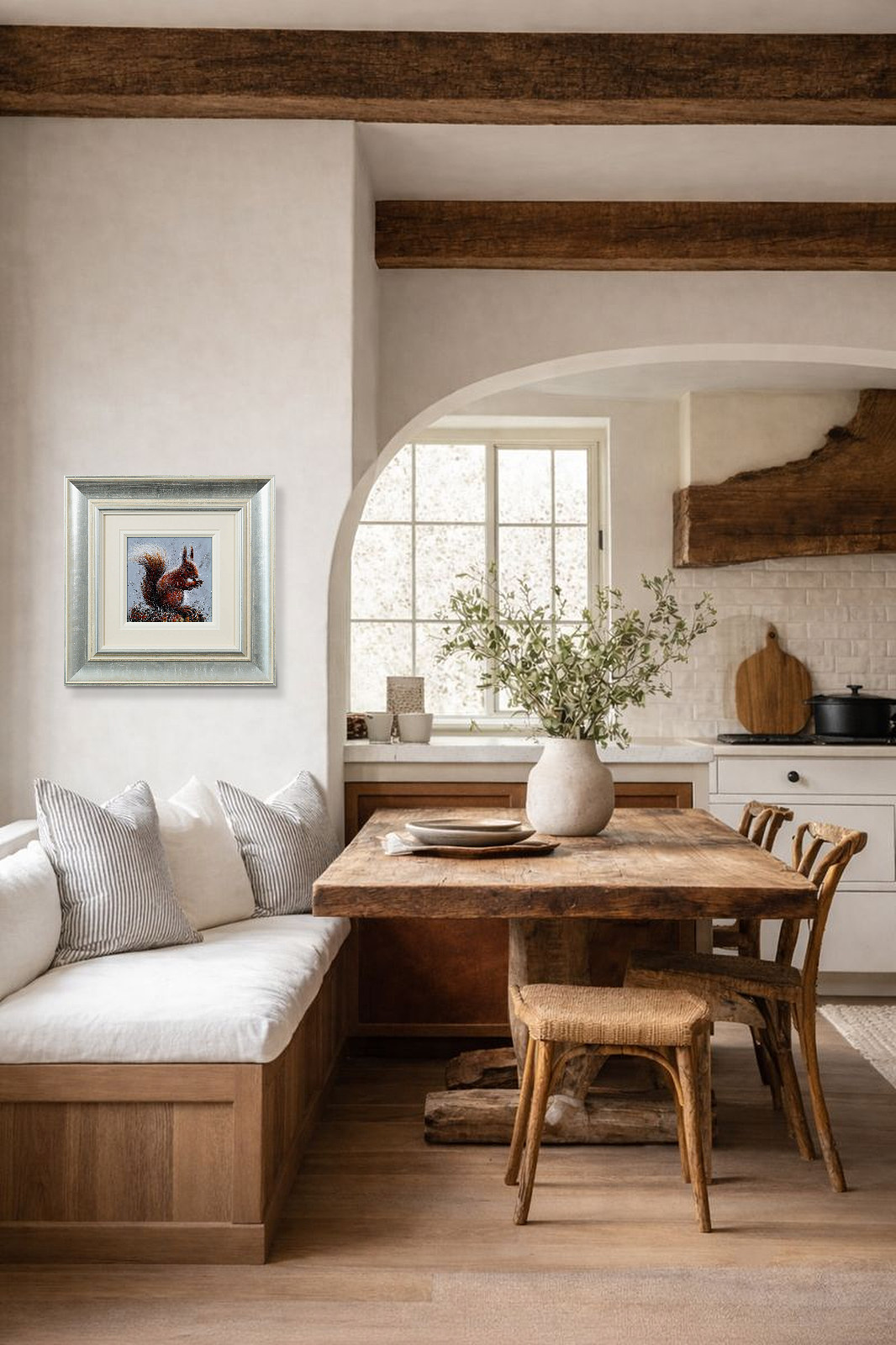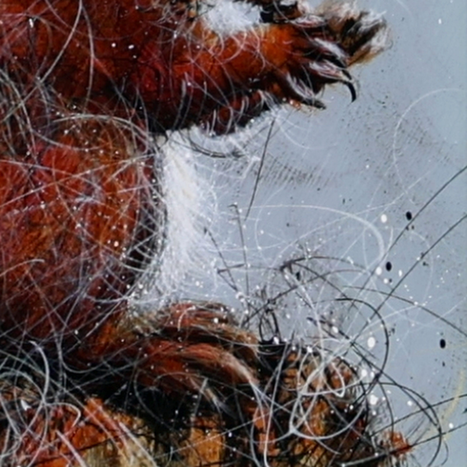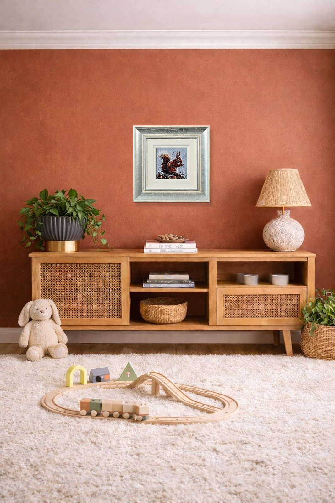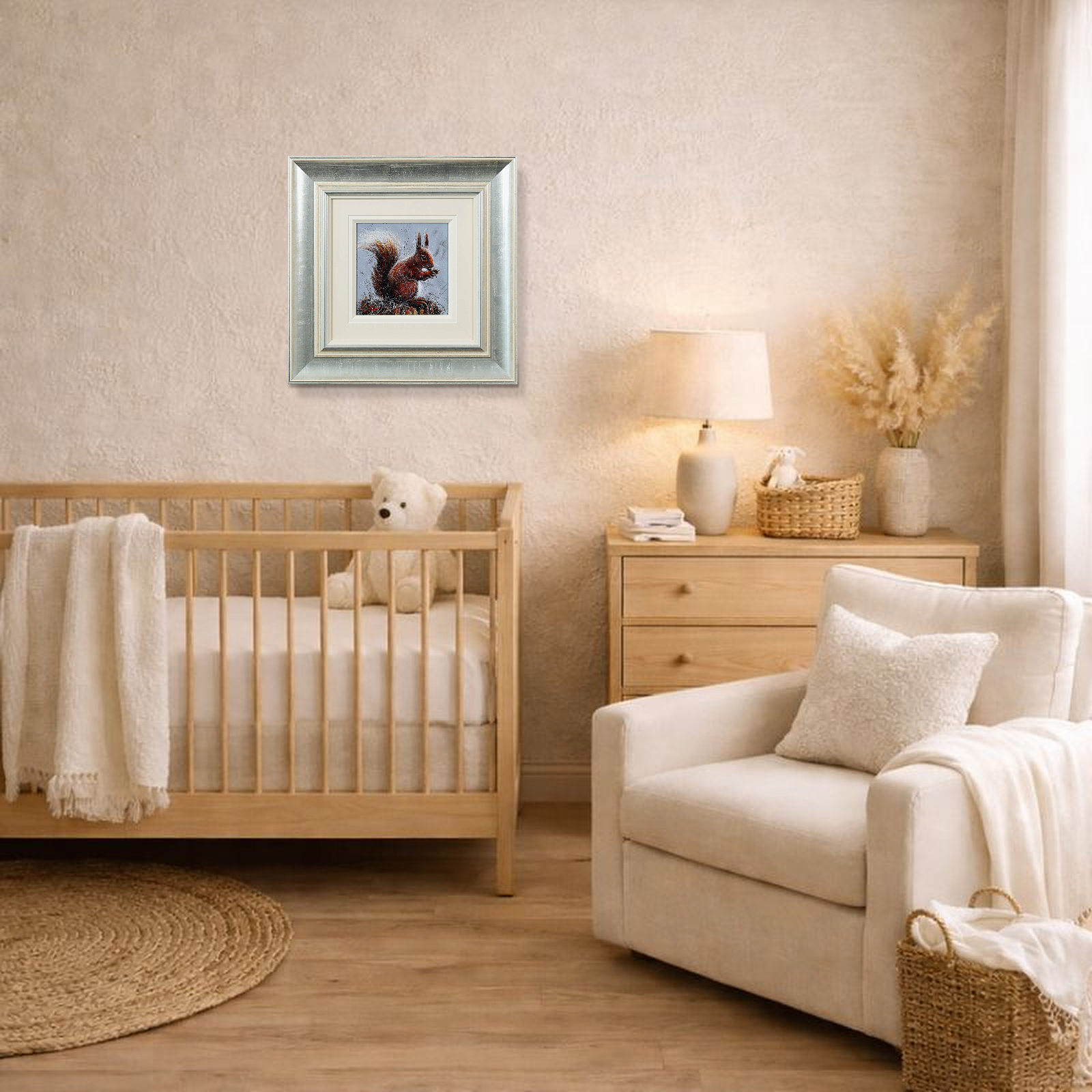A furry red squirrel painted in Ruby Keller’s loose and evocative style. Framed with a wide white slip and beautiful silver frame as shown and ready to hang.